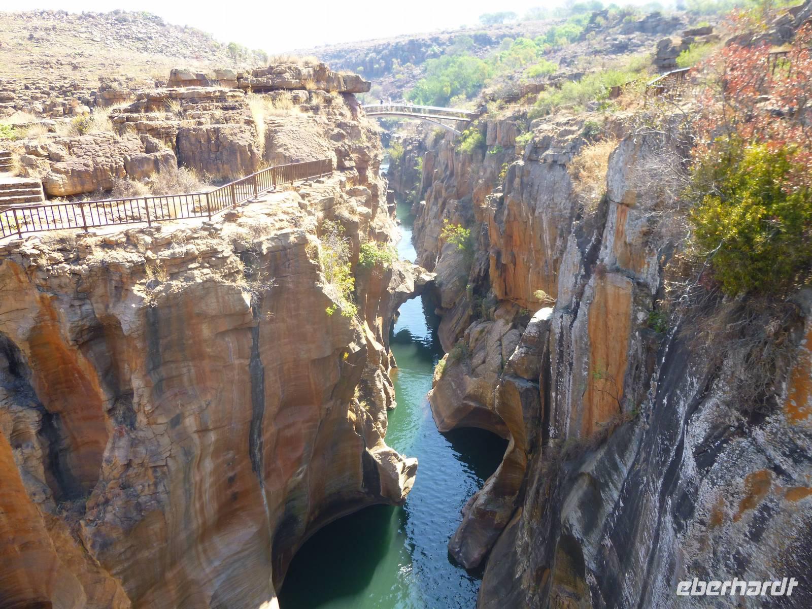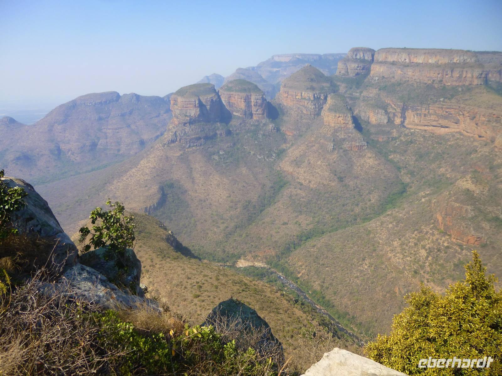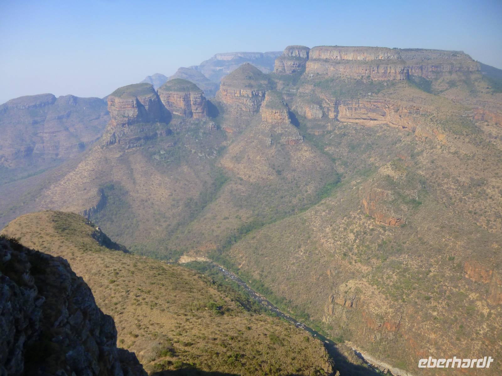 Zunächst unternahmen wir einen Abstecher nach Pilgrim's Rest, dem kleinen Goldgräberstädtchen und bummelten wir über die historische Main Road. Nach einer Mittagspause bei Harrie's in Graskop, wo wir süße oder herzhafte Pancakes schlemmten, fuhren wir zum Aussichtspunkt God's Window. Wirklich wie aus Gottes Fenster blickten wir auf das weite Land bis nach Mosambik. Bei Bourke's Luck Potholes machten wir ebenfalls Stop. Ein Spaziergang auf dem befestigten Weg führte uns durch die beeindruckende Gesteinsformation. Der spektakulärste Aussichtspunkt des Blyde River Canyon ist und bleibt jedoch der bei den Three Rondalves, wo wir natürlich als Fotomodelle posierten. Vom Hochplateau der Panoramaroute ging's nun wieder hinab. Am Abend erreichten wir unserer Hotel in Hazywiew unweit des Krüger-Nationalparks.
