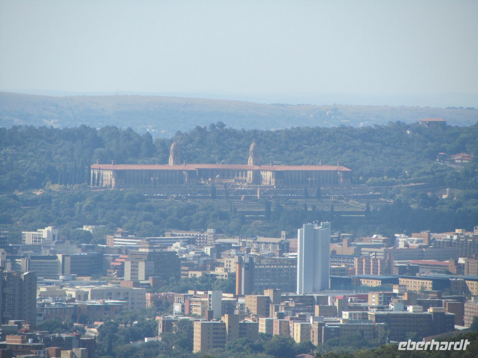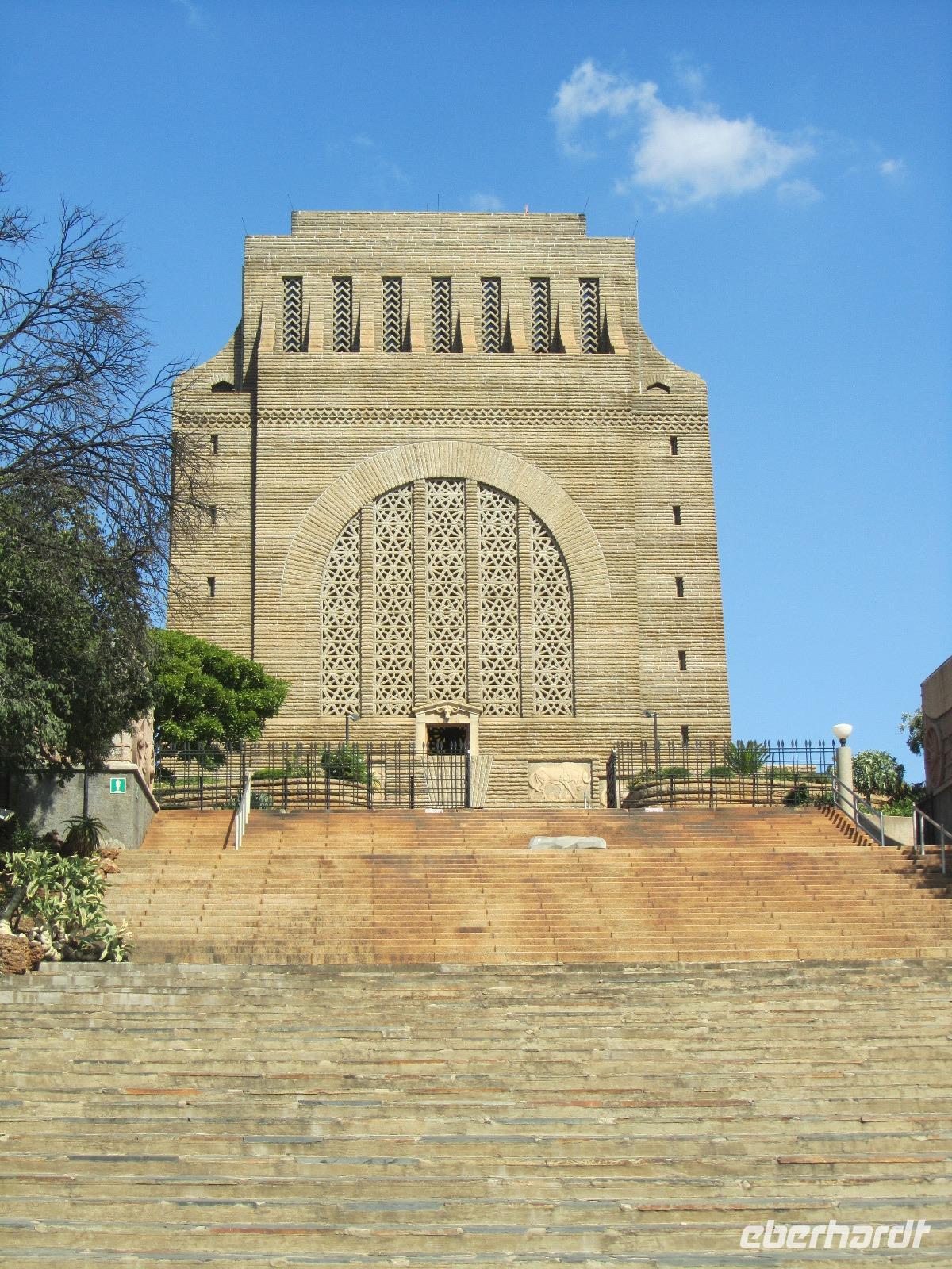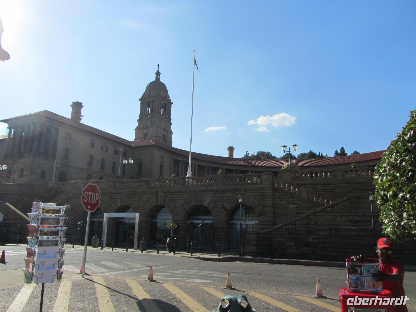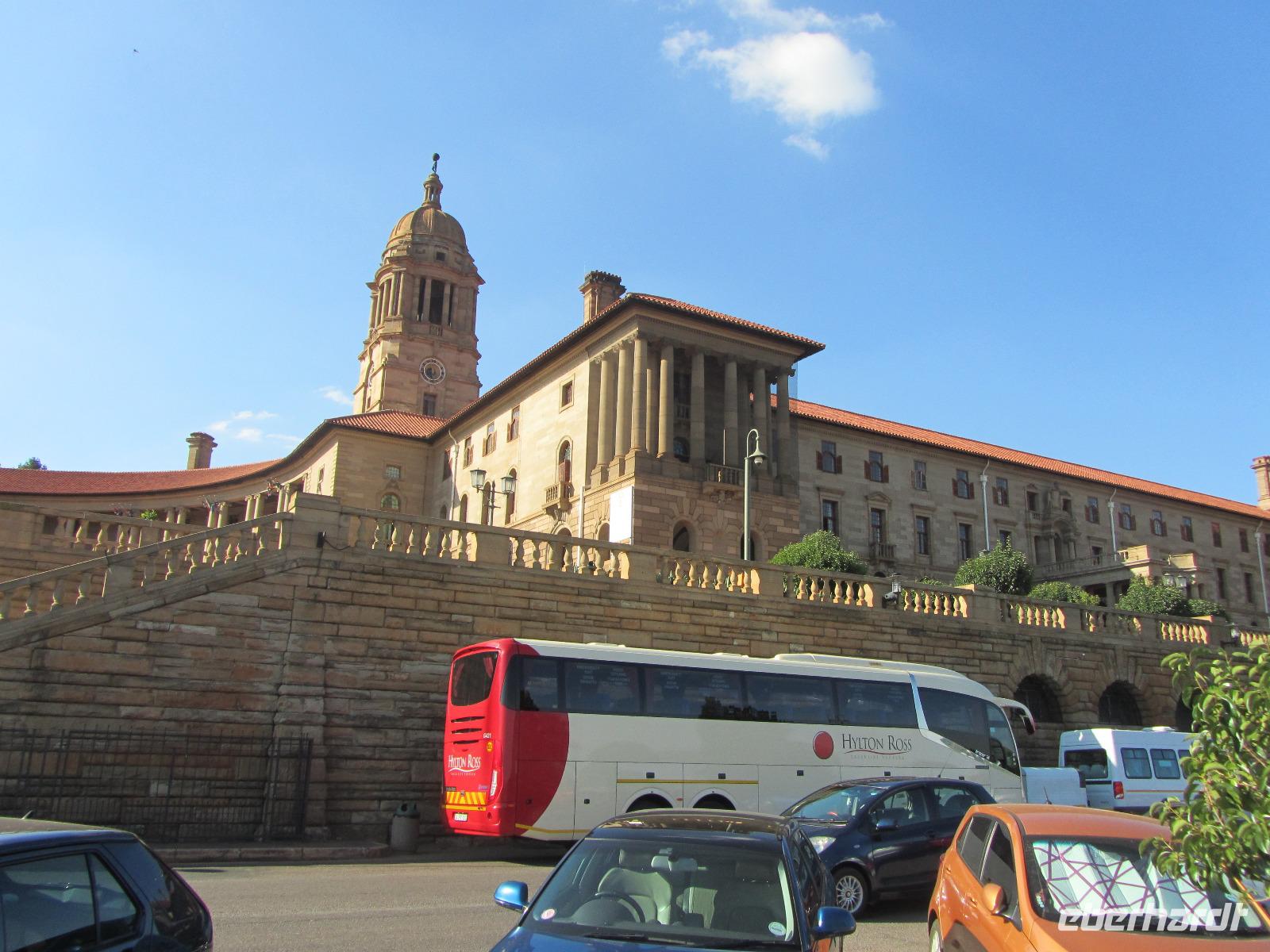 Heute stand mal wieder eine etwas längere Busfahrt auf unserem Programm, denn unser Ziel die Hauptstadt Pretoria lag knapp 500 Kilometer von unserem aktuellen Standort entfernt. Also fuhren wir los und kamen nach guten 5 Stunden Fahrt endlich in Pretoria an. Um die Stadt selbst gibt es derzeit die Diskussionen, ob sie nicht in Tshwane umbenannt werden sollte. Fred vermutet, dass dies auch bald passieren wird. Unseren ersten Halt machten wir am Vortrekker Monument. Das Denkmal erinnert ein wenig an das Völkerschlachtdenkmal von Leipzig mit seiner Bauweise. Die 11 Jahre, die man an dem Denkmal gebaut hat, erscheinen einem auf den ersten Blick sehr lang, doch bei einer genaueren Betrachtung, wird uns allen klar, warum hier so lang dran gearbeitet wurde. Das Vortrekker Monument, erinnert an die weißen Südafrikaner und an die wichtigste Schlacht der Buren, welche sie am 16.12.1838 gewannen. Die Bauweise erinnert nun jährlich am 16. Dezember daran, denn durch eine kleine Öffnung, fällt jedes Jahr die Sonne in das Innere des Monumentes und genau auf den Altar mit dem Schriftzug „Ons vir Jou, Suid Afrika" (Wir für Dich, Südafrika). Auf der Aussichtsplattform des Denkmals, kann man bei guter Sicht auch das rund 60 Kilometer entfernte Johannesburg sehen und wir hatten Glück, die Sicht war nicht die Beste, aber es reichte. Auf der anderen Seite gab es einen Rundum-Blick auf Pretoria selbst. Weiter ging es schließlich durch die Stadt, vorbei am Kruger House Museum, welches das Wohnhaus von dem einst hier lebenden Paul Krüger und seiner Familie war. Bevor wir aber zu unserem Hotel fuhren, ging es noch zum Union Buildings. Viele denken immer, dies sei das Parlamentsgebäude, doch dies ist es nicht. Das Union Buildings, ist nur mit Präsidenten- und Ministerbüros ausgestattet und für die Öffentlichkeit tabu. Interessant für die Besucher ist aber der Garten, hier lohnt sich vorbeizuschauen, nicht nur wegen einem erneuten Ausblick auf die Stadt, sondern auch die Statue Nelson Mandelas ist beeindruckt und von hoher Bedeutung.