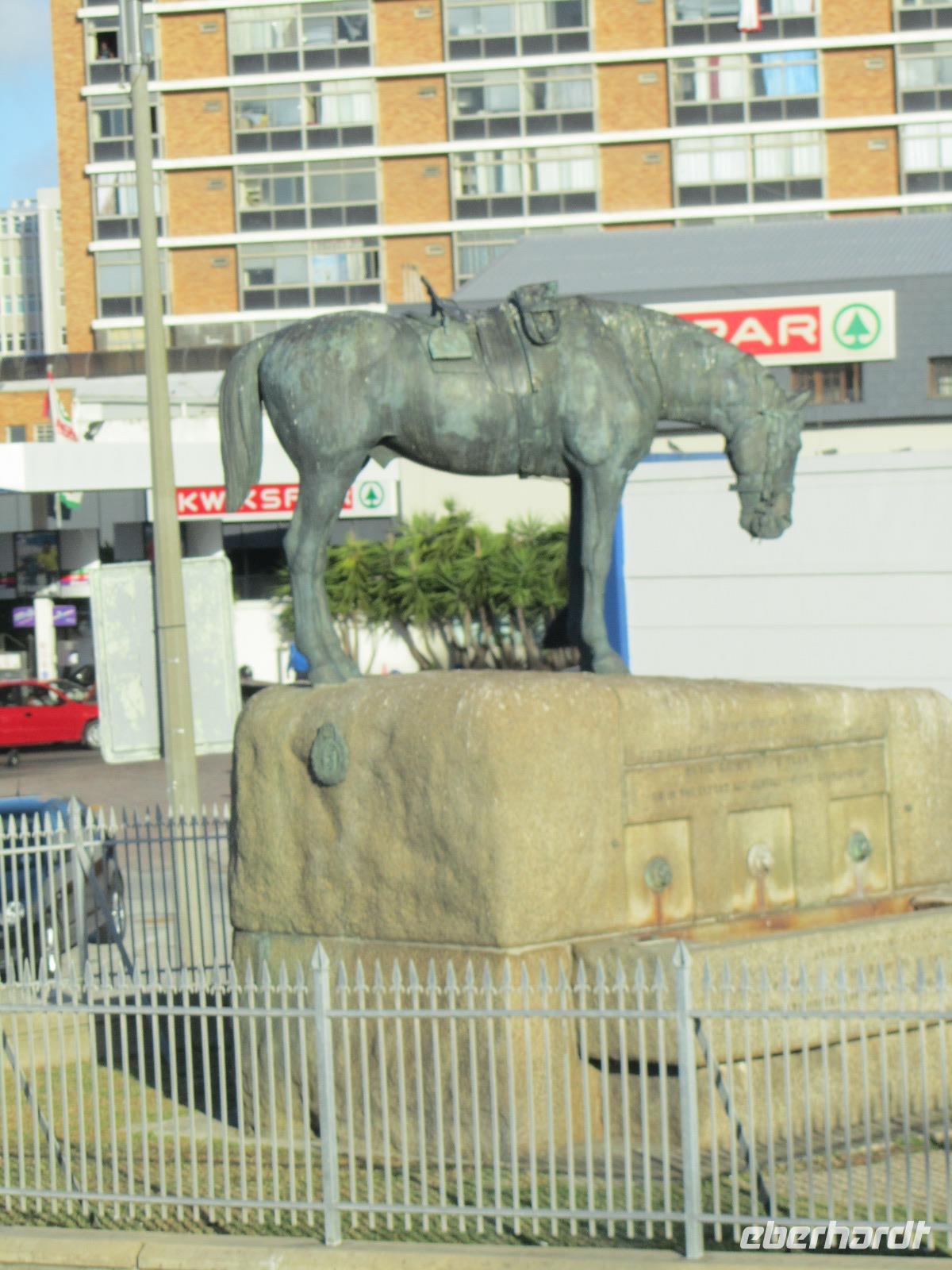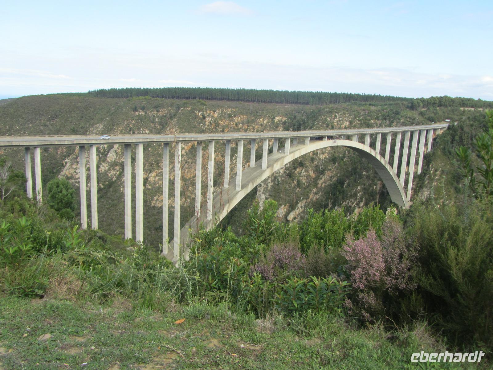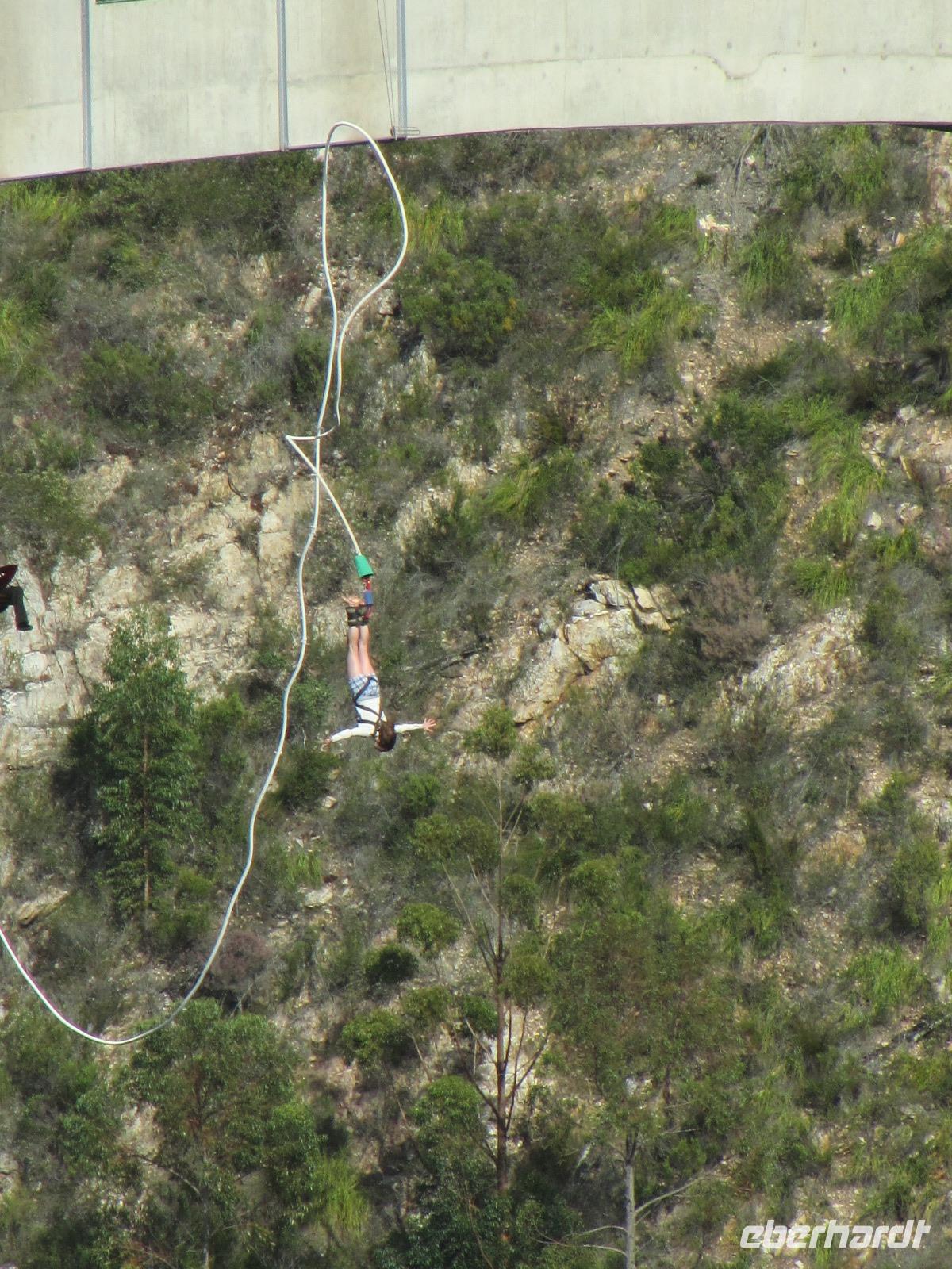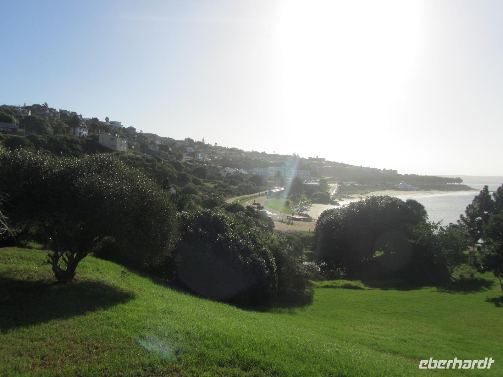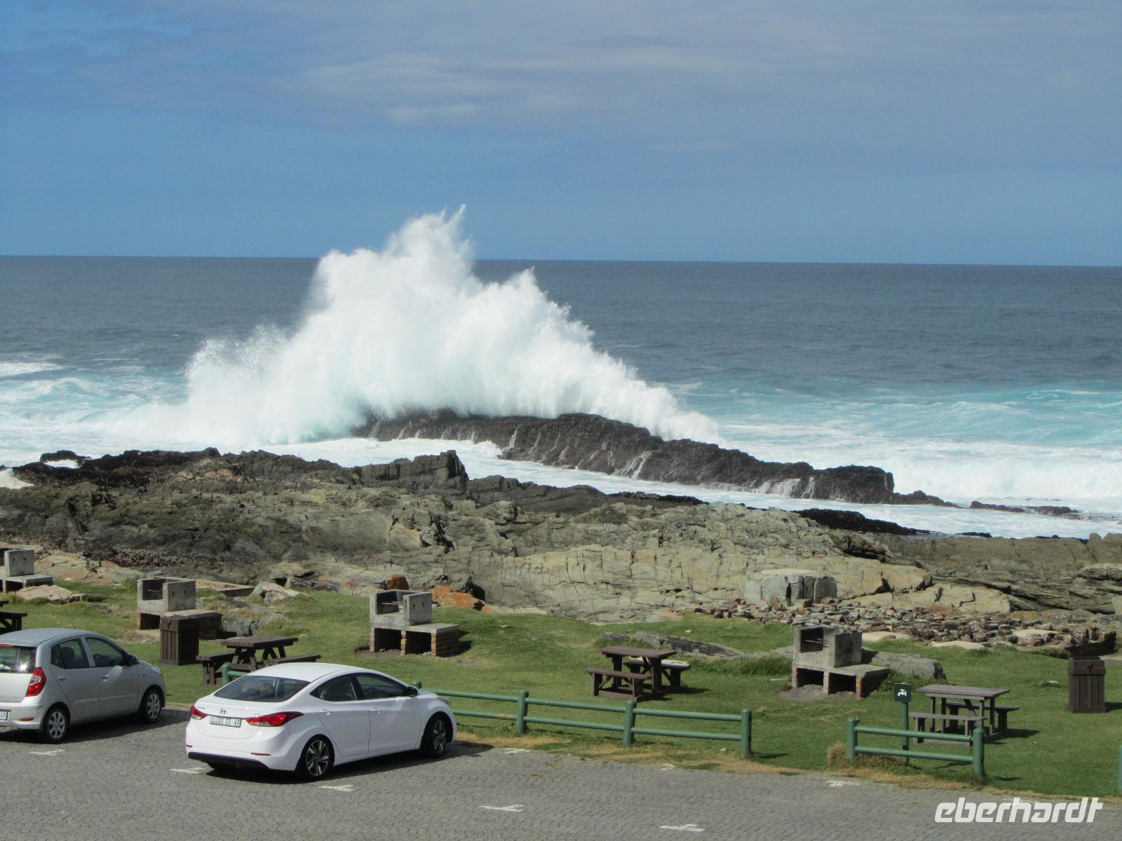 Auf ging es in einen weiteren spannenden Tag auf unserer Reise. Am Morgen gaben wir noch denen die wollten, die Möglichkeit die Füße in den Indischen Ozean zustecken. Wir machten einen ersten Halt an der Plettenberg Bay. Weiter führte uns der Weg in den Tsitsikamma National Park. Erster Halt war die Blue Crains Bridge, von der jeder der wollte einen Bungeesprung in 216 Meter Tiefe hätte wagen können. Nein, aus unserer Gruppe wollte keiner bzw. war es uns das Geld nicht wert. Es ist dann doch ein etwas preisintensives Vergnügen. Also fuhren wir weiter und unternahmen schließlich eine kleine Wanderung durch den „Urwald" direkt am Meer bis zu den Hängebrücken und der Mündung des Stormrivers in den Indischen Ozean. Wieder am Anfang angekommen, stärkten wir uns bei einem kleinen Picknick direkt im Nationalpark. Bevor wir dann endlich Kurs auf Port Elizabeth nahmen, hielten wir noch am „Big Tree" an. Der 1000 Jahre alte Baum, ist 37 Meter hoch. Schon schwierig für uns ihn komplett vor die Linse der Kamera zu bekommen. Doch wir wollten nach Port Elizabeth und das erreichten wir auch am späten Nachmittag. Ehe wir ins Hotel fuhren, machten wir noch Halt an der Pyramide zu Ehren von Elizabeth Donkin.