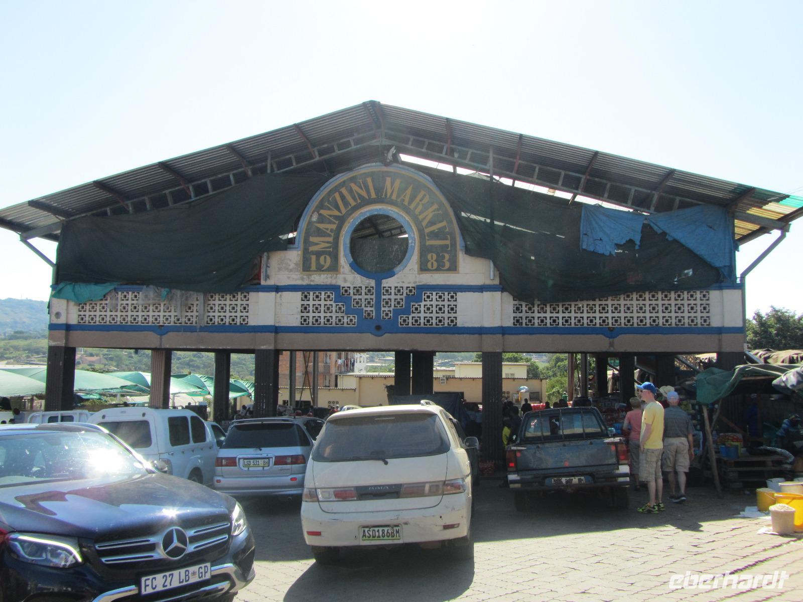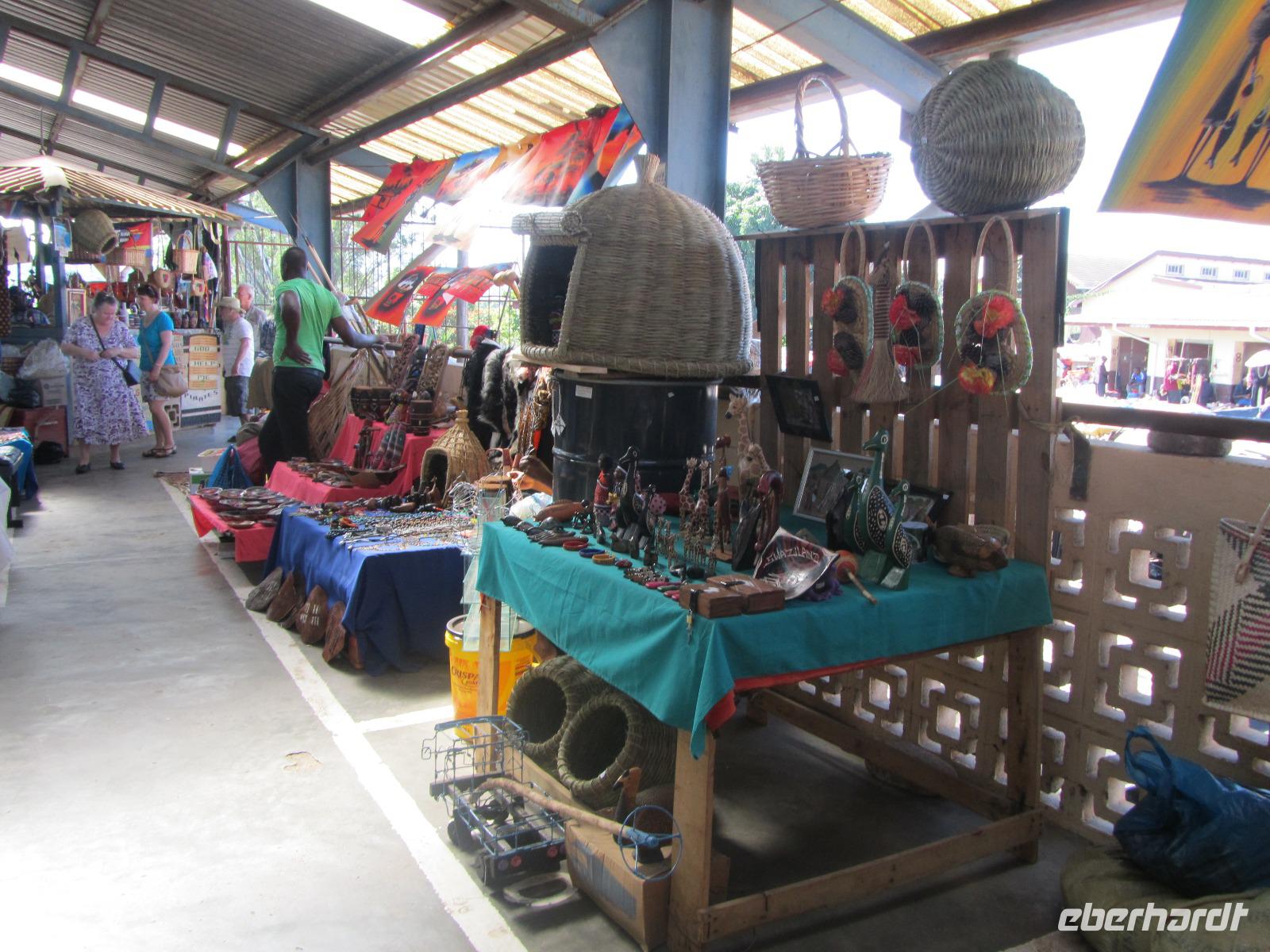 Herzlich Willkommen im kleinsten Staat auf dem afrikanischen Kontinent. Unsere Fahrt führte uns heute ins Swaziland. Das Königreich Swaziland begrüßte uns mit purem Sonnenschein und sehr freundlichen Menschen. Während unserer Busfahrt zu unserem ersten Halt dem Swazi-Markt sahen wir verschiedene Pflanzen, von Ananas bis Zuckerrohr war vieles dabei. Trotz der hier herrschenden Trockenheit konnten die Felder bewässert werden. Am Swazi-Markt angekommen, konnten wir die Zeit beim Stöbern vertreiben. Es gab viel Handarbeit, Tiere aus Holz oder Perlenketten, Bilder und Holzteller. Einige kauften auf dem Markt frisches Obst, wobei man hier den Leuten erst erklären musste, dass wir das Obst nicht stiegen- und eimerweise kaufen wollten, sondern nur Einzelne. Bei manchen Händlern klappte das, andere wollten uns hingegen nichts verkaufen.