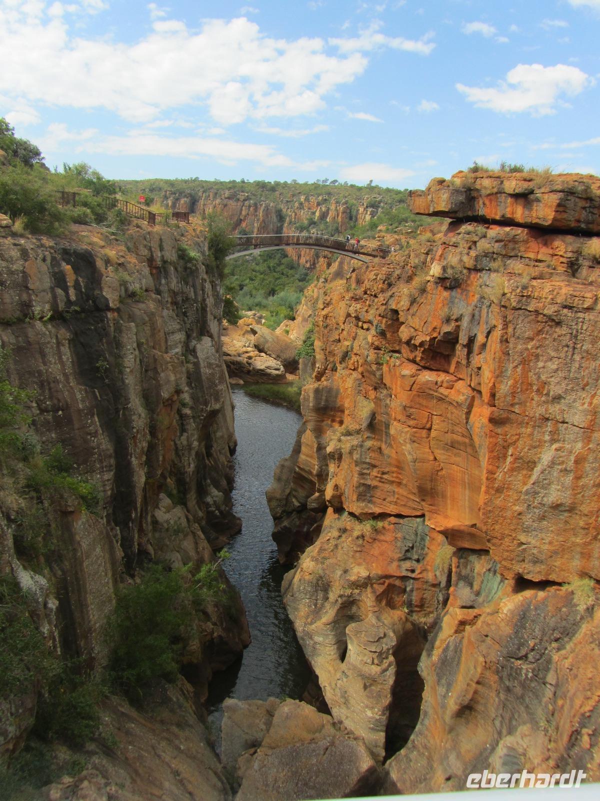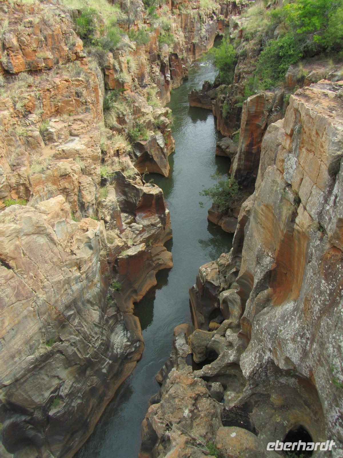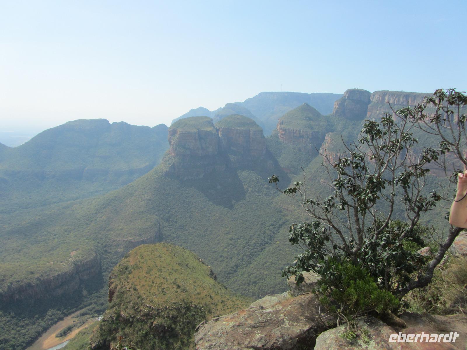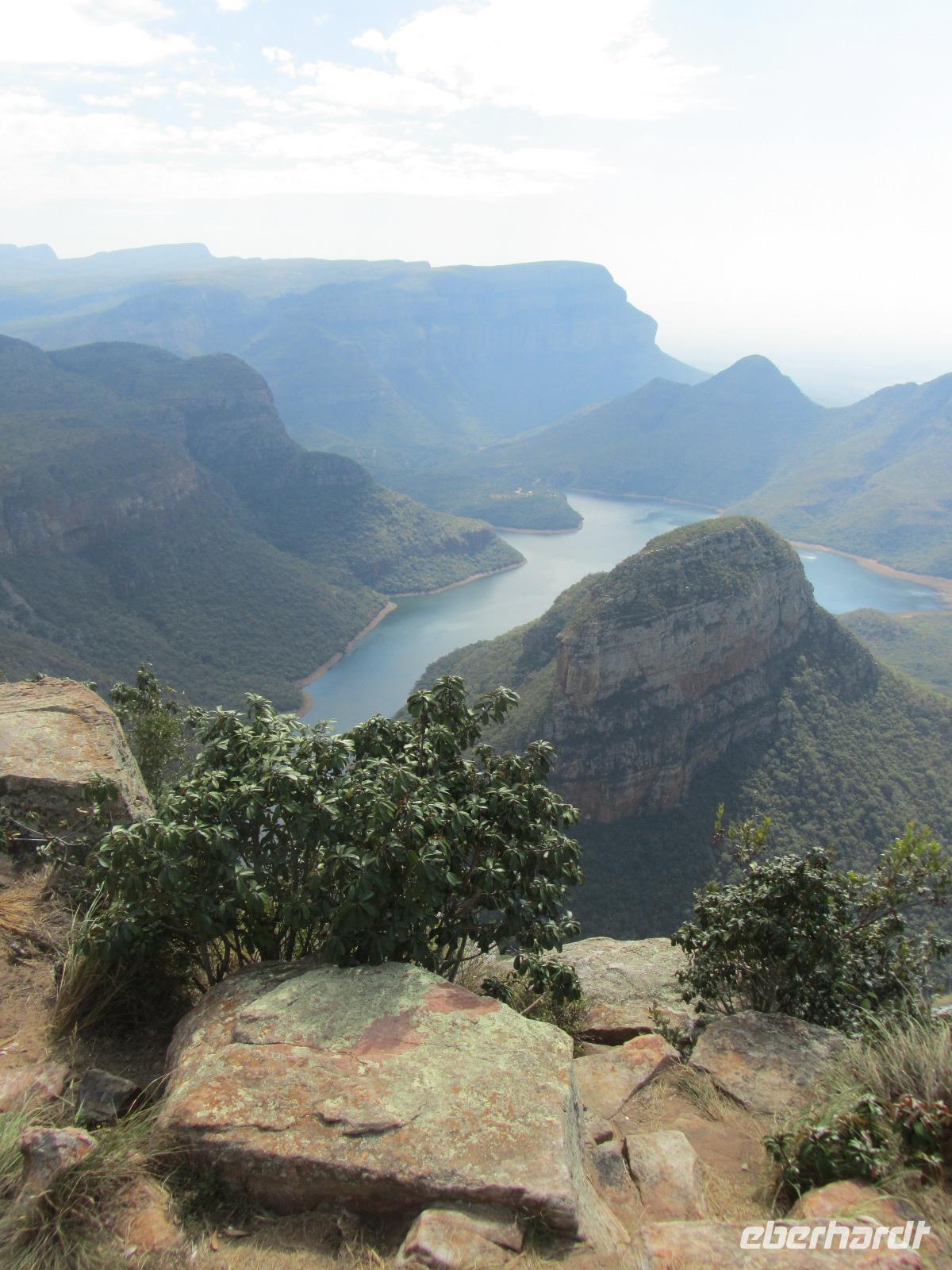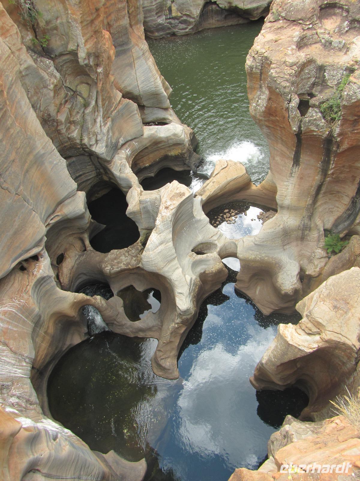 Doch unser eigentliches Ziel war das Naturreservat des Blyde Rivers. Im Norden angefangen besuchten wir zuerst die „Three Rondavels", welches Felsformationen in Form der afrikanischen Rundhütten darstellten. Bei Fotografieren vor dem Stausee und der Formationen mussten wir allerdings aufpassen, dass wir nicht die steilen Felsen hinunterfielen. Doch durch einen gewissen Respekt vor der Höhe blieben wir alle in sicherer Entfernung. Weiter mit dem Bus nach „Bourke's Luck Potholes", hier gibt es einen Weg hinab zum Fluss um zu beobachten wie die Flüsse Treur und Blyde River ineinander überfließen. Durch die Kraft des Wassers konnten wir von den Brücken aus die Löcher sehen, welche im Gestein hinterlassen wurden.