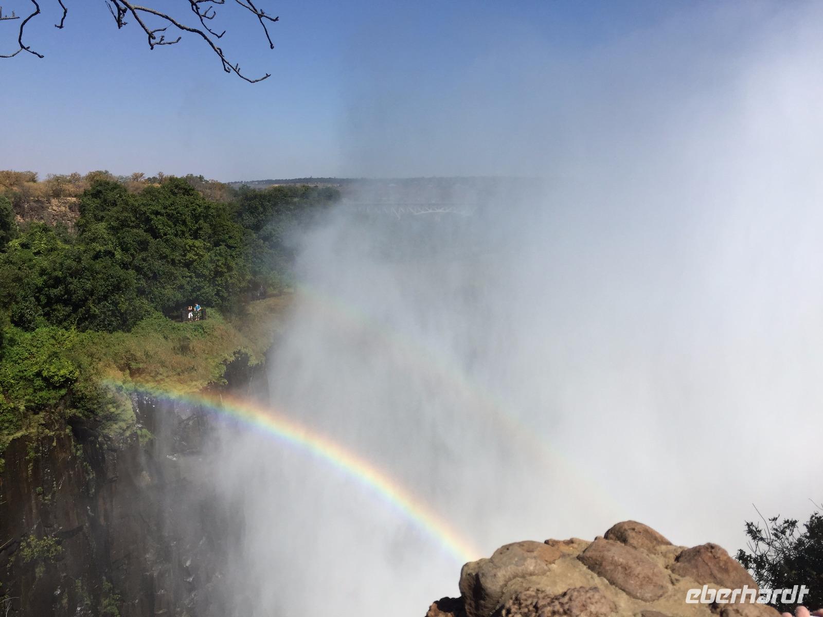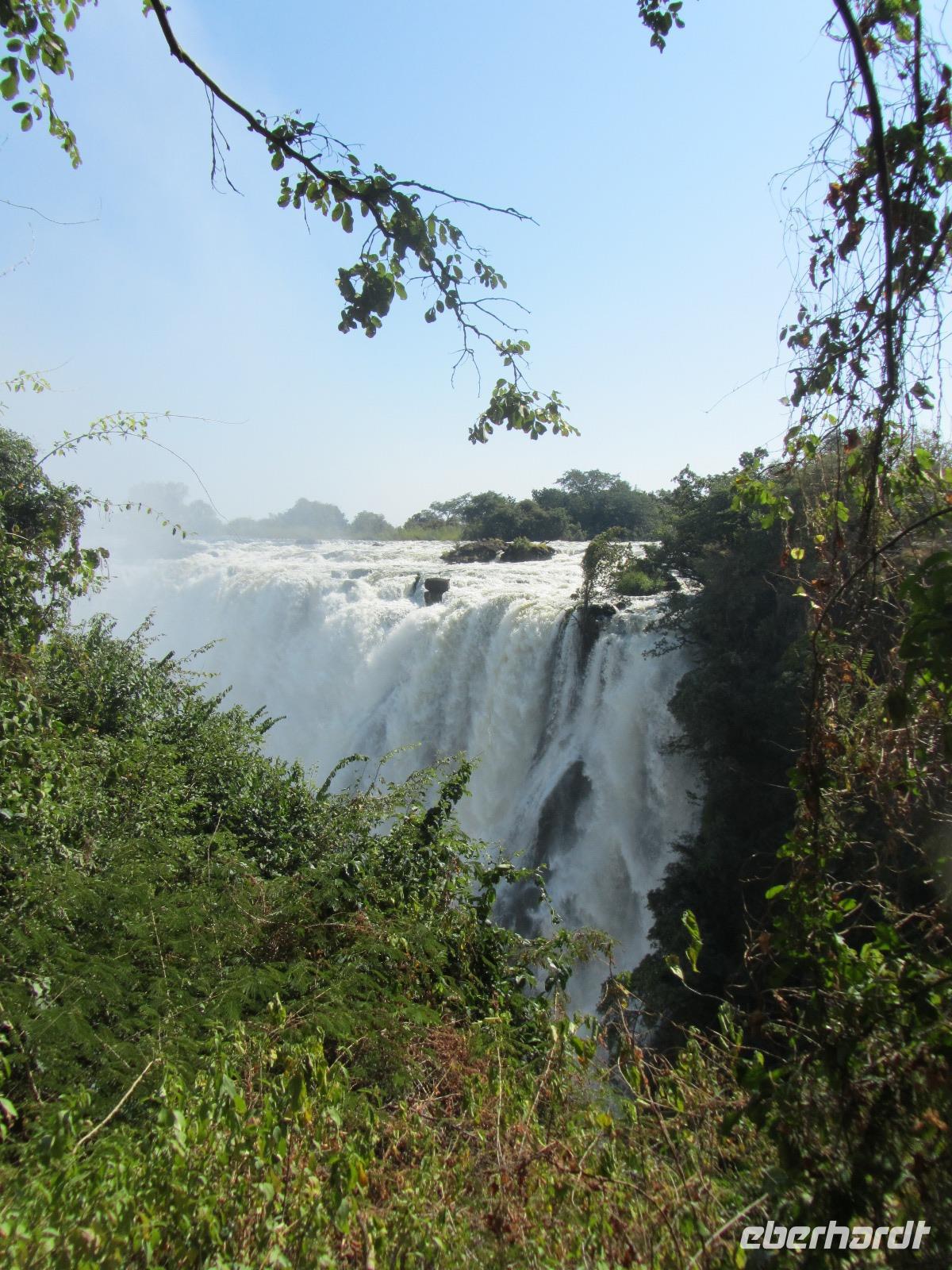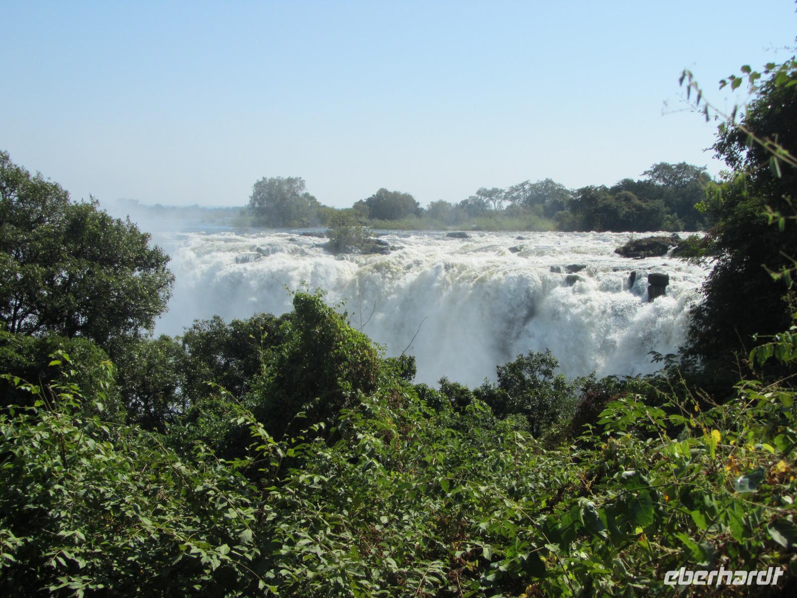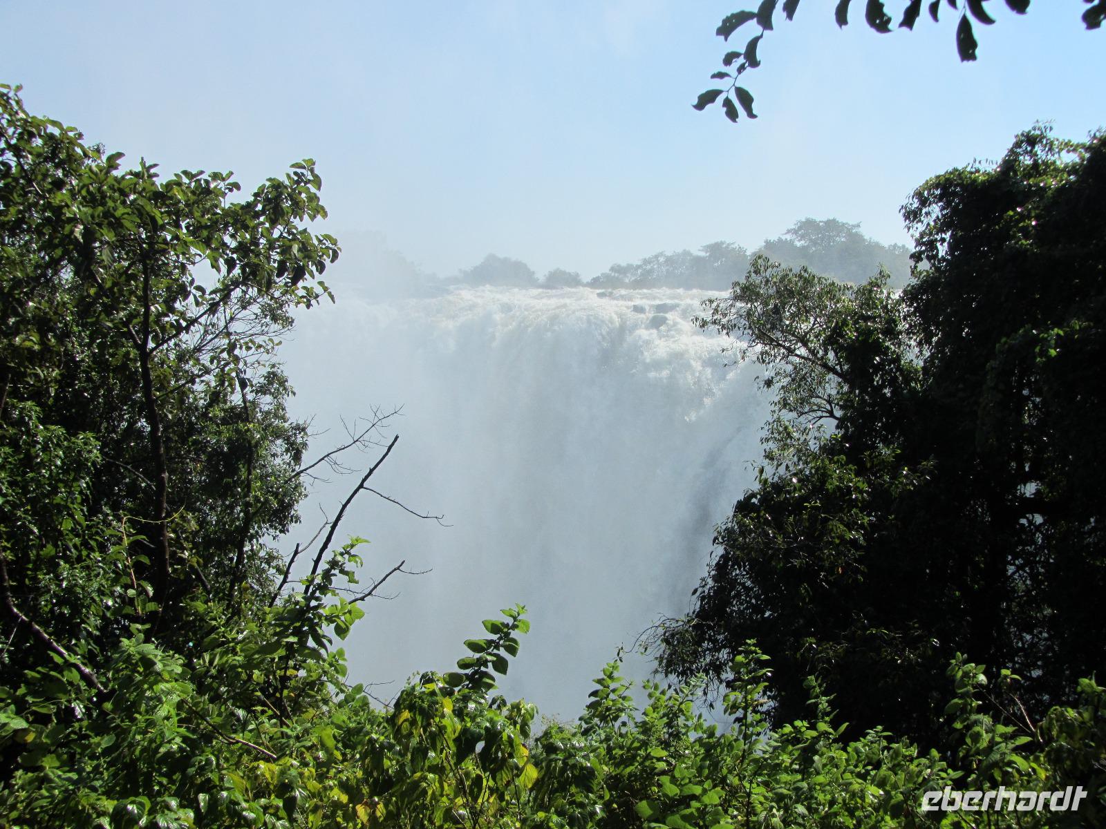 Heute war ein entspanntes Programm, gemütlich nach dem Frühstück traf ich mich, mit denen die wollten an der Rezeption um schließlich gemeinsam zu den Victoria Wasserfällen zugehen, welche in dieser Jahreszeit sehr gut gefüllt waren. Vom Hotel erreichten wir in wenigen Minuten den Grenzfluss Sambesi mit seinen dazugehörigen Wasserfällen. Wer konnte und wollte, zog hier lieber ein Regenponcho an und versteckte vor allem seine Kamera. Wir gehen ein ganzes Stück und schließlich konnten wir nichts mehr so richtig erkennen, weil von überall Wasser kam. Die Gischt der Wasserfälle war so stark, dass wir alle die keinen Poncho übergezogen hatten komplett nass waren. Doch das machte uns gar nichts aus, denn die Sonne schien bei herrlichen 29 Grad und so wurden wir wieder schnell trocken.