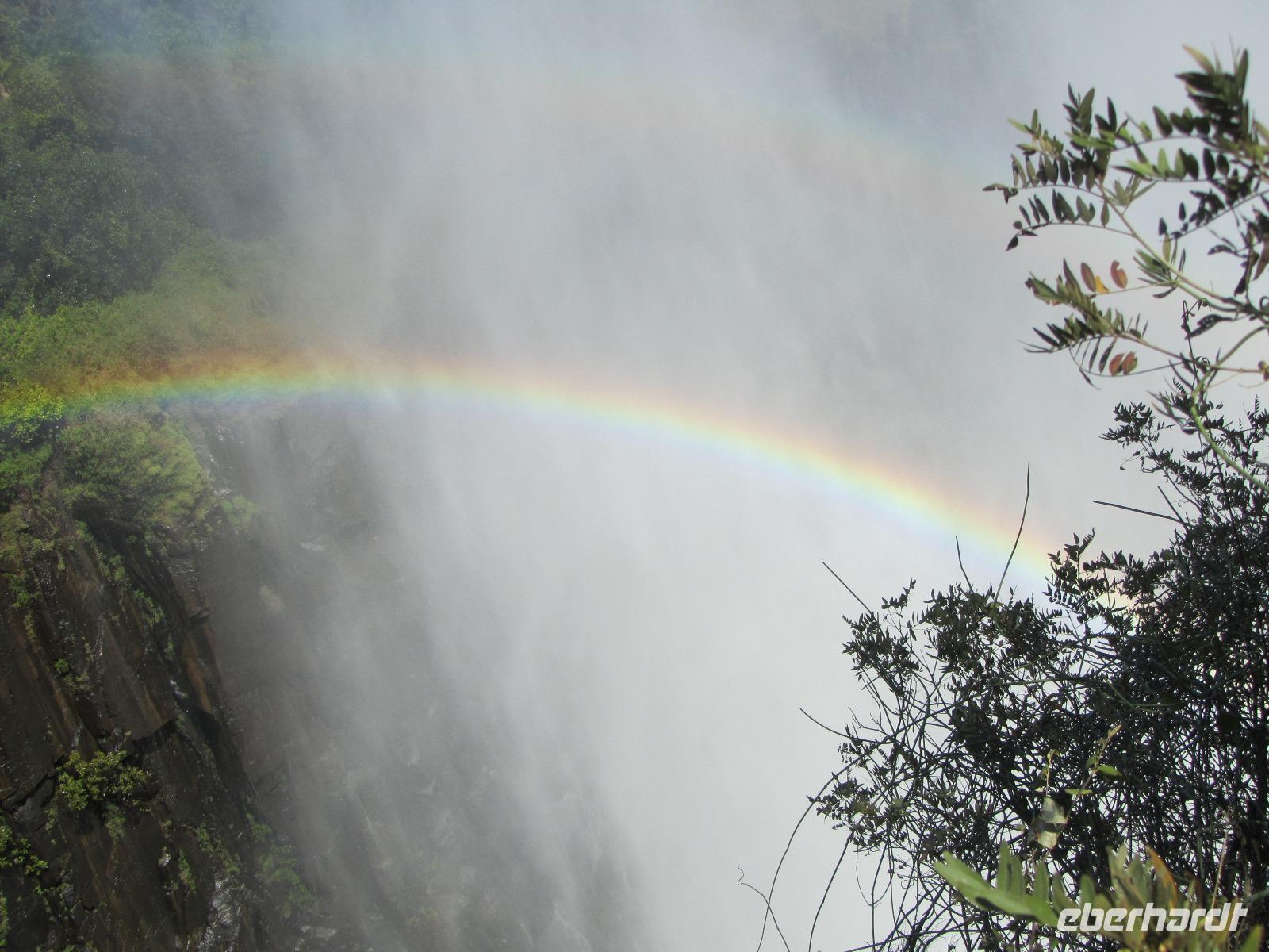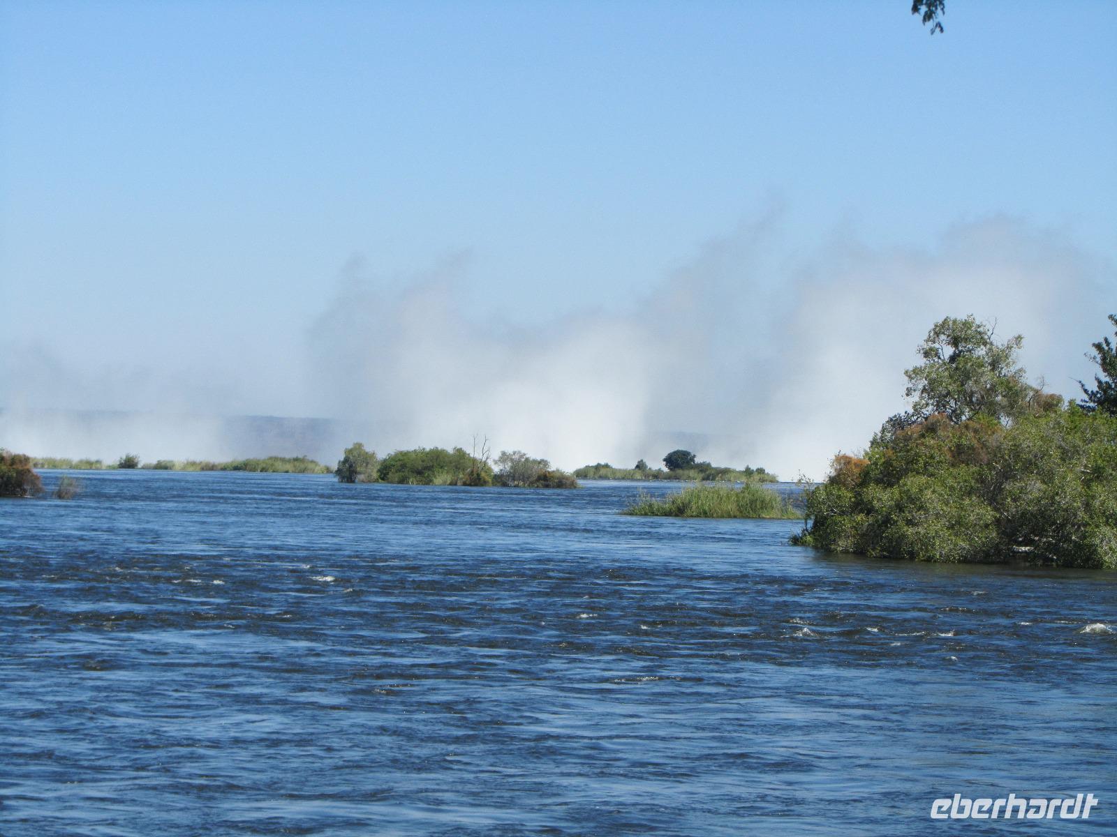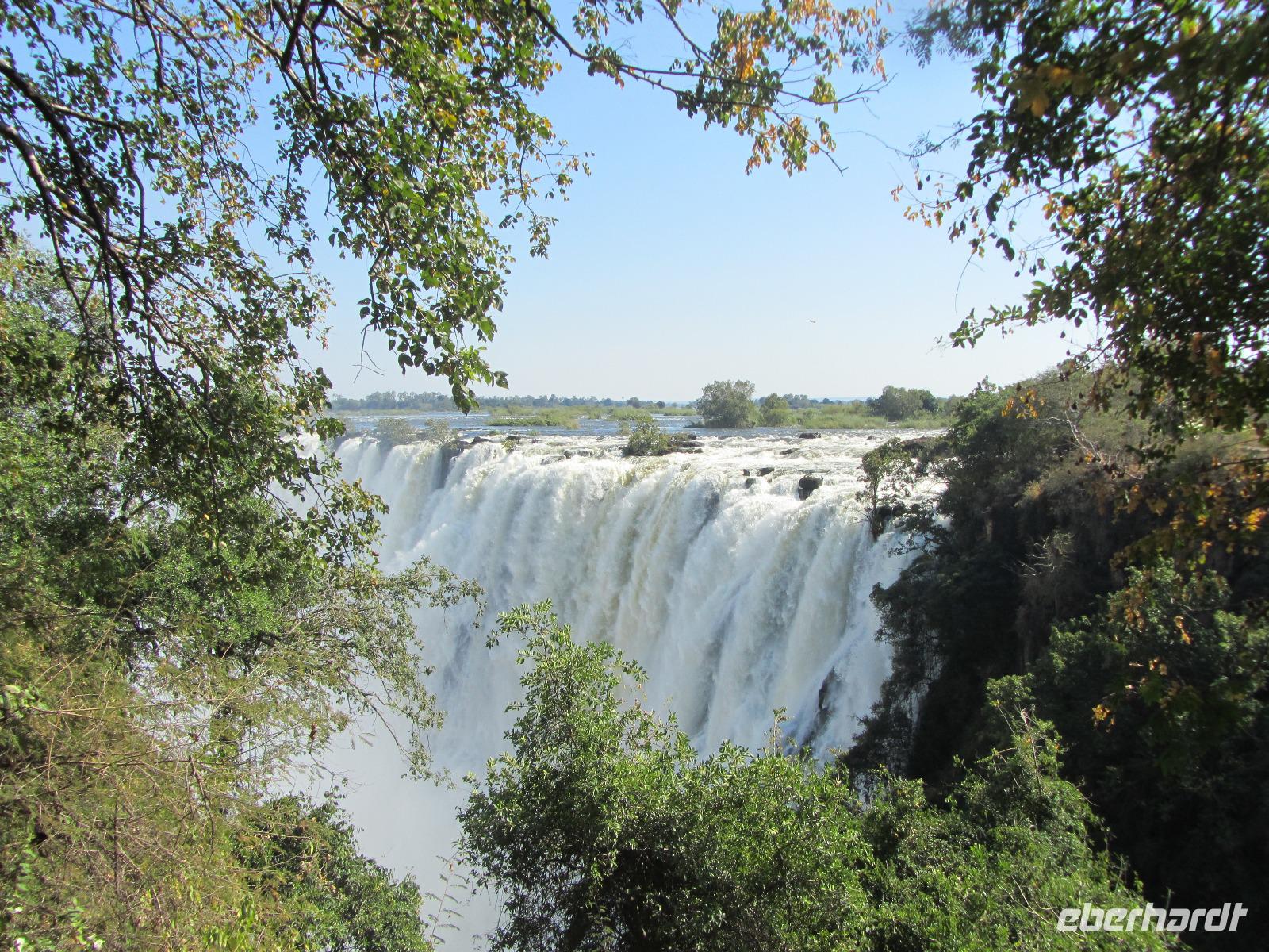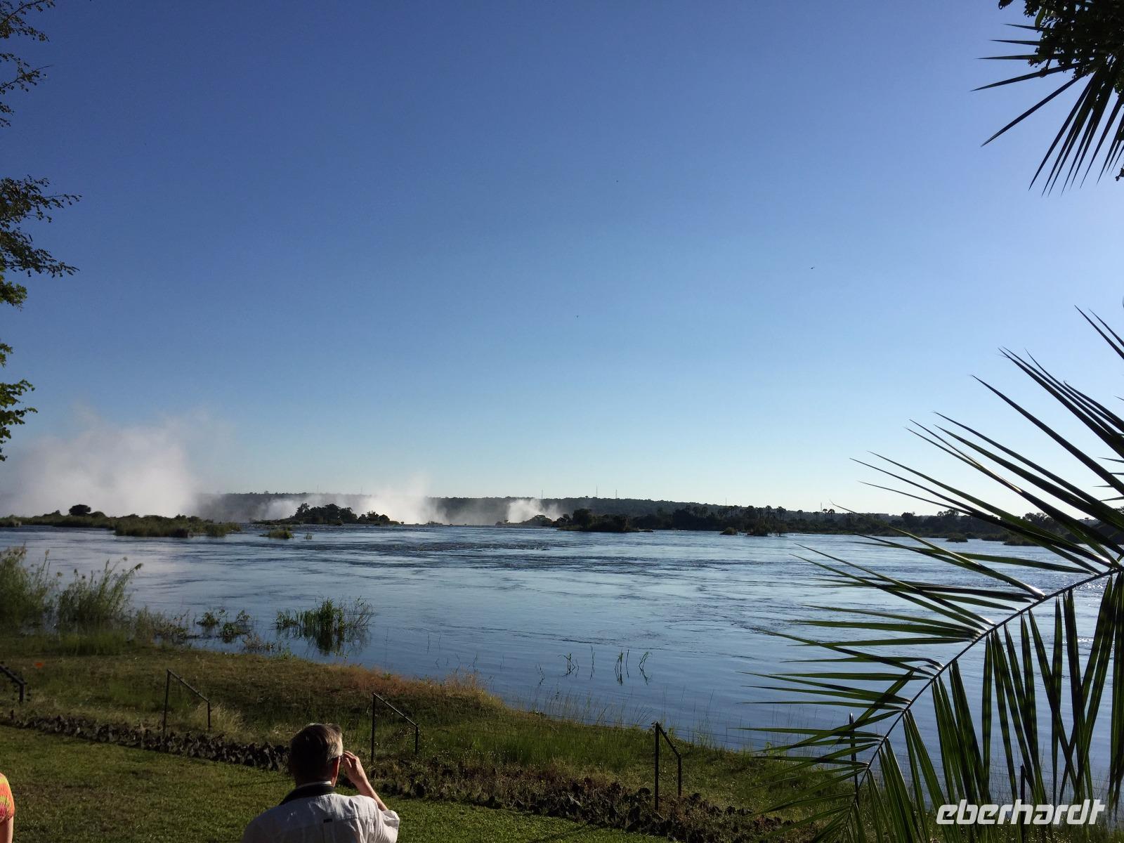 Heute war ein entspanntes Programm, gemütlich nach dem Frühstück traf ich mich, mit denen die wollten an der Rezeption um schließlich gemeinsam zu den Victoria Wasserfällen zugehen, welche in dieser Jahreszeit sehr gut gefüllt waren. Vom Hotel erreichten wir in wenigen Minuten den Grenzfluss Sambesi mit seinen dazugehörigen Wasserfällen. Wer konnte und wollte, zog hier lieber ein Regenponcho an und versteckte vor allem seine Kamera. Wir gehen ein ganzes Stück und schließlich konnten wir nichts mehr so richtig erkennen, weil von überall Wasser kam. Die Gischt der Wasserfälle war so stark, dass wir alle die keinen Poncho übergezogen hatten komplett nass waren. Doch das machte uns gar nichts aus, denn die Sonne schien bei herrlichen 29 Grad und so wurden wir wieder schnell trocken.