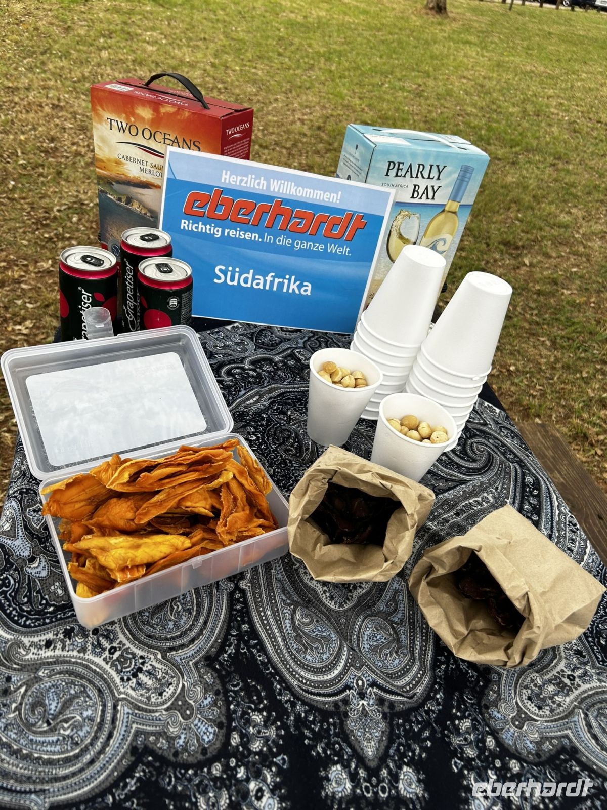 Dieses Ereignis zelebrierten wir mit einer „Kaptaufe“ - ein kleines Becherchen Amarula für jeden von uns. Außer unserem Busfahrer Sputlar, er muss uns heil wieder zurückbringen.