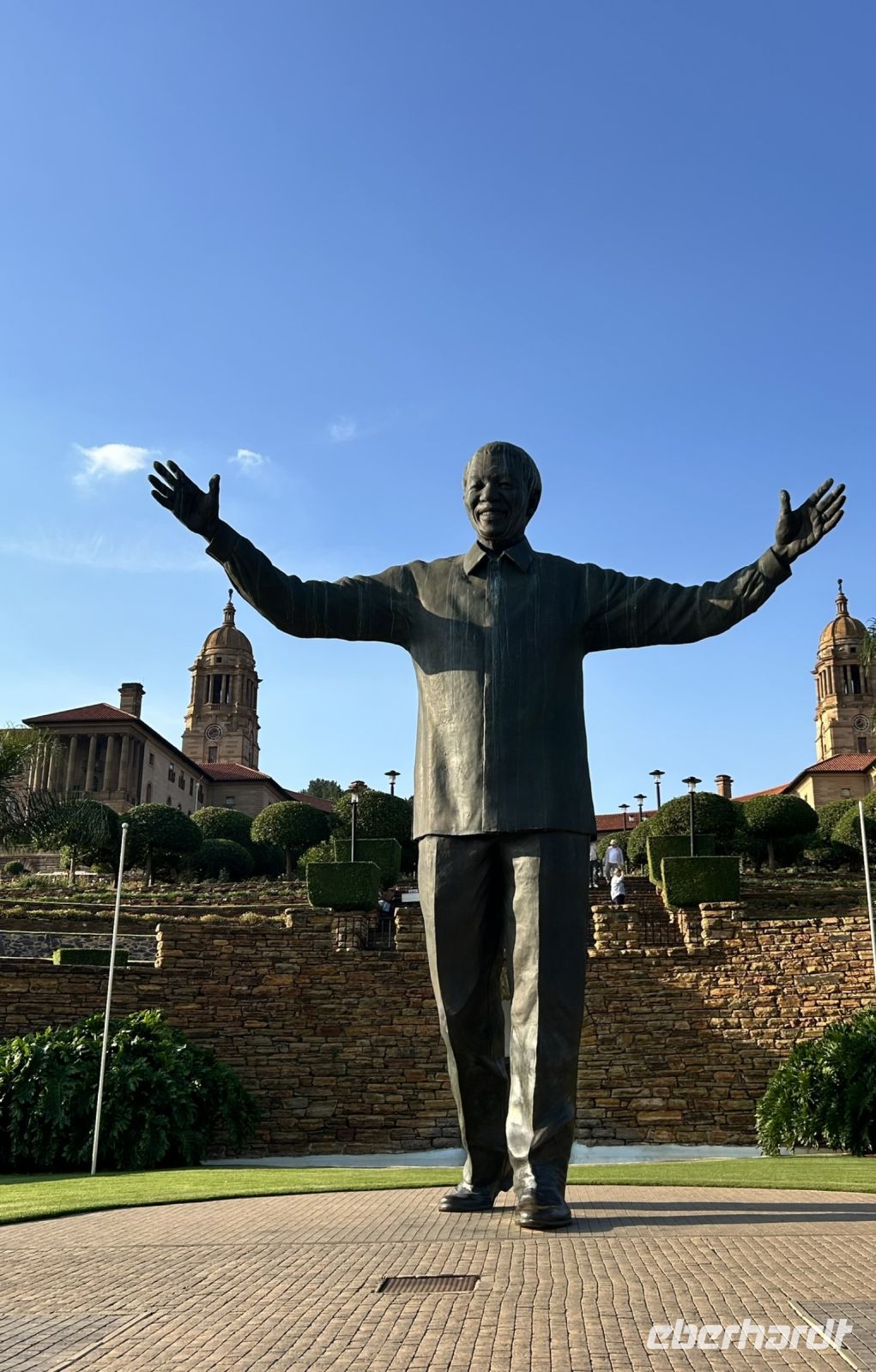 Einen nächsten Stopp machten wir an der 9 Meter hohen Bronzestatue von Nelson Mandela, welche vor dem Regierungsgebäude in Pretoria steht mit Blick auf die Stadt. Mit seinen offenen Armen, könnten man meine, dass er nach wie vor über die Stadt wacht.