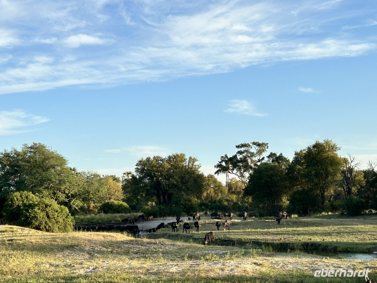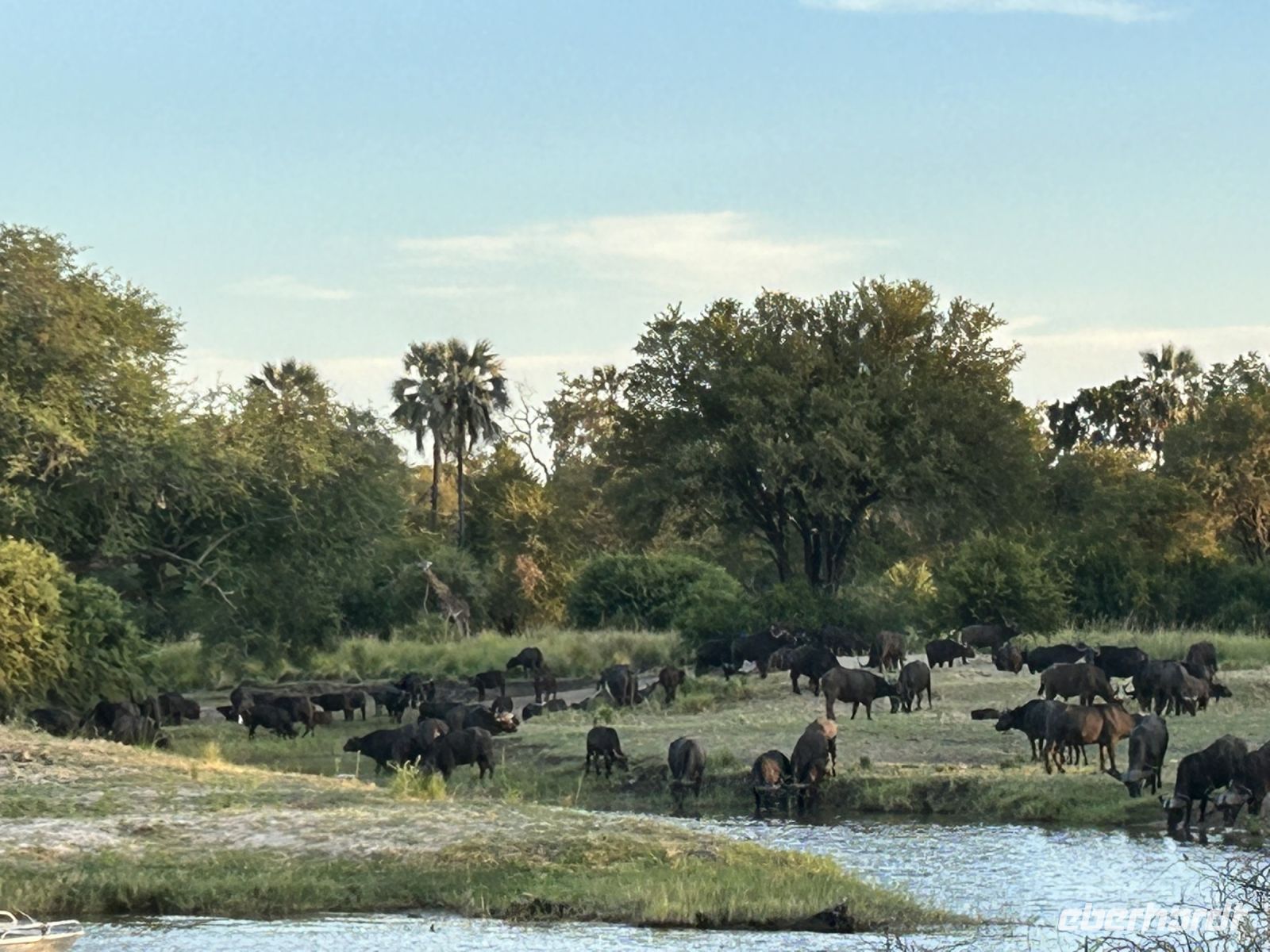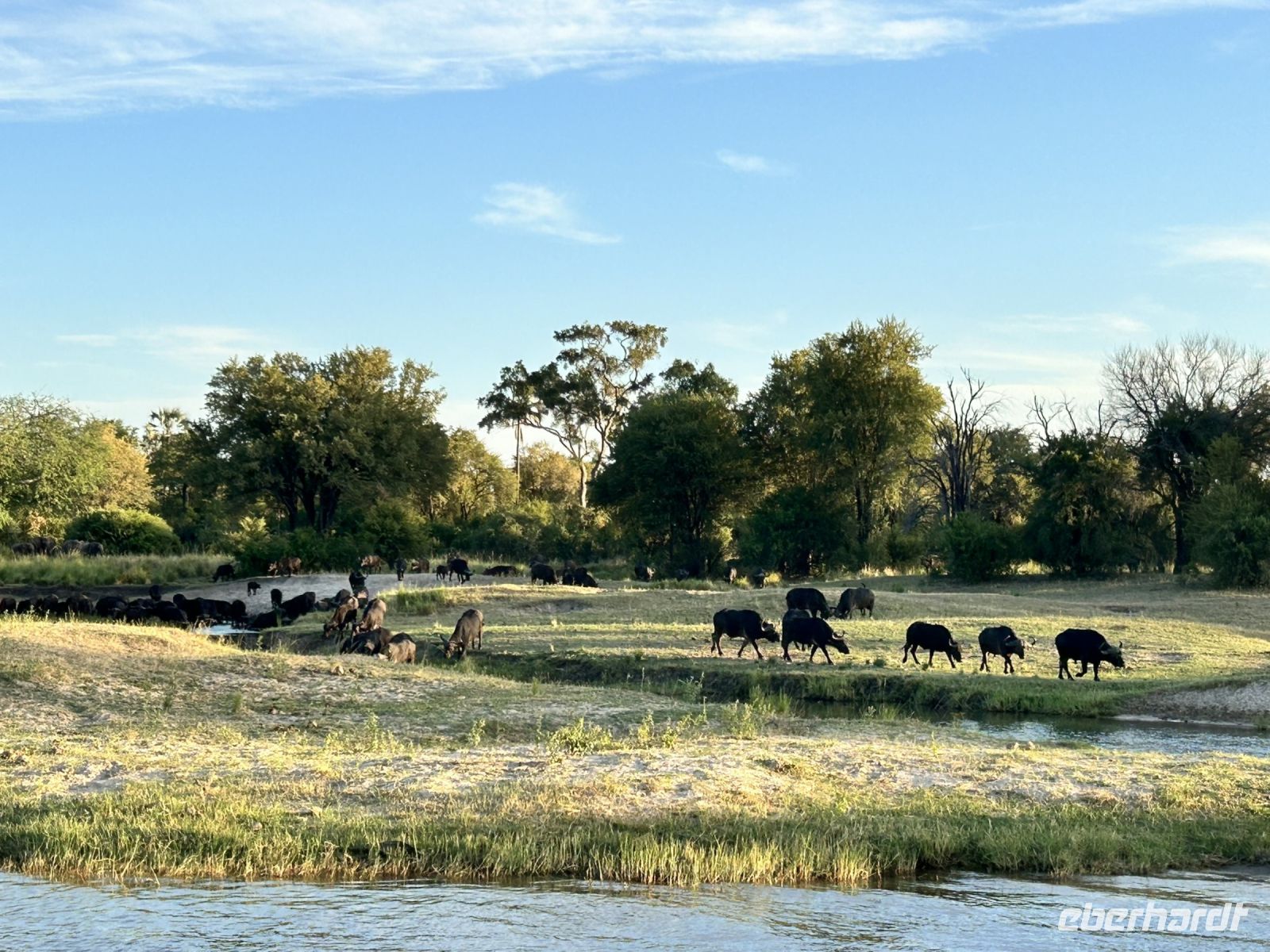 Kurz vor Ende der Bootsfahrt tauchte auf einmal eine Herde Büffel am Wegesrand auf