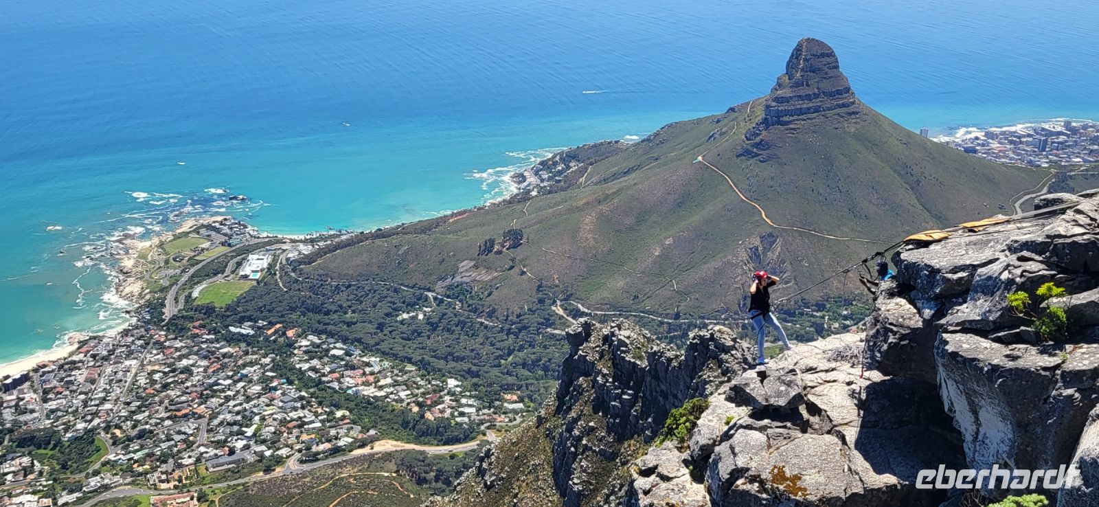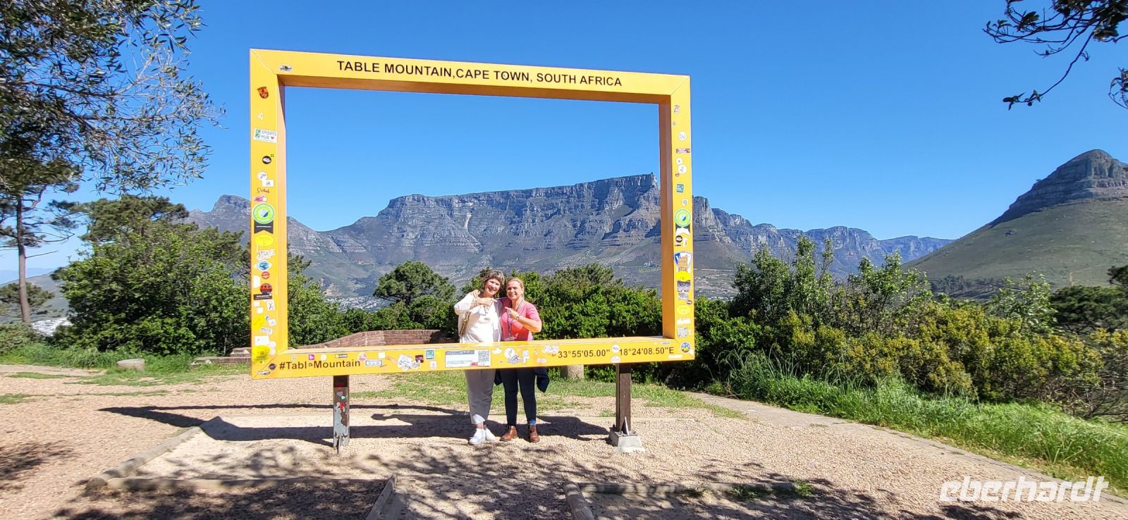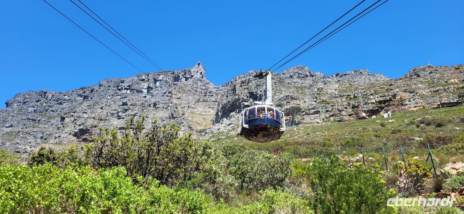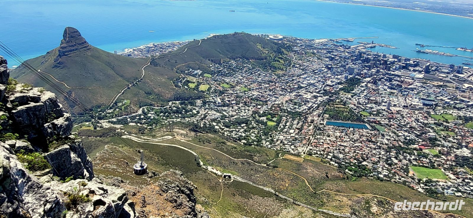 Auch in diesem Jahr klappt die Einreise wie am Schnürchen. In Windeseile erledigen wir das Ankunftsprozedere. Keine Formalitäten, die aufhalten, Gepäck ist auch ebenso schnell gesichtet und schon nach 45 Min. werden wir von unserer Reiseleiterin Marion am Ausgang herzlich in Empfang genommen. Noch schnell etwas Geld am Automaten ziehen und los geht unsere Südafrikatour. Da das Wetter nicht nur mehr als passend sondern fantastisch ist, starten wir als Erstes mit dem Tafelberg. Schade nur, dass wir mit dieser Idee heute nicht alleine sind. Es gibt so viele andere Touristen, dass die Wartezeit mit einem normalen Ticket aktuell 2,5 Std. beträgt. Das wollen wir uns wirklich nicht antun, beißen in den sauren Apfel und buchen gegen einen saftigen Aufpreis die sogenannte Fast Lane. Dieses goldene Ticket bringt uns in knapp 20 Minuten per Gondel nach oben. Teuer, aber lohnt sich allemal! Die Gondel fasst 65 Personen, von der es jeweils eine nach oben und eine wieder hinuntergibt. Das unglaubliche Panorama zieht uns direkt in seinen Bann. Mit Blick auf den 350 m hohen Signal Hill, von dem regelmäßig Kanonenschüsse abgegeben werden (ein Ritual aus vergangenen Zeiten), daneben thront der Lions Head mit 669 m und oben auf dem Plateau des Tafelbergs angekommen, befinden wir uns nun auf 1087 m. Die Aussicht ist unbezahlbar. So sehen wir auf die Stadt mit 4 Mio. EW hinab und auch die umliegenden Buchten, sowie die Gefängnisinsel Robben Island, deren berühmtester Häftling einst Nelson Mandela war, sind bestens sichtbar. Wieder unten im Tal angekommen, steuern wir mit Busfahrer Anthony den Signal Hill an, von wo wir nochmals eine andere Sicht auf Tafelberg und Co. genießen können. Da wir auf dieser Reise länger als sonst in Kapstadt verweilen, teilen wir uns die weiteren Eindrücke der Stadt auf die kommenden Tage auf und checken am Nachmittag in unsere tolle Unterkunft für die nächsten 4 Nächte, dem SunSquare Cape Town City Bowl, ein. Zentral gelegen bietet es moderne, komfortable Zimmer und der Bar-und Poolbereich auf der 14. Etage, also der Dachterrasse, ist wirklich atemberaubend. Auf zur Happy Hour ein kühles Getränk bei grandioser Aussicht genießen und erst mal gedanklich ankommen. Ein schmackhaftes Abendessen erfolgt im Hotelrestaurant, wo wir uns alle schon ein bisschen näher kennenlernen.