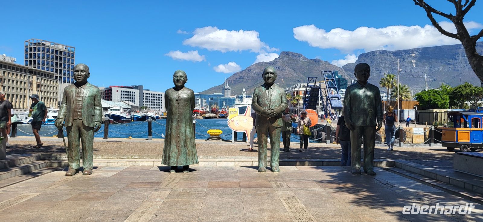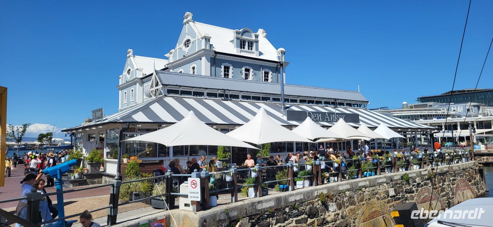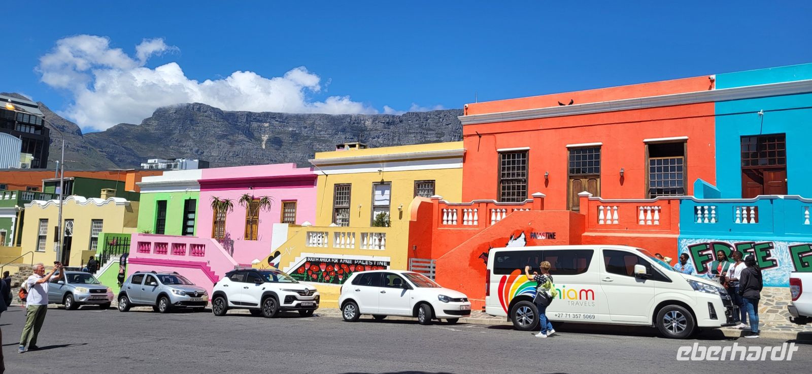 Heute ist ein Feiertag für unsere lieben Gäste, denn es heißt-Ausschlafen, Frühstück genießen und erst am Vormittag auf Entdeckungstour gehen. Wir nutzen den noch ruhigen Vormittag, um uns an der Victoria & Alfred Waterfront zu orientieren. Diese ist neben dem Tafelberg einer der bekanntesten Punkte in der Stadt. Im Hafengelände wurde neben den noch bestehenden Lagerhallen etliche diese für andere Zwecke freigegeben. So finden sich hier endlose Restaurants, Einkaufsmalls, Museen, Kunstgalerien, Straßenkünstler, Live Musik, somit alles, was das Herz begehrt. Damit wir am freien Nachmittag alles in Ruhe anschauen können, zeigt uns Marion, wo sich was befindet, damit wir später nicht verloren gehen. Im Anschluss fahren wir zum Bokaap Viertel. Das "Bo Kaap"(bedeutet „oben auf dem Hügel“) oder "Cape Malay Quarter" gehört zu den kulturell und historisch interessantesten Teilen von Kapstadt. Viele der Bewohner sind Nachfahren der einst verschleppten Sklaven beispielsweise aus Malaysia, Sri Lanka, Indien, etc. Viele der heutigen Bewohner sind muslimischen Glaubens. Das alte Viertel, mit seinen engen, steilen Gassen, schlicht verzierten Handwerkshäusern, wurden kunstvoll restauriert und farbenfroh gestrichen. So ist es heutzutage das bunteste Viertel der Stadt und bietet uns Besuchern eine tolle Kulisse. Hier werden wir auch heute zum Mittagessen erwartet und kehren in das Bokaap Kombuis ein. Ein herrliches Buffet mit vielen kap-malaiischen Köstlichkeiten und eine noch grandiosere Aussicht erwarten uns hoch oben im Stadtviertel. Heute bei erneutem Traumwetter eine absolute Augenweide. Wir blicken über die komplette Kulisse von Kapstadt, der Tafelberg liegt frei und man kann sich keinen besseren Platz für ein schönes Mittagessen wünschen. Der Nachmittag steht allen zur freien Verfügung, so chillen die einen im Hotel, nutzen die vielen Annehmlichkeiten. Andere verschlägt es ins bekannte Aquarium am Hafen. So mancher erkundet die Waterfront, deren zahlreiche Möglichkeiten zum Bummeln und Genießen einladen.