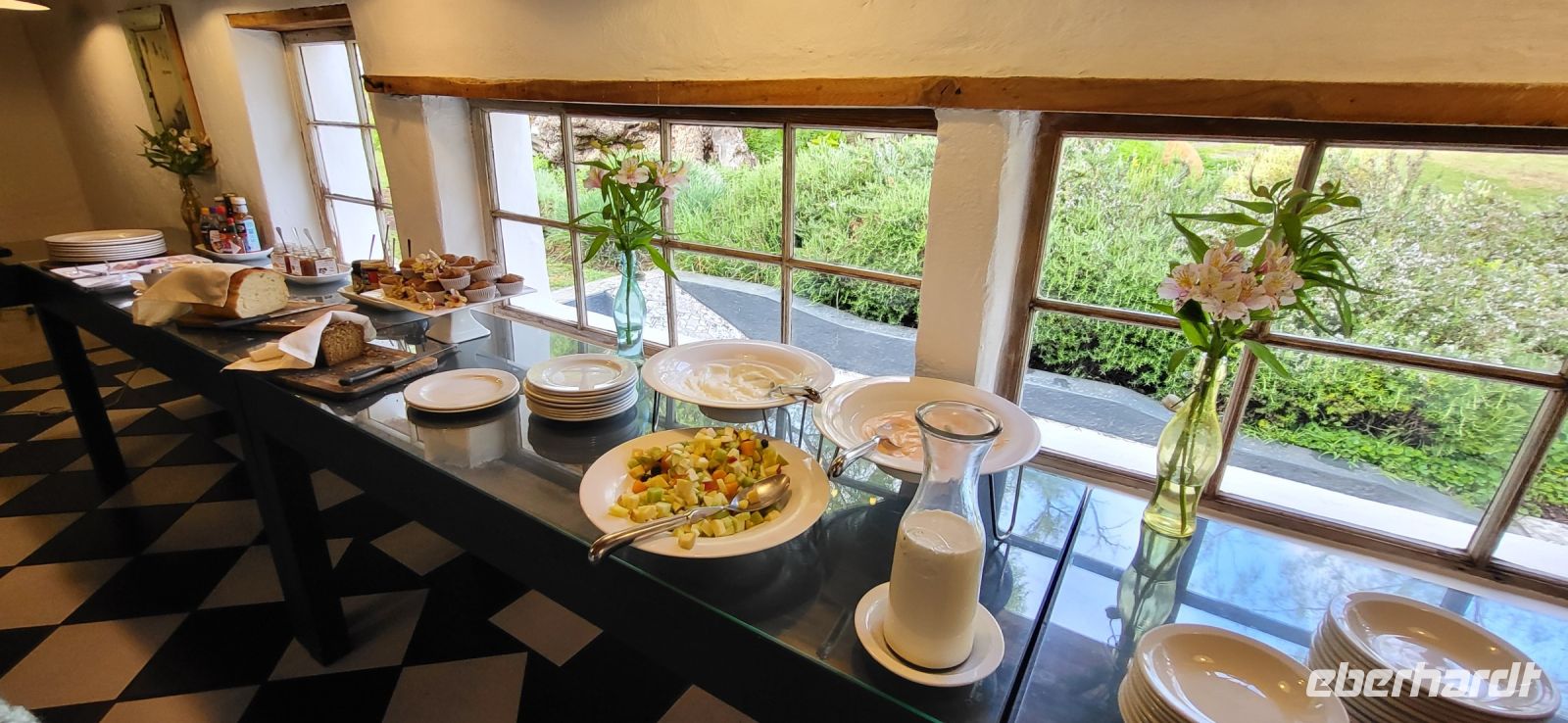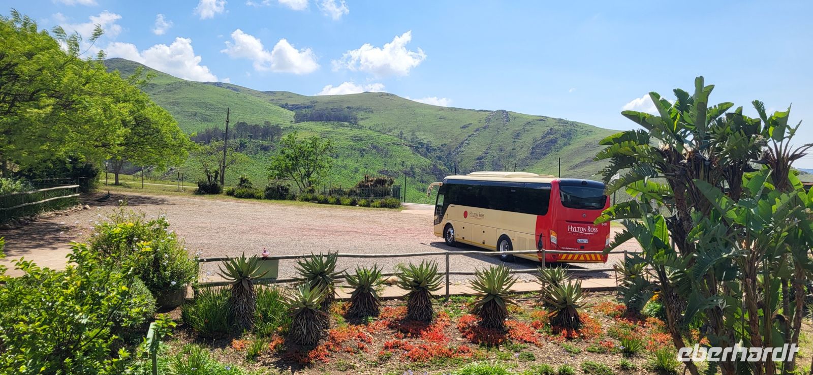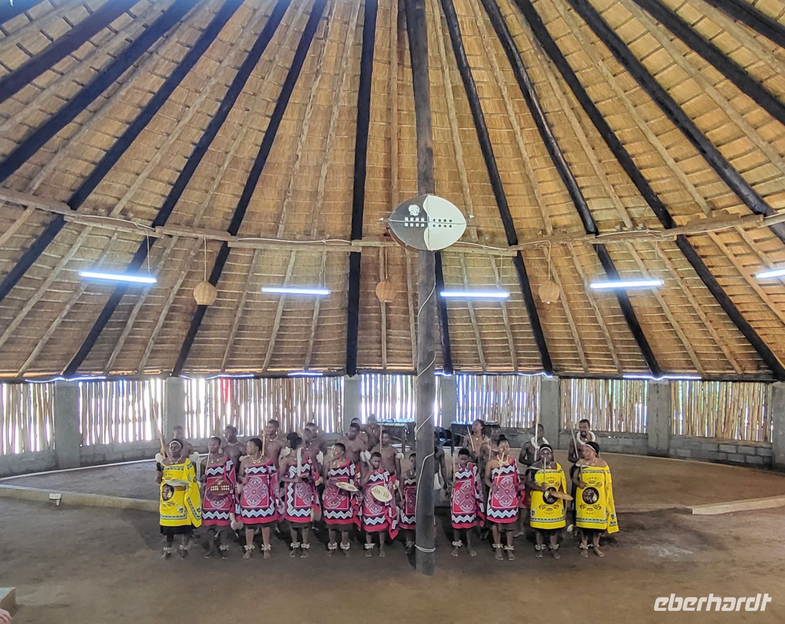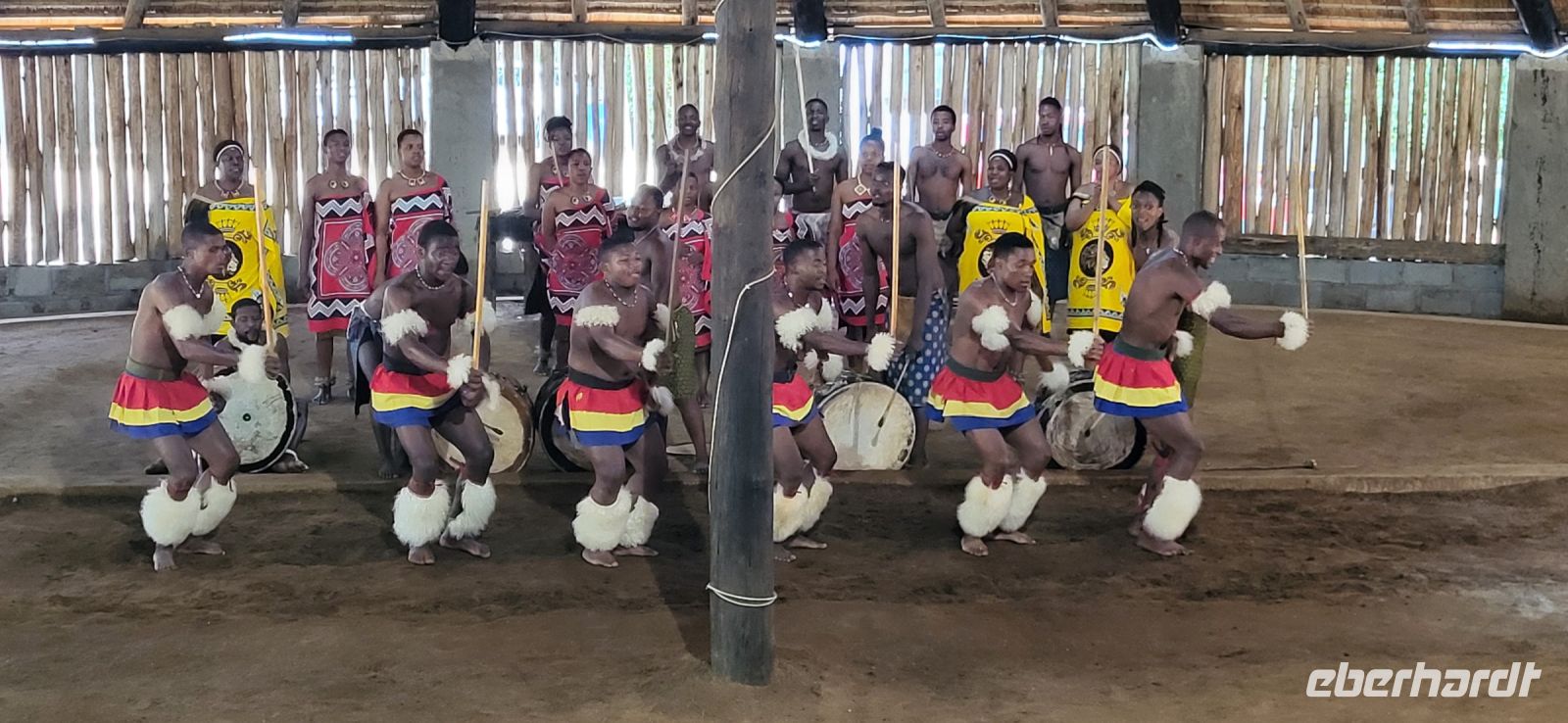 Für unser heutiges Programm sagen wir „Goodbye Südafrika“ und auf nach eSwatini, welches bis 2019 Swaziland genannt wurde. Von Reiseleiterin Sonet erfahren wir, dass der Swazi König die Namensänderung beschloss, da sich für ihn Swaziland zu sehr nach „Switzerland“ also der Schweiz anhörte. Dieses kleine Königreich inmitten von Südafrika ist seit 1968 unabhängig von Großbritannien und mit einer Fläche von 17.000 km² sowie aktuell 1,2 Mio. EW halb so groß wie die Schweiz. Der König des Landes hat mit siebzehn Ehefrauen fünfundvierzig Kinder und regiert bereits seit 37 Jahren. Jede Ehefrau verfügt über ein eigenes Haus, in dem sie mit den gemeinsamen Kindern lebt. Entgegen des Königs Luxus lebt sein Volk überwiegend in Armut und führt ein eher bescheidenes Dasein. Nachdem wir zunächst die Grenze zu Fuß passieren und aus Südafrika ausreisen, reisen wir auf gleiche Weise nach Eswatini ein. Alles verläuft problemlos. Am frühen Nachmittag erreichen wir das Mantega Cultural Village und erhalten von einem lokalen Guide eine informative Führung. Wir staunen über die verschiedenen Gebräuche, die räumliche Aufteilung zwischen Männer und Frauen sowie die fein säuberlich gefertigten Rundhütten, welche aus reinen Naturmaterialien bestehen sowie sehr clever konzipiert sind. So bieten diese bei Hitze angenehm und konstant kühle Temperaturen, sind wasserdicht und können mit wenigen Handgriffen und ausreichend Helfern von A-nach B versetzt werden. Bei Kälte können diese durch innenliegende Feuerstellen geheizt werden, wobei der Rauch nach oben abzieht und zugleich auch als Moskitoschutz dient. Eine damalige Siedlung bestand aus Mann, zwei Ehefrauen, deren Kinder und der Großmutter. Jede Frau und Großmutter hatte ihren eigenen Bereich mit Küche, Bierküche, wo Bier gebraut wurde und Schlafzimmer. Gleiches galt für die Großmutter, wobei deren Bierküche auch als Versammlungsraum für Feierlichkeiten genutzt wurde. Kinder ab dem Alter von sechs Jahren ziehen in eine eigene Hütte, wobei Mädchen und Jungen ab dann getrennt leben. Wir sehen eindrucksvoll, wie man einst mit wenigen Mitteln lebte. Im Anschluss an die Führung erfolgt eine Gesangs-und Tanzshow und wir sind von der Akrobatik der Tänzer-und Tänzerinnen sehr angetan und natürlich ihrer tollen Stimmen, mit denen sie etliche Lieder mehrstimmig für uns darbieten. Die letzte Fahrt am Nachmittag führt uns nun durch eine Landschaft, die beinah schon an das Voralpenland erinnert. Hier hat auch die Holzwirtschaft ihren Schwerpunkt und wir sehen etliche Bereiche, an denen Holz gelagert oder verarbeitet wird. Wir erreichen die wunderschön in der Natur gelegene Foresters Arms Lodge, beziehen unsere schönen Zimmer mit Blick auf Garten und Pool und treffen uns zu einem kulinarischen Highlight der Reise wieder. Der Speiseraum im altenglischen Stil gehalten, ist sehr einladend und der Service hier großgeschrieben. Es erfolgt ein mehrgängiges Menü, aus dem wir viele Speisen wählen können, welches wiederum in Windeseile äußerst schmackhaft serviert werden. Die Unterkunft und die grandiose Verpflegung lassen unseren Aufenthalt in Eswatini/Swaziland bestens ausklingen.