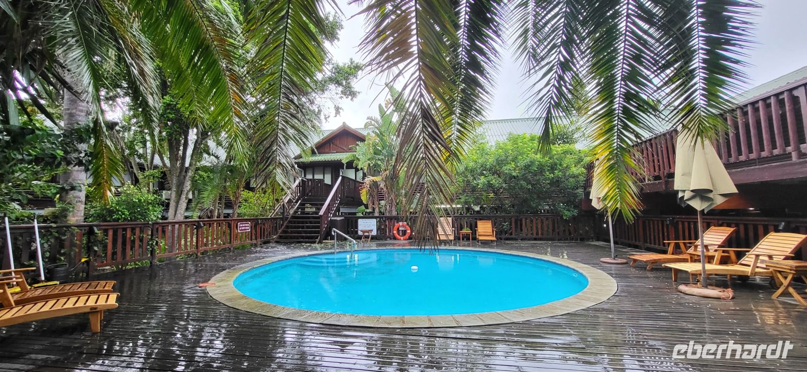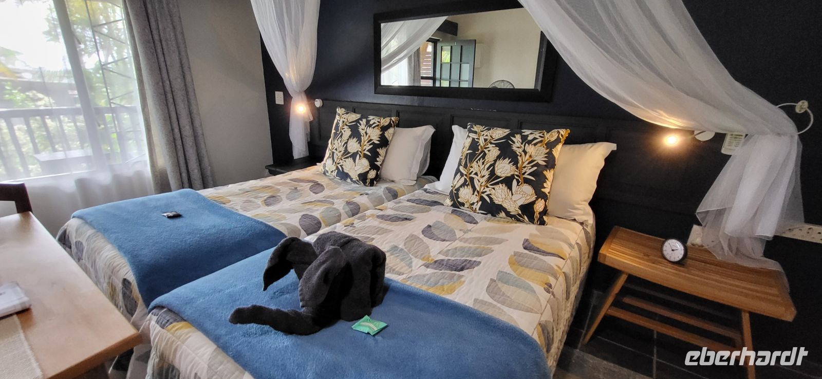 Nachdem es die ganze Nacht durchgeregnet und gewittert hat, stehen wir heute bereits vor den Hühnern auf, denn ein morgendlicher Flug bringt uns in nur gut einer Stunde nach Durban, auch genannt, die Stadt der Inder. Freundlicherweise bereitet uns das Hotel bereits um 06.00 Uhr ein tolles Frühstücksbuffet zu und so gut gestärkt fahren wir nur knapp 10 Minuten bis zum Flughafen von Port Elisabeth. Der Check-in und Handgepäckkontrolle erfolgen ebenfalls im „Schweinsgalopp“ und nun heißt es Abschied nehmen von unserer lieben Marion, die heute ebenfalls zurück nach Kapstadt fliegt. Mit Airlink und einem sehr kleinen Flieger für ca. 60 Passagiere, geht es nach Durban. Der Flug-absolut ruhig und herrliche Aussicht und im Handumdrehen sind wir auch schon wieder gelandet. Hier werden wir von Sonet, unserer neuen Reiseleiterin, herzlich begrüßt. Noch kurze Erledigungen im Flughafen und mit neuem Bus und Fahrer Nkhuliseni Ratshivumo (netterweise dürfen wir in Ratsha nennen) geht es jetzt ca. 240 Km nach St. Lucia. Auf der Fahrt sehen wir wieder eine neue Landschaft, teils mit viel Monokultur und riesigen Eukalyptuswäldern, die für die Holzherstellung genutzt werden. Bei unserer Ankunft werden wir sehr herzlich in der familiär geführten Umlilo Lodge empfangen. Wir fühlen uns indessen wie im Dschungelbuch … eine hübsche kleine Anlage umrahmt von üppiger Natur begeistert uns. Bevor es zur Bootsfahrt auf den Ausläufern des St. Lucia Lakes geht, genießen wir noch etwas Freizeit in der Lodge. Leider setzt nun der Regen ein und kurze Zeit später gießt es wie aus Kübeln. Reiseleiterin Sonet und ich überlegen und können zum Glück die Bootstour auf morgen Vormittag verschieben. So verbringen unsere Gäste einen gemütlichen Nachmittag in der hoteleigenen Bar, die einem schönen Wohnzimmer gleicht. Bis zum Abendessen sitzt es sich gesellig in feucht-fröhler Runde. Zum Abendmahl gibt es ein typisch südafrikanischen Essen-es gibt Bobooti- eine Art Hackfleischauflauf mit Beilagen, einfach sehr schmackhaft. Auch hier wieder alles vom Familienbetrieb gekocht und serviert-wir fühlen uns einfach nur wohl hier.