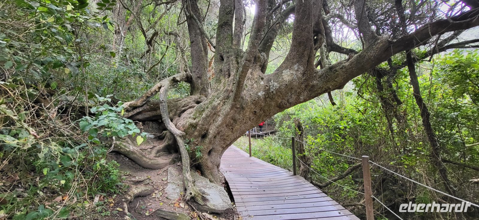 Wir verlassen Knysna am frühen Morgen und weiter geht es entlang der normalerweise malerischen Gartenroute. Dieser Abschnitt Südafrikas gilt als 2.bestes Klima der Welt mit milden Temperaturen, ausreichend Regen und vielen Nationalparks. Benannt wurde er aufgrund seiner vielfältigen Vegetation und Tierwelt, die dort zu finden ist. Leider haben wir heute etwas Pech mit dem Wetter, mit leichtem Regen und Wind dazu. Trotzdem halten wir für einen Fotostopp in Plettenberg Bay, erhaschen einen Blick auf die Küste und so mancher sichtet sogar einen Wal in der vor uns liegenden Bucht. Bevor wir zu unserer Wanderung im Tsitsikamma Nationalpark aufbrechen, halten wir an der Bloucrans Bridge, wo der weltweit höchste Bungee Sprung von einer Brücke von sagenhaften 216 m durchgeführt wird. Uns stockt der Atem, als wir einen Waghalsigen beobachten, der sich kühn in die Tiefe stürzt. Nichts für uns, so ziehen wir weiter in den idyllischen Nationalpark, der so viel wie „klares Wasser“ bedeutet. Eine ca. 1-stündige Wanderung führt uns durch urwaldartige Natur, von der wir immer wieder einen Blick auf den Indischen Ozean werfen können. Die Wanderung endet an einer 70 m langen Hängebrücke und führt uns dann wieder über kleinere Hängebrücken zurück zum Ausgangspunkt. Ein herrlicher Spaziergang, der uns sportlich doch ein bisschen fordert. Nach unserem Mittagssnack im Marilyn’s 60 Diner, mit vielen Kuriositäten, besuchen wir den sogenannten Big Tree, einen Gelbholzbaum, der ca. 1000 Jahre alt und 36 m hoch ist. Wir bestaunen einen Durchmesser von 9 m und fragen uns, was dieser Baum wohl schon so alles erlebt hat. Am späten Nachmittag erreichen wir die Küstenstadt Port Elizabeth und unternehmen noch eine orientierende Stadtrundfahrt. Diese fällt beinahe förmlich „ins Wasser“, denn es regnet und stürmt nun, was das Zeug hält. Wir sind froh, mit unserem sehr besonnenen Busfahrer Anthony Kriel gut angekommen zu sein. Beim gemeinsamen Abendessen, nutzen wir die Gelegenheit, uns bei unserem immer freundlichen Busfahrer Anthony mit einem Trinkgeld zu bedanken, der uns am nächsten Tag noch zum Flughafen bringt und dort eine neue Gruppe in Empfang nehmen wird. Ein letzter schöner Abend bricht an und bei einem schmackhaften Abendessen, bedanken wir uns nun ebenso bei unserer Reiseleiterin Marion für einen wunderbaren ersten Teil unserer Südafrikareise, da es morgen mit neuer Besatzung nach Durban geht und wir uns leider auch von ihr verabschieden müssen.