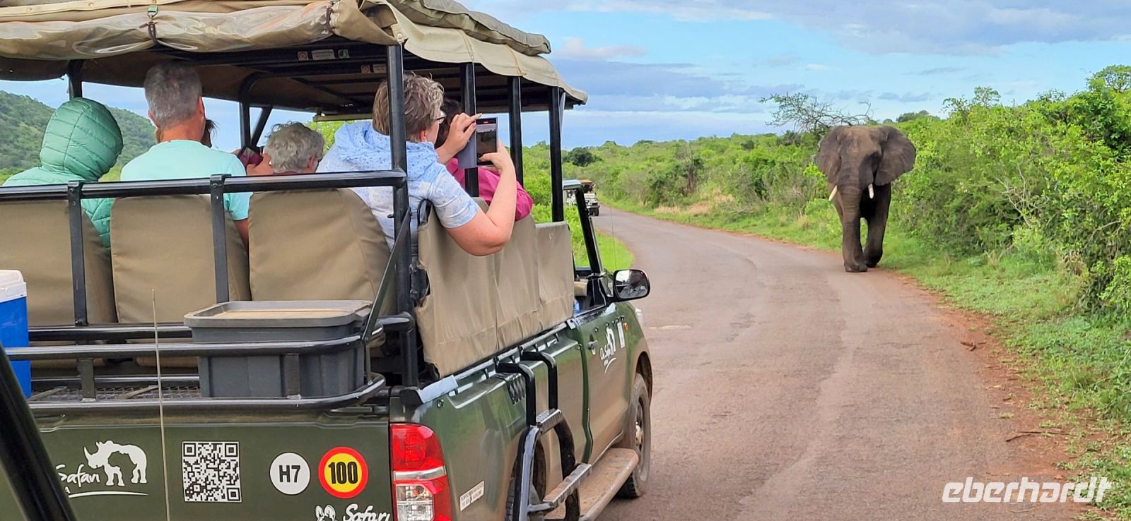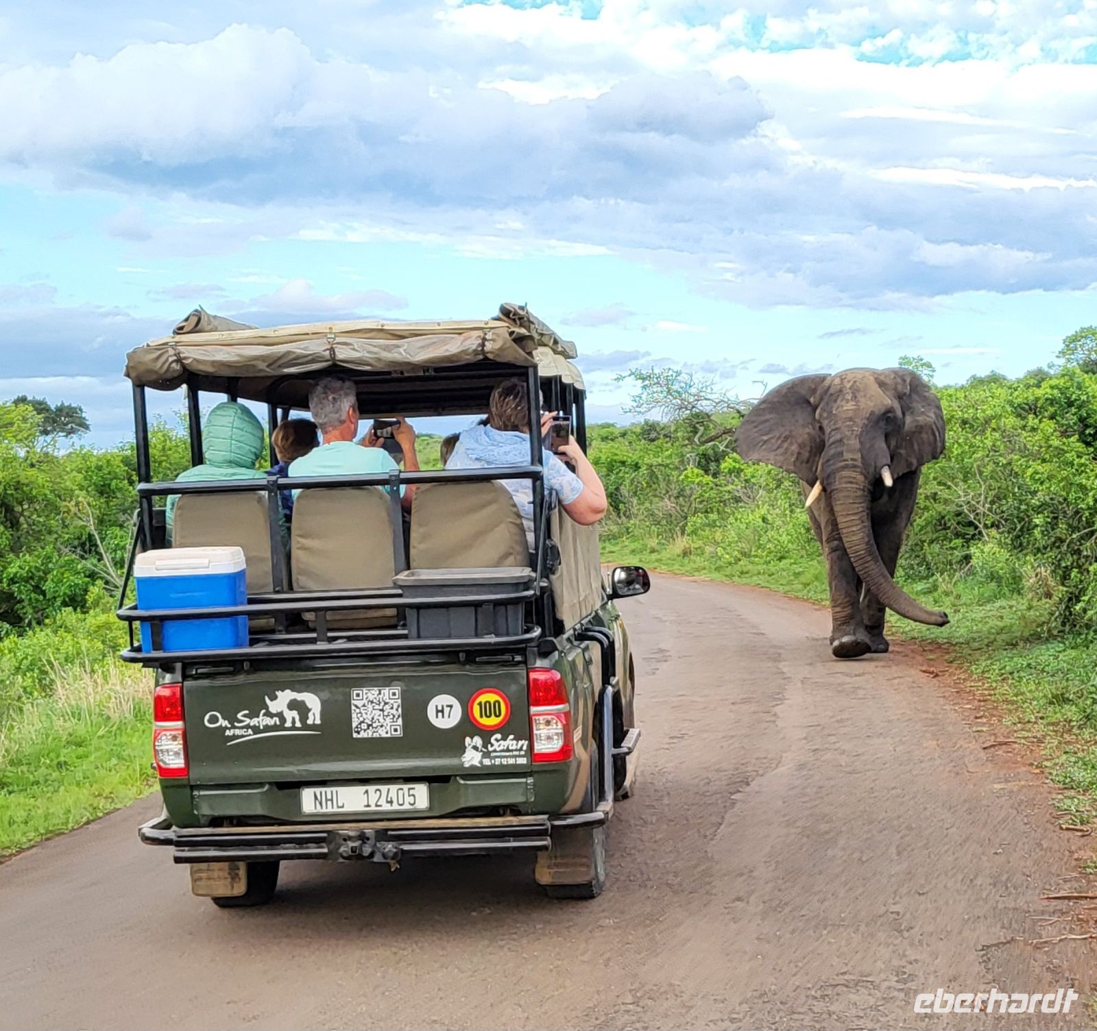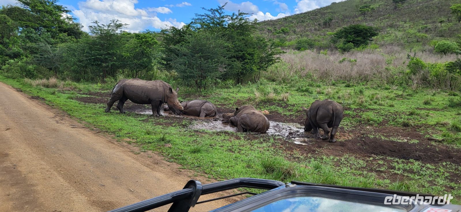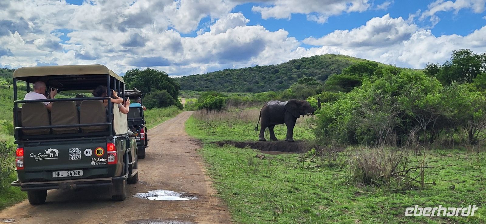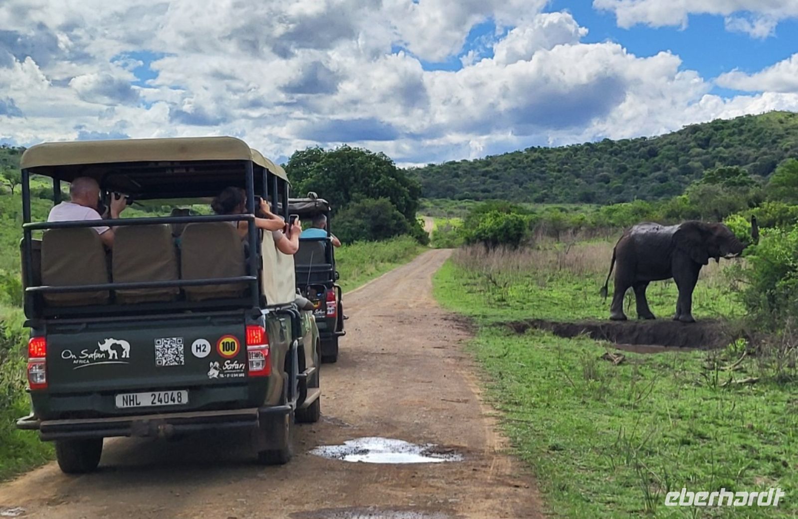 Der Wettergott zeigt sich wieder versöhnlich und so erwachen wir bei strahlendem Sonnenschein! Nach einem tollen Frühstück brechen wir auf zu einer 2-stündigen Bootsfahrt auf den Ausläufern des St. Lucia Sees. Den Bootssteg erreichen wir im Nu und erleben einen erlebnisreichen Vormittag mit zahlreichen Flusspferdsichtungen. Auch wenn die Hippos noch so possierlich aussehen, wird uns eindrucksvoll geschildert, wie gefährlich diese werden können. So begnügen wir uns gerne mit schönen Aufnahmen aus sicherer Distanz und genießen die schöne Bootstour, die gute Luft und angenehme Temperaturen. Des Weiteren dürfen wir auch kleinere Krokodile und zahlreiche Vogelarten bestaunen. Die schönen gelben Webervögel, mit ihren herrlichen Bauten, bilden im Schilf einen super schönen Farbfleck. So mancher Eisvogel sitzt im Dickicht und auch ein Schlangenhalsvogel ruht im Schilf. Für Mittags gut gestärkt, verlassen wir das schöne Touristenörtchen und machen uns auf nach Hluhluwe, zu unserem ersten Safaritag im Nationalpark. Dieser gilt mit 950 Km als der älteste und drittgrößte Nationalpark Südafrikas. Ein herrliches Stück Natur mit einer schier endlosen Hügellandschaft, zu dieser Jahreszeit unfassbar grün. So starten wir auf zwei Jeeps verteilt mit unseren lokalen Guides und erleben in den nun folgenden drei Stunden herrliche Tierbeobachtungen. Begegnungen mit unzähligen Breitmaulnashörnern lassen unsere Herzen höher schlagen. Diese sanften Riesen kommen uns teils sehr nah, da diese nicht sehr gut sehen und wir uns ganz still verhalten. Des Weiteren Elefantenherden in der Hügellandschaft oder ebenfalls am Wegesrand oder gar die Straße kreuzend. Afrikanische Büffel, Geier, grüne Meerkatzen, viele Nyalas-sehr hübsch anzusehende Antilopen, Impalas, Warzenschweine, etliche Vögel-zum Safari Ende hin haben wir uns gegenseitig viel zu berichten und bereits unvergessliche Momente hautnah mit Südafrikas Tierwelt erlebt.Als Abschlussabenteuer steuern wir unsere heutige Unterkunft, die Hluhluwe River Lodge an. Diese erreichen wir am Ziel angekommen, jedoch nicht mit unserem Bus, sondern werden zur Lodge geshuttlet oder laufen ca. 20 Minuten durch den afrikanischen Busch bis zum Eingang. Klingt abenteuerlich, hat uns allen jedoch sehr gutgetan. Angekommen werden wir mit einer herrlichen Lodge inmitten der Natur Südafrikas belohnt und bei einem tollen 3-Gänge-Menü endet ein erlebnis-und tierreicher Tag.