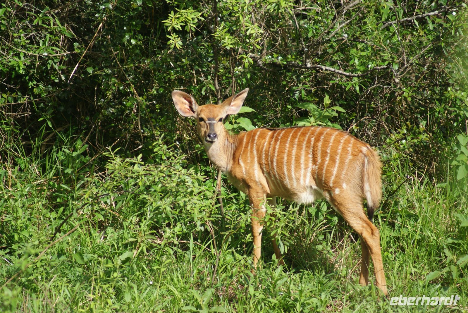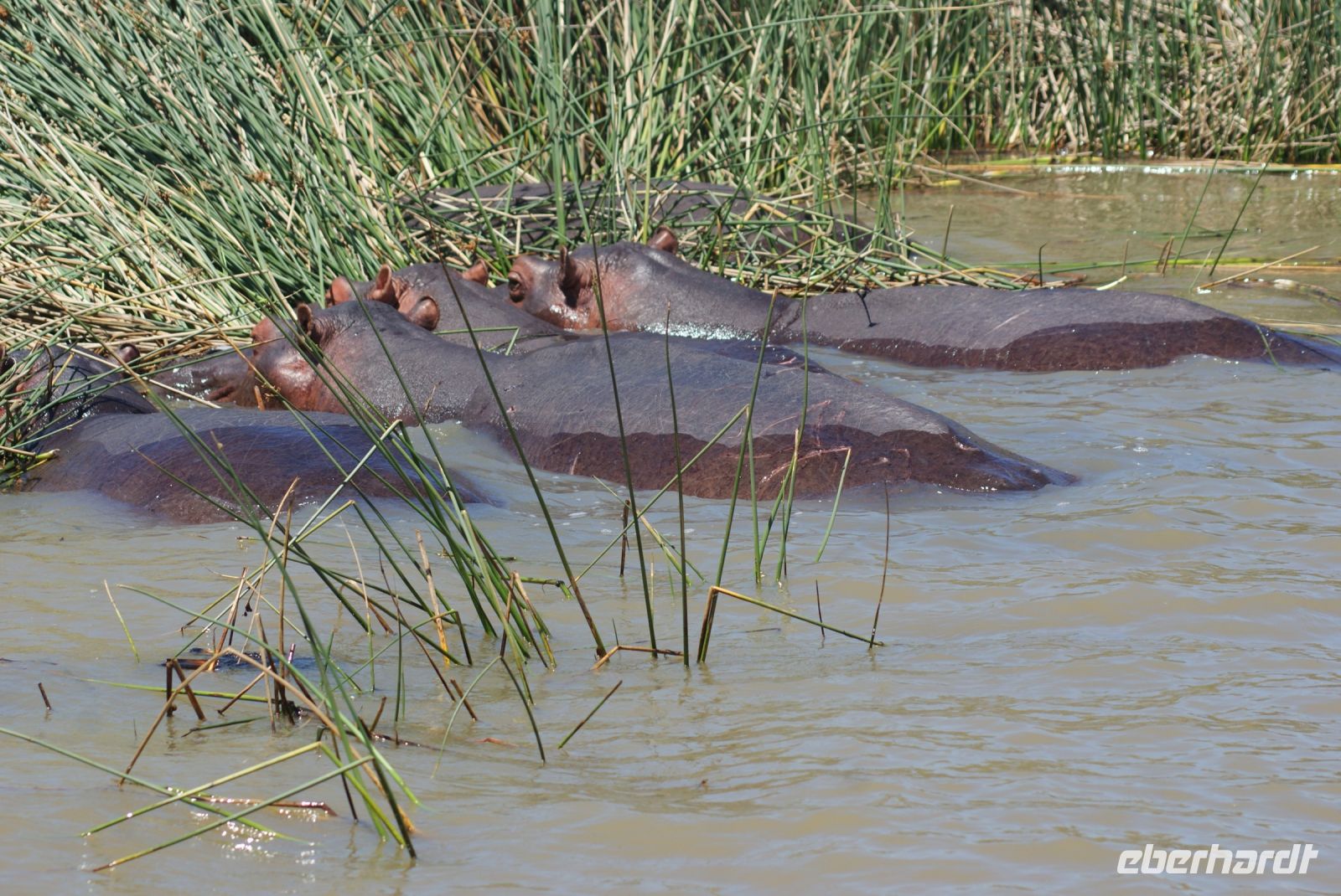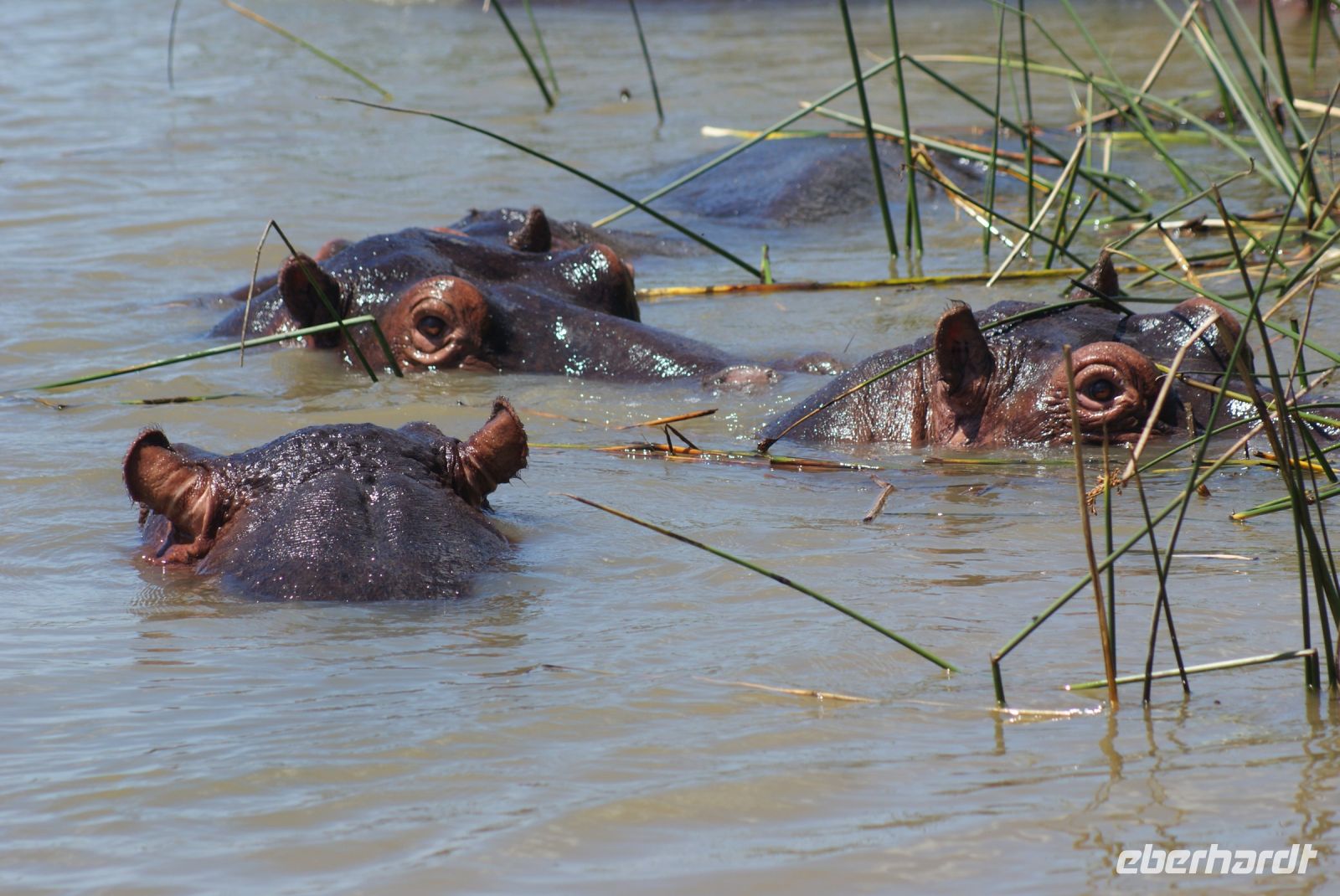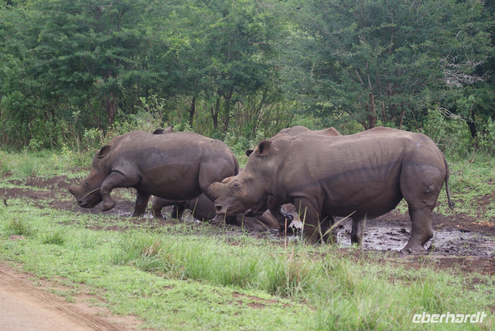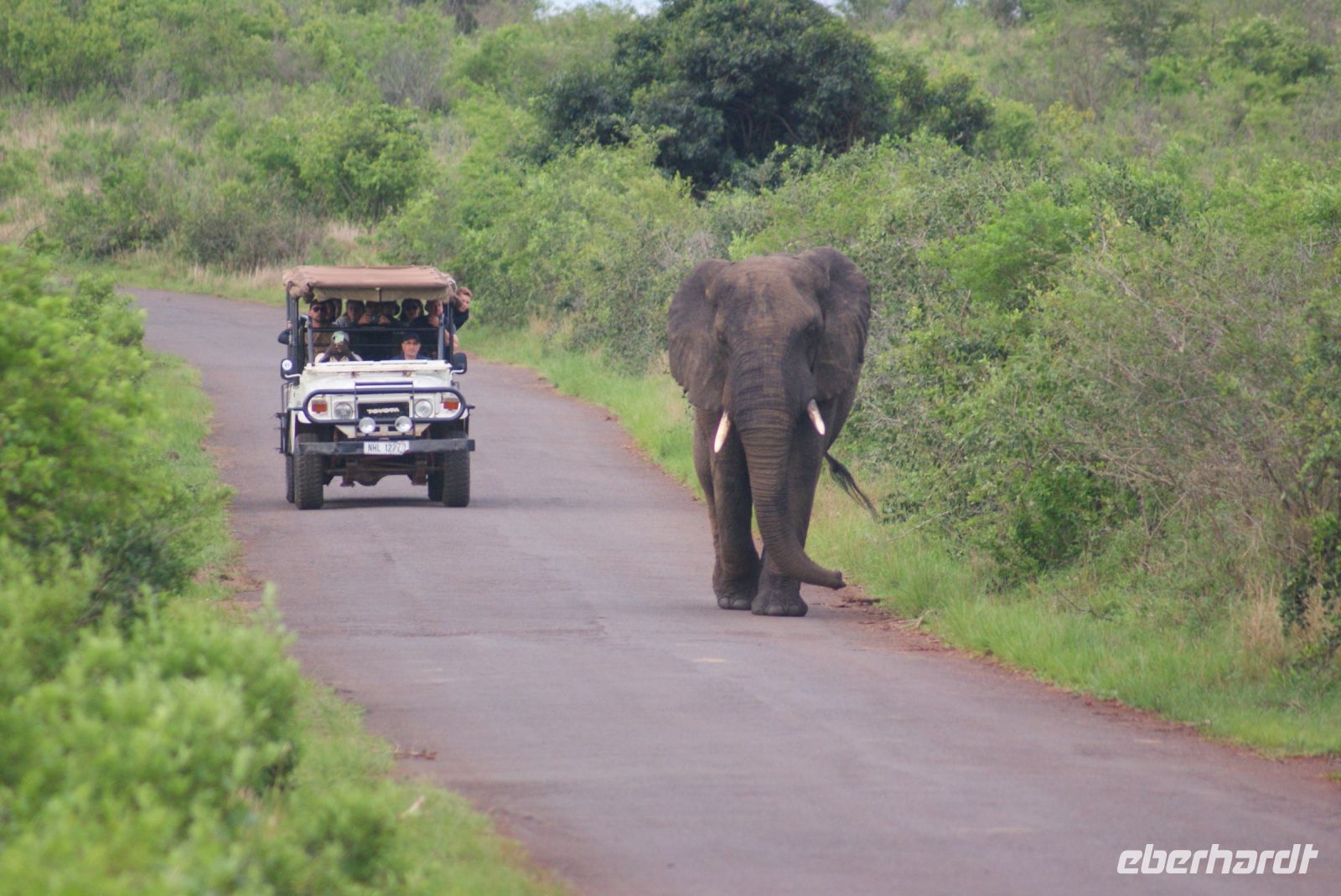 Der Wettergott zeigt sich wieder versöhnlich und so erwachen wir bei strahlendem Sonnenschein! Nach einem tollen Frühstück brechen wir auf zu einer 2-stündigen Bootsfahrt auf den Ausläufern des St. Lucia Sees. Den Bootssteg erreichen wir im Nu und erleben einen erlebnisreichen Vormittag mit zahlreichen Flusspferdsichtungen. Auch wenn die Hippos noch so possierlich aussehen, wird uns eindrucksvoll geschildert, wie gefährlich diese werden können. So begnügen wir uns gerne mit schönen Aufnahmen aus sicherer Distanz und genießen die schöne Bootstour, die gute Luft und angenehme Temperaturen. Des Weiteren dürfen wir auch kleinere Krokodile und zahlreiche Vogelarten bestaunen. Die schönen gelben Webervögel, mit ihren herrlichen Bauten, bilden im Schilf einen super schönen Farbfleck. So mancher Eisvogel sitzt im Dickicht und auch ein Schlangenhalsvogel ruht im Schilf. Für Mittags gut gestärkt, verlassen wir das schöne Touristenörtchen und machen uns auf nach Hluhluwe, zu unserem ersten Safaritag im Nationalpark. Dieser gilt mit 950 Km als der älteste und drittgrößte Nationalpark Südafrikas. Ein herrliches Stück Natur mit einer schier endlosen Hügellandschaft, zu dieser Jahreszeit unfassbar grün. So starten wir auf zwei Jeeps verteilt mit unseren lokalen Guides und erleben in den nun folgenden drei Stunden herrliche Tierbeobachtungen. Begegnungen mit unzähligen Breitmaulnashörnern lassen unsere Herzen höher schlagen. Diese sanften Riesen kommen uns teils sehr nah, da diese nicht sehr gut sehen und wir uns ganz still verhalten. Des Weiteren Elefantenherden in der Hügellandschaft oder ebenfalls am Wegesrand oder gar die Straße kreuzend. Afrikanische Büffel, Geier, grüne Meerkatzen, viele Nyalas-sehr hübsch anzusehende Antilopen, Impalas, Warzenschweine, etliche Vögel-zum Safari Ende hin haben wir uns gegenseitig viel zu berichten und bereits unvergessliche Momente hautnah mit Südafrikas Tierwelt erlebt.Als Abschlussabenteuer steuern wir unsere heutige Unterkunft, die Hluhluwe River Lodge an. Diese erreichen wir am Ziel angekommen, jedoch nicht mit unserem Bus, sondern werden zur Lodge geshuttlet oder laufen ca. 20 Minuten durch den afrikanischen Busch bis zum Eingang. Klingt abenteuerlich, hat uns allen jedoch sehr gutgetan. Angekommen werden wir mit einer herrlichen Lodge inmitten der Natur Südafrikas belohnt und bei einem tollen 3-Gänge-Menü endet ein erlebnis-und tierreicher Tag.