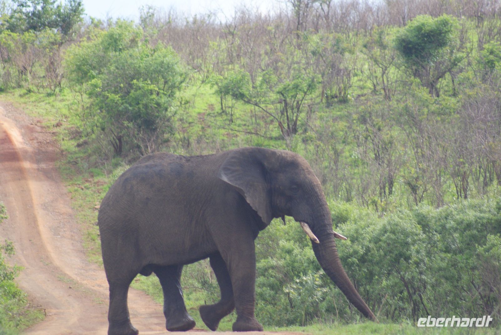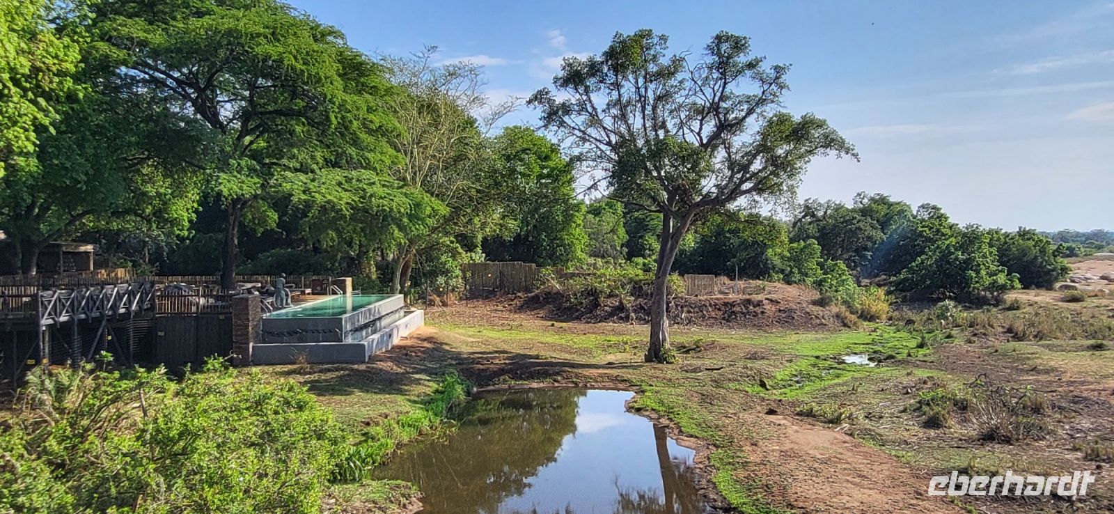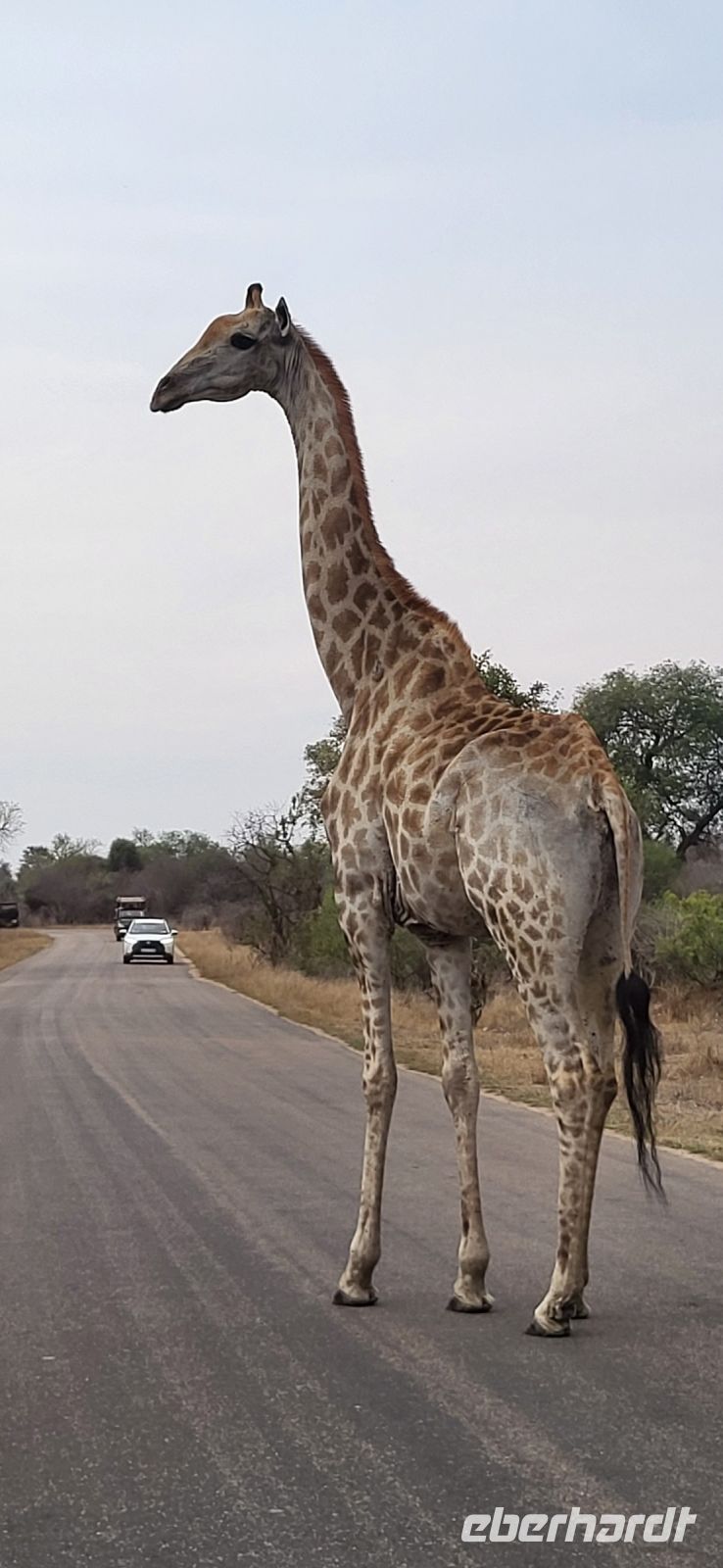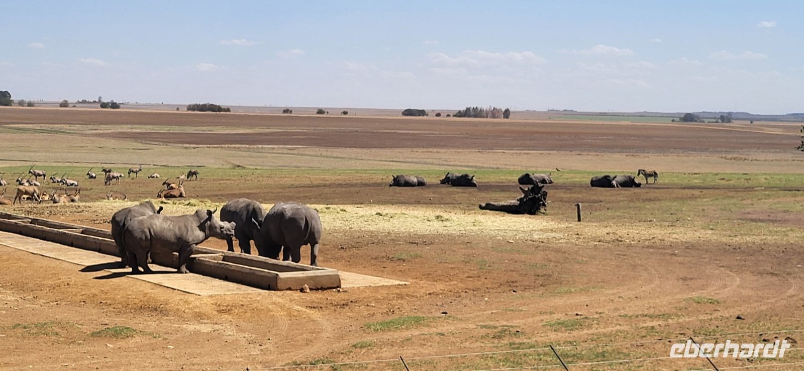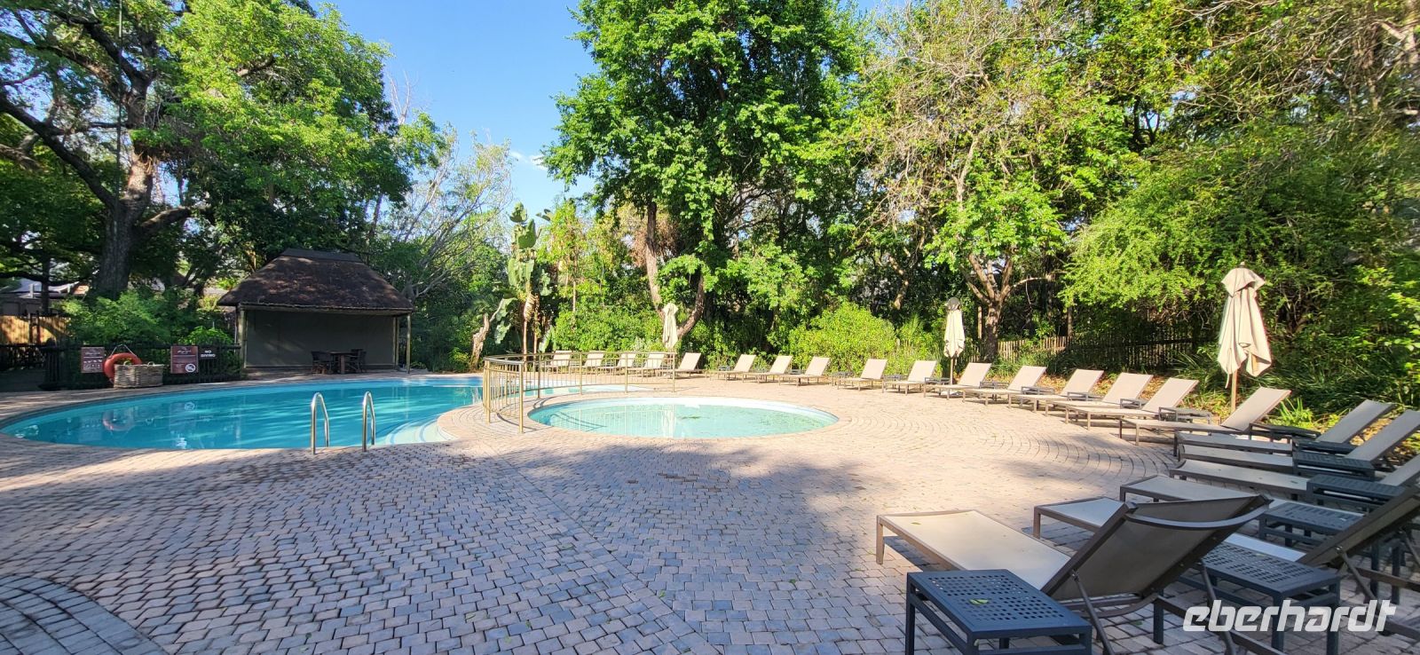 Nach einer geruhsamen Nacht treffen wir uns, mit Frühstückspaketen versorgt zu unserer Ganztagssafari im Krüger Nationalpark. Verteilt auf zwei Jeeps und mit unseren gestrigen Guides Smart und Lincoln geht es los. Wir sind positiv überrascht, was wir trotz der stets steigenden Temperaturen des heutigen Tages noch alles zu sehen bekommen. Das Wetter lässt es zu, dass wir bis zum frühen Nachmittag unterwegs sind, dann freuen wir uns auf unsere Lodge, denn mittlerweile zeigt das Thermometer an die 40° Grad. Gesehen haben wir heute noch folgendes: etliche Elefanten, Weissrückengeier, Frankoline, ein Kampfadler, Nimmersattstörche, Zwergmangusten, Rotschnabeltokos und Kudukühe-und Böcke. Viele Impalas, einen Wasserbock, drei Löwen, drei Leoparden aus der Ferne. Viele Giraffen mit Madenhackern zu Besuch, Pumbas (Warzenschweine), etc. Trotz der ungewöhnlichen Hitze für die Jahreszeit möchten wir den heutigen Tag nicht missen, der doch noch viele schöne Erlebnisse gebracht hat. Zurück in der Lodge zieht bald erneut ein Gewitter auf und es gibt reichlich Regen, den die Natur hier mehr als nötig hat. Abends erfolgt ein letztes sehr schmackhaftes Buffet im Restaurant und eine letzte idyllische Nacht in dieser tollen Anlage.