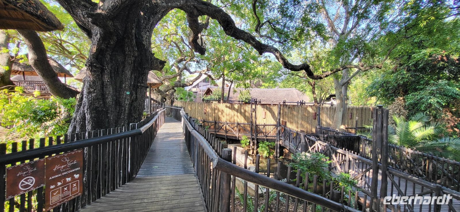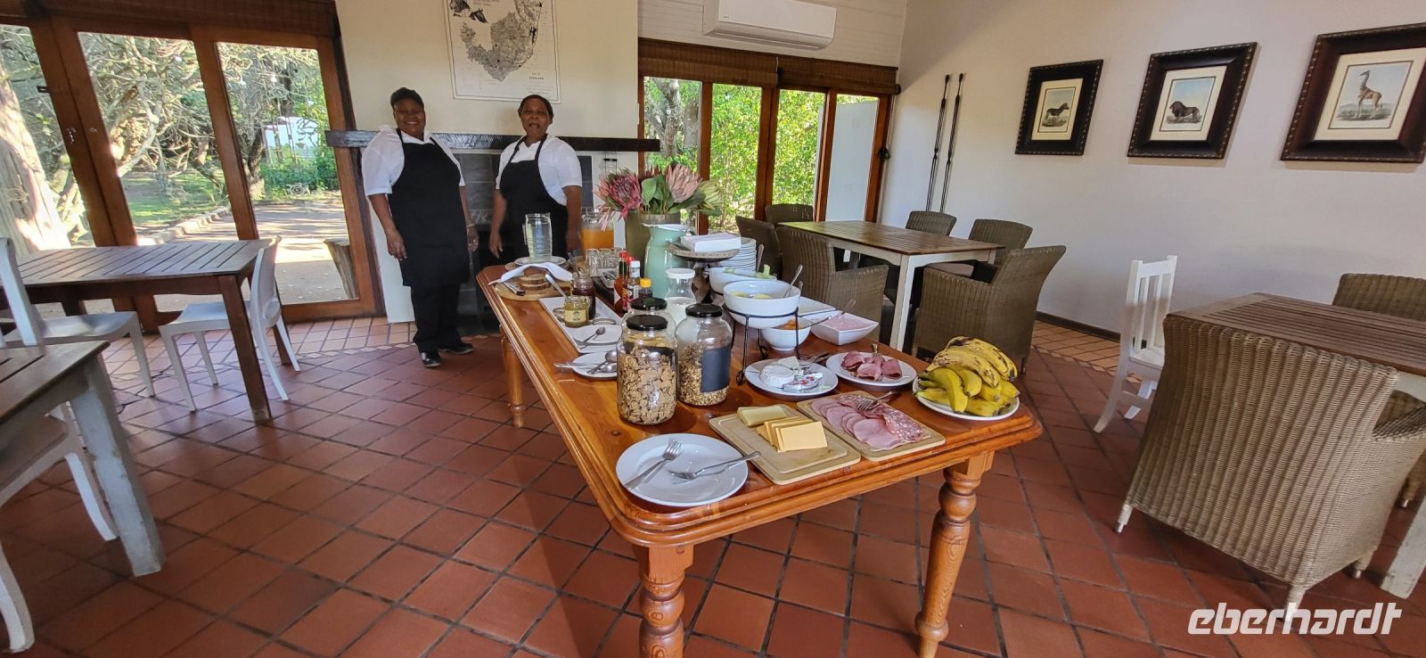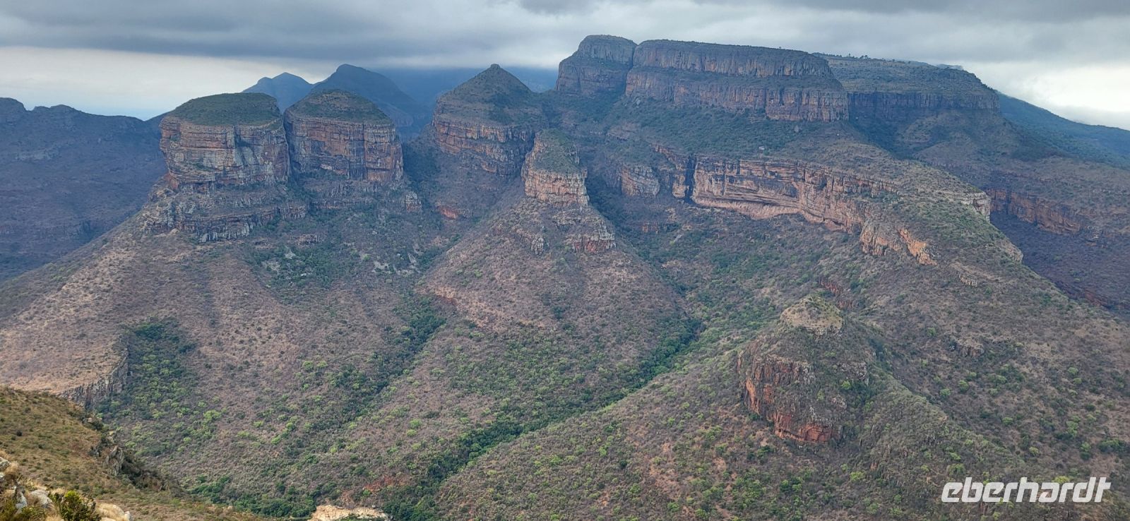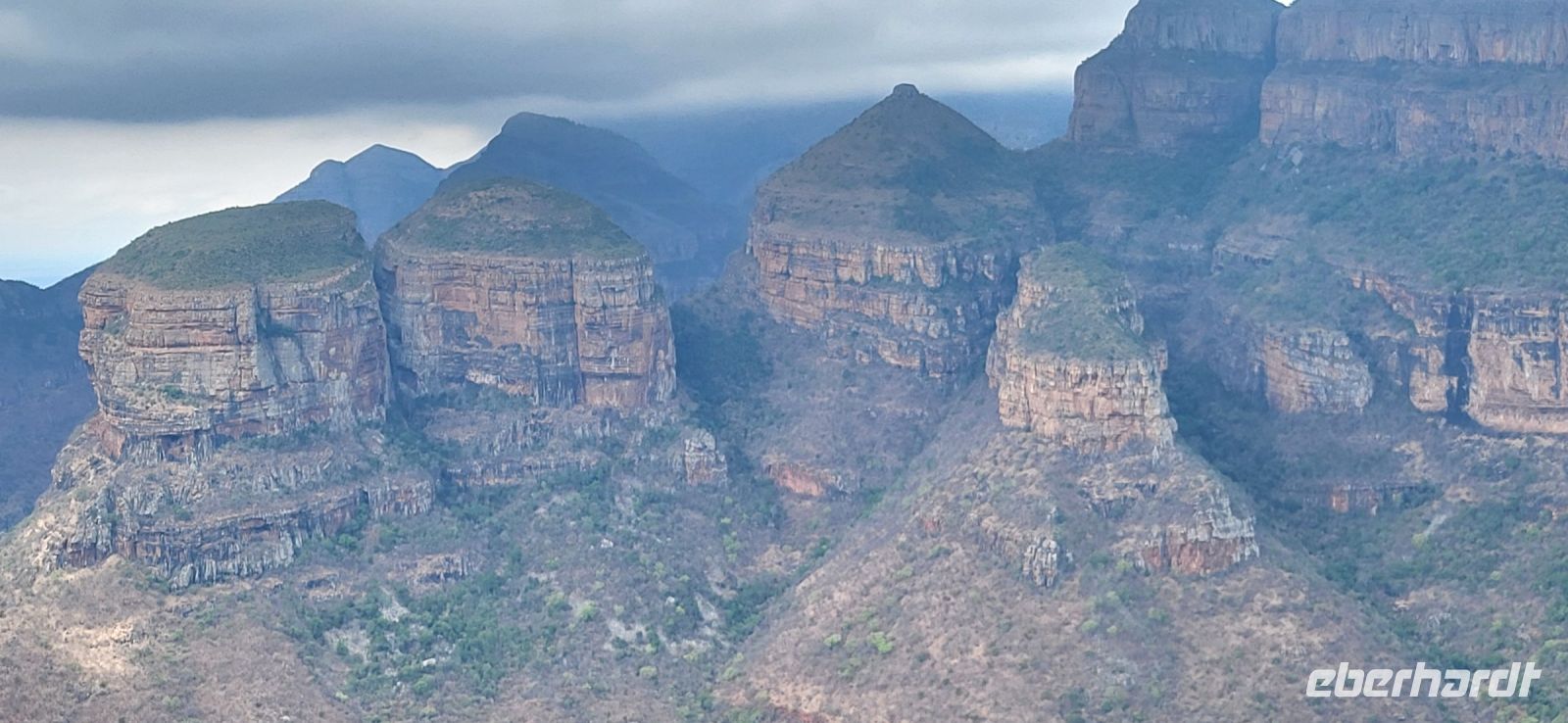 Nach einer geruhsamen Nacht auf 1700 m Höhe sehen wir uns zu einem gemütlichen Frühstück wieder. Umso froher sind wir, dass wir uns auf den Weg ins Tal machen, wo uns schon bald Wetterbesserung widerfährt. So begeben wir uns zunächst Richtung Pilgrim’s Rest. Dieses einstige Goldgräberstädtchen aus den 1870er Jahren lädt zu einem Spaziergang ein und wir fühlen uns 150 Jahre zurückversetzt. Entlang der Hauptstraße stehen noch viele alte Gebäude des damaligen Goldrausches, darunter auch das damalige Hotel mit berühmter Bar, die einst eine Kirche beinhaltete. Viele Goldsucher machten hier Rast oder tauschten sich aus. So auch die Namensgebung des Ortes: Rastplatz der Pilgerer. Weiter geht die Fahrt durch Graskop, einem Städtchen mit vielen Souvenirläden und dem berühmten Harry’s Pancakes, welches wir am Nachmittag ansteuern werden. An den sogenannten Bourke’s Luck Potholes angekommen, spazieren wir zu den bekannten Auswaschungen, den sogenannten Potholes. Hier zeigt die Natur ein besonderes Spektakel. Viele ausgewaschene Stellen weisen auf die enorme Wasserkraft endlos vergangener Jahre hin, ein beeindruckendes Naturschauspiel. Weiter geht unsere heutige Tour zum Blyde River Canyon und den 3 Rondaveln. Auf ca. 1300 m Höhe haben wir einen atemberaubenden Ausblick auf den unter uns liegenden See und Schlucht. Eine unglaubliche Natur und wir genießen die Weite. Abschließend zieht uns die Panoramaroute noch zu „God’s Window“, also Gottes Fenster, wo wir bei gutem Wetter aus luftiger Höhe eine beeindruckende Aussicht auf das unter uns liegende Tag haben. An manchen Tagen könnte man bei guter Fernsicht sogar bis an die Grenze zu Mosambik sehen. So nicht heute, denn der Nebel hat uns wieder eingeholt. Was soll’s, wir sind sehr froh, alle anderen Natursehenswürdigkeiten so herrlich erlebt zu haben und so fahren wir zurück nach Graskop, wo wir bei Harry’s Pancakes hausgemachte Pfannkuchen, herzhaft oder süß, genießen. Dazu leckere Kaffeespezialitäten, während sich draußen das Wetter zusehens verschlechtert. Danach geht es zurück zu unserer Lodge, wir zünden die Kamine an und machen es uns gemütlich. Abends sehen wir uns wieder zum schmackhaften Beisammensein und sind schon gespannt, was wir morgen auf unserer ersten Safari im Krüger Nationalpark erleben werden.
