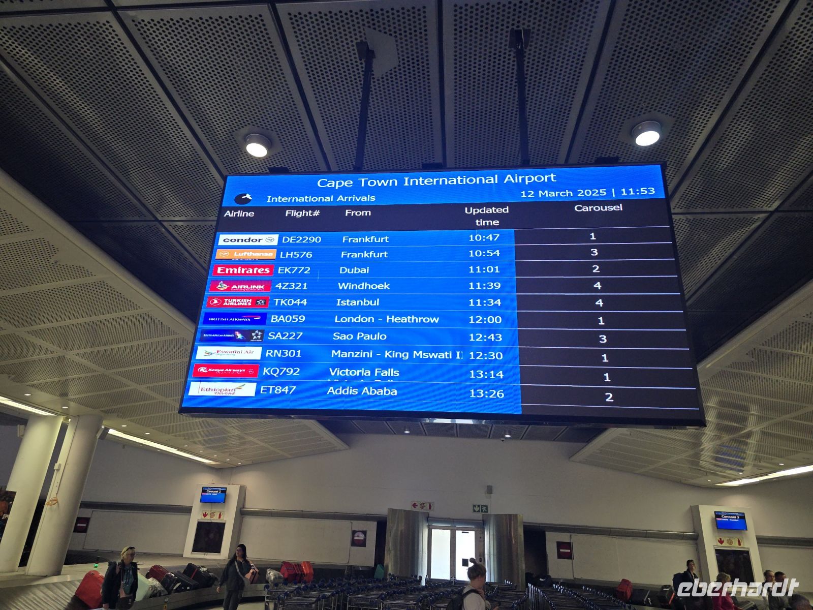 Nach den Einreise- und Transferprozeduren am Tambo International ging es weiter zum Gate, wo unser Jumbo bereits auf uns wartete. Noch war genug Zeit für letzte Souvenireinkäufe, bevor wir unsere Sitze einnahmen und uns Richtung Heimat verabschiedeten. Etwas essen, ein paar Stunden schlafen – und schon war auch dieser 11-stündige Flug Geschichte.