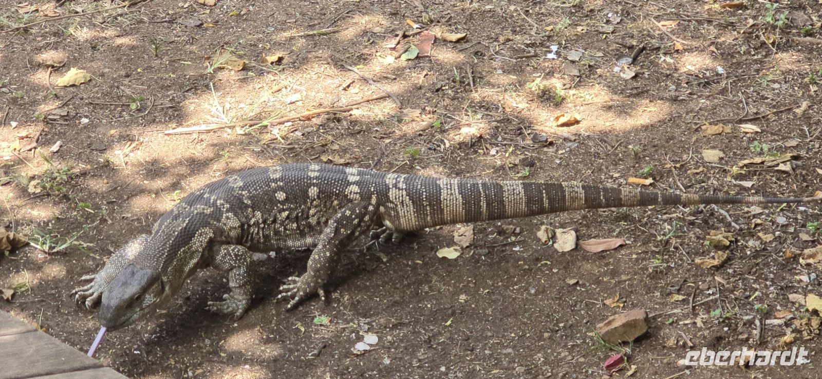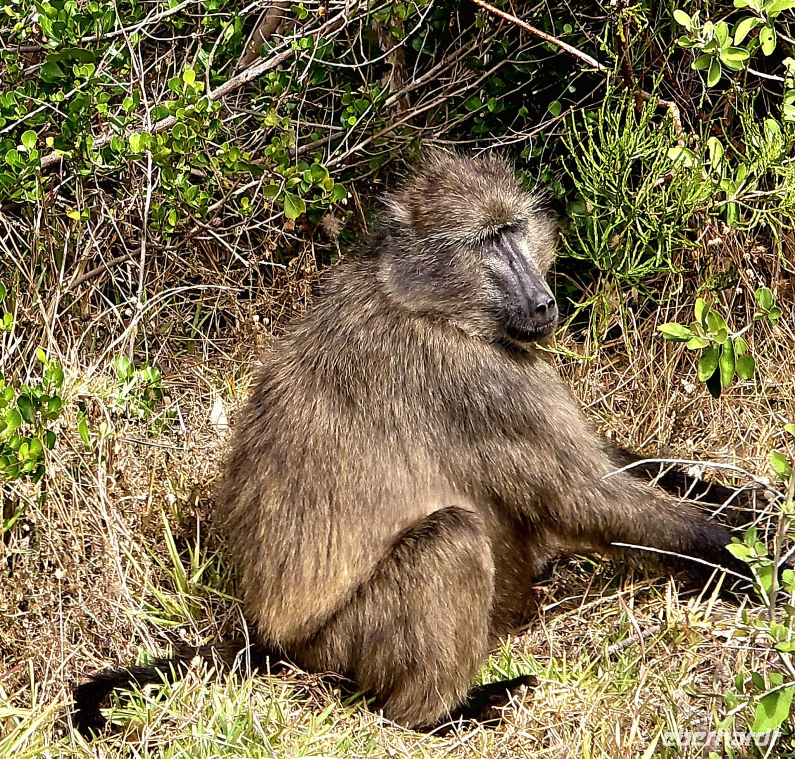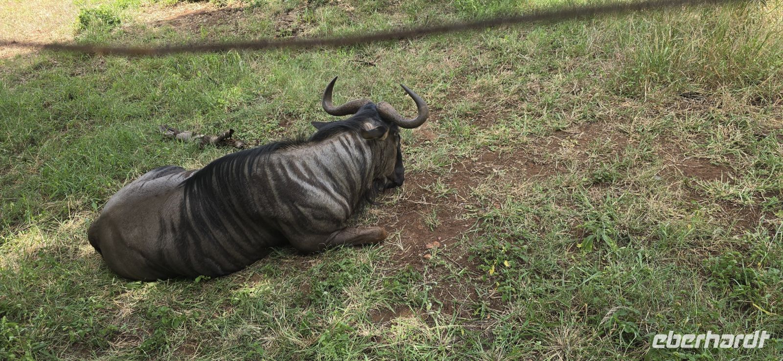 Nach diesem Erlebnis wird es Zeit für eine Mittagspause auf einer Lodge. Während wir uns stärken, fällt plötzlich ein Weißkopfwaran spektakulär von einem Baum – scheinbar völlig unbeeindruckt von seinem eigenen Stunt. Gleich neben dem Zaun liegt ein Gnu, das sich ebenfalls nicht aus der Ruhe bringen lässt, während eine Horde Affen umherflitzt und sich mit beeindruckenden Akrobatikeinlagen gegenseitig jagt.