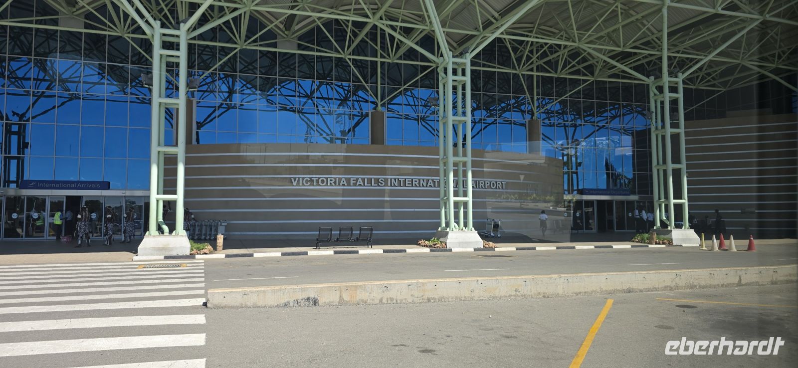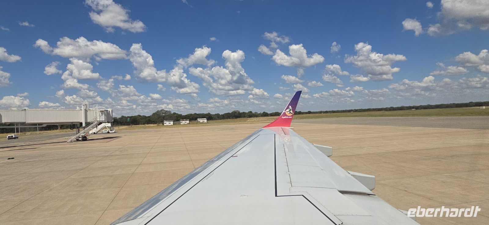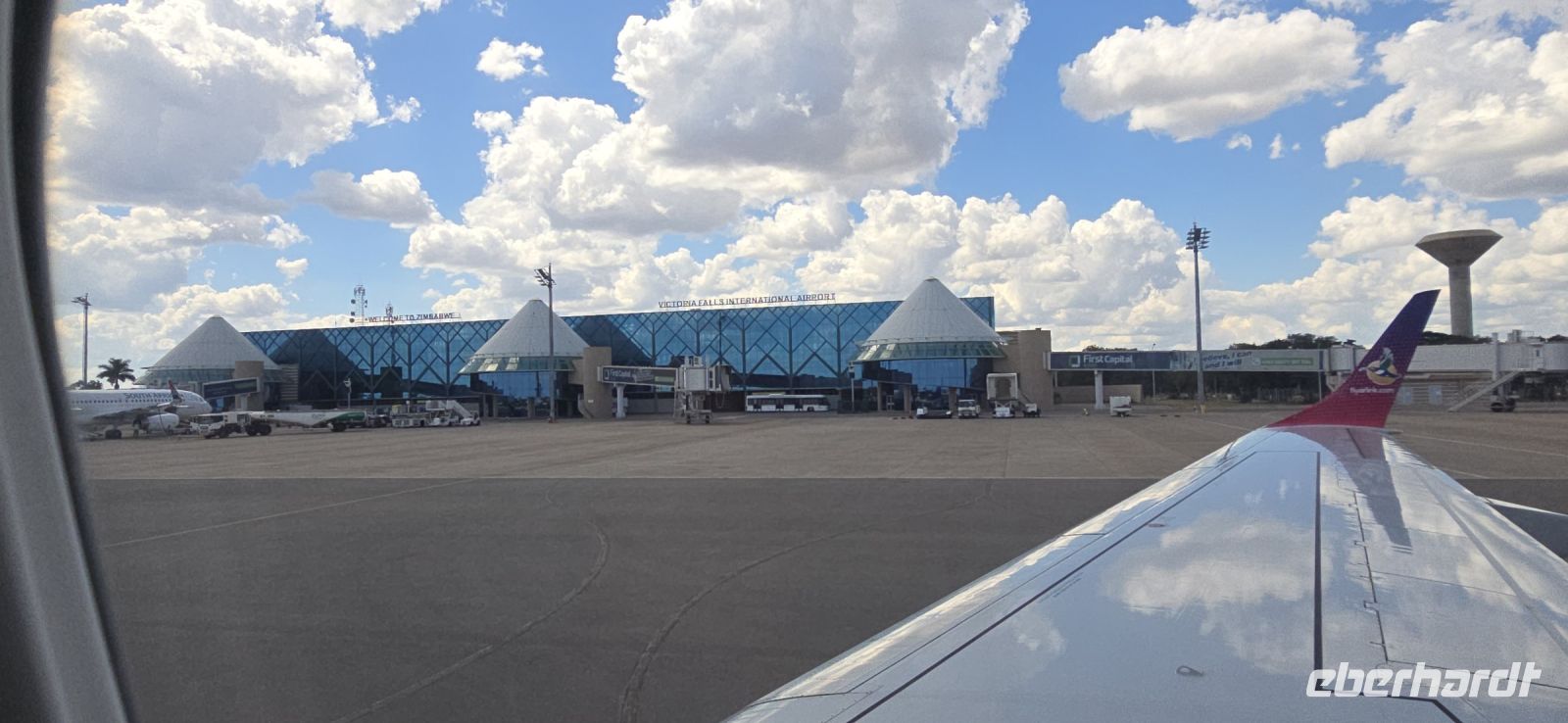 Heute hieß es: Auf nach Simbabwe! Nach einem ausgiebigen Frühstück brachte uns Piet zum O.R. Tambo Flughafen in Johannesburg. Der Ablauf verlief reibungslos, und wir konnten uns in aller Ruhe von Sonet verabschieden, bevor wir zum Gate gingen. Mit Air Link ging es dann weiter nach Victoria Falls, begleitet von gutem Service an Bord. Schon beim Landeanflug bot sich uns ein spektakulärer Anblick: Die Gischt der Fälle ragte hunderte Meter hoch aus dem Dschungel empor – ein vielversprechender Vorgeschmack auf das, was uns erwartete!