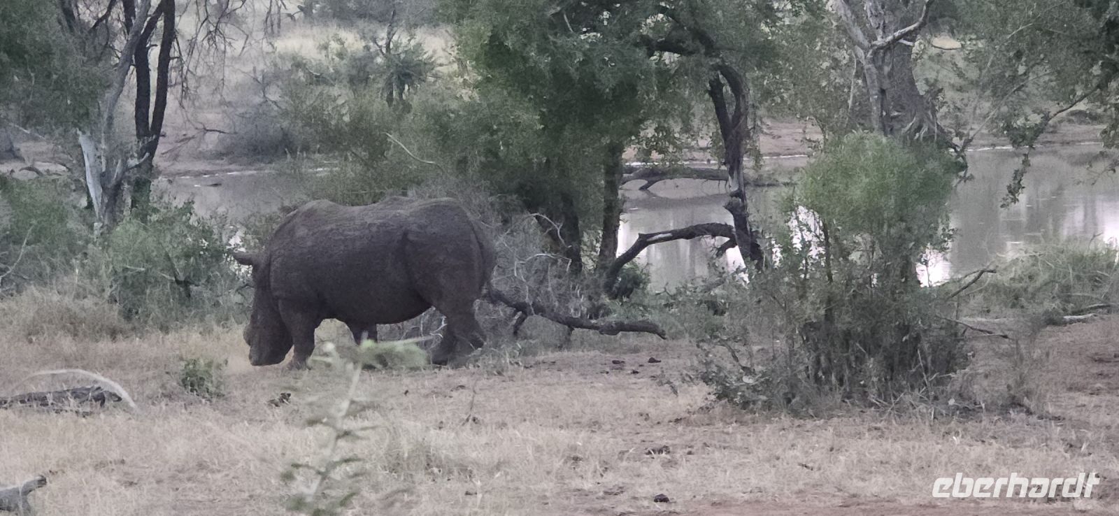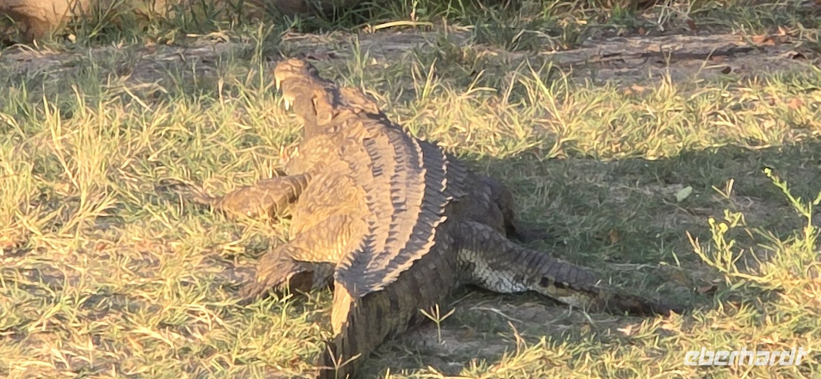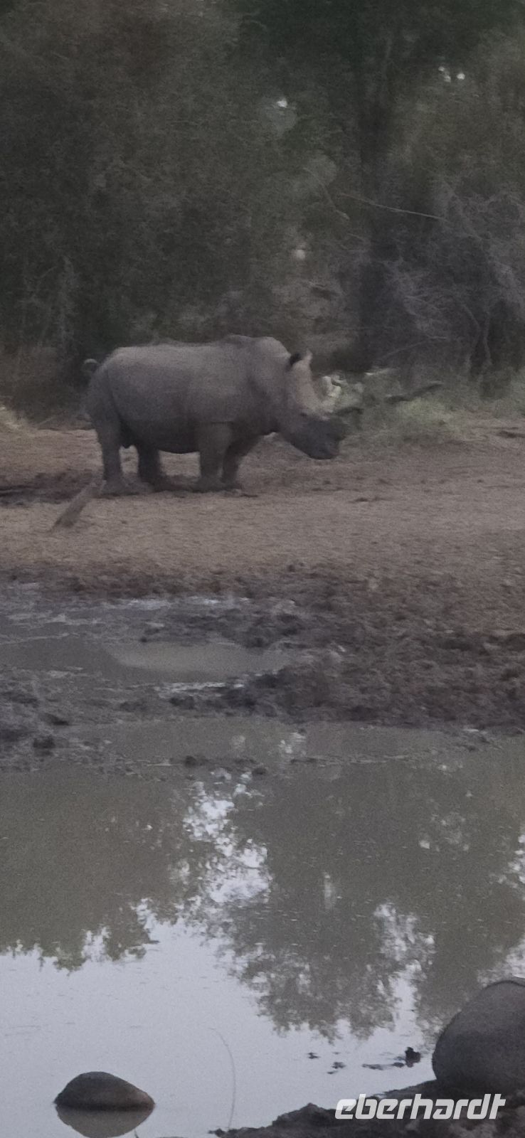 Plötzlich erblicken wir ein Babykrokodil, das sich flach duckt und blitzschnell im Tümpel verschwindet, als wir uns nähern. Kurz darauf erleben wir eine faszinierende Begegnung mit einer Gruppe von Nashörnern, die wir aus nächster Nähe beobachten können. Der Ranger beweist ein großartiges Gespür und platziert uns genau an der Stelle, an der sie die Straße überqueren. Ein weiterer Elefantenbulle sorgt für Spannung, als er sich zwischen unsere beiden Jeeps begibt. Anstatt den direkten Weg zu nehmen, entscheidet er sich, die Straße entlang zu spazieren, was einen unserer Jeeps dazu zwingt, vorsichtig rückwärts zu fahren, um ihm nicht im Weg zu stehen. In der Ferne können wir zudem zahlreiche Elefanten und Büffel erspähen – damit haben wir bereits drei der Big Five auf unserer Liste abgehakt.