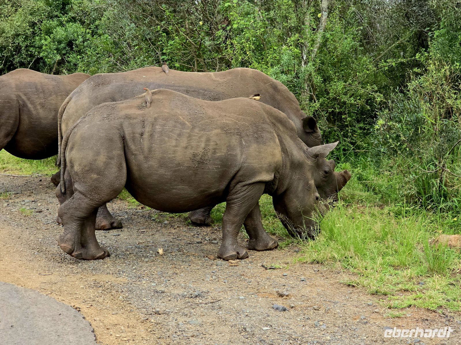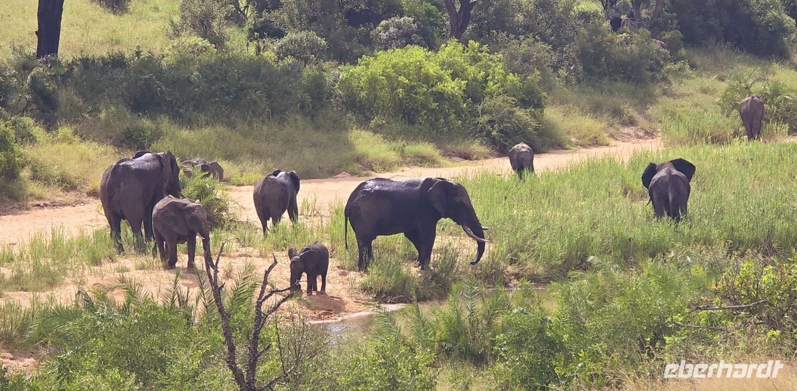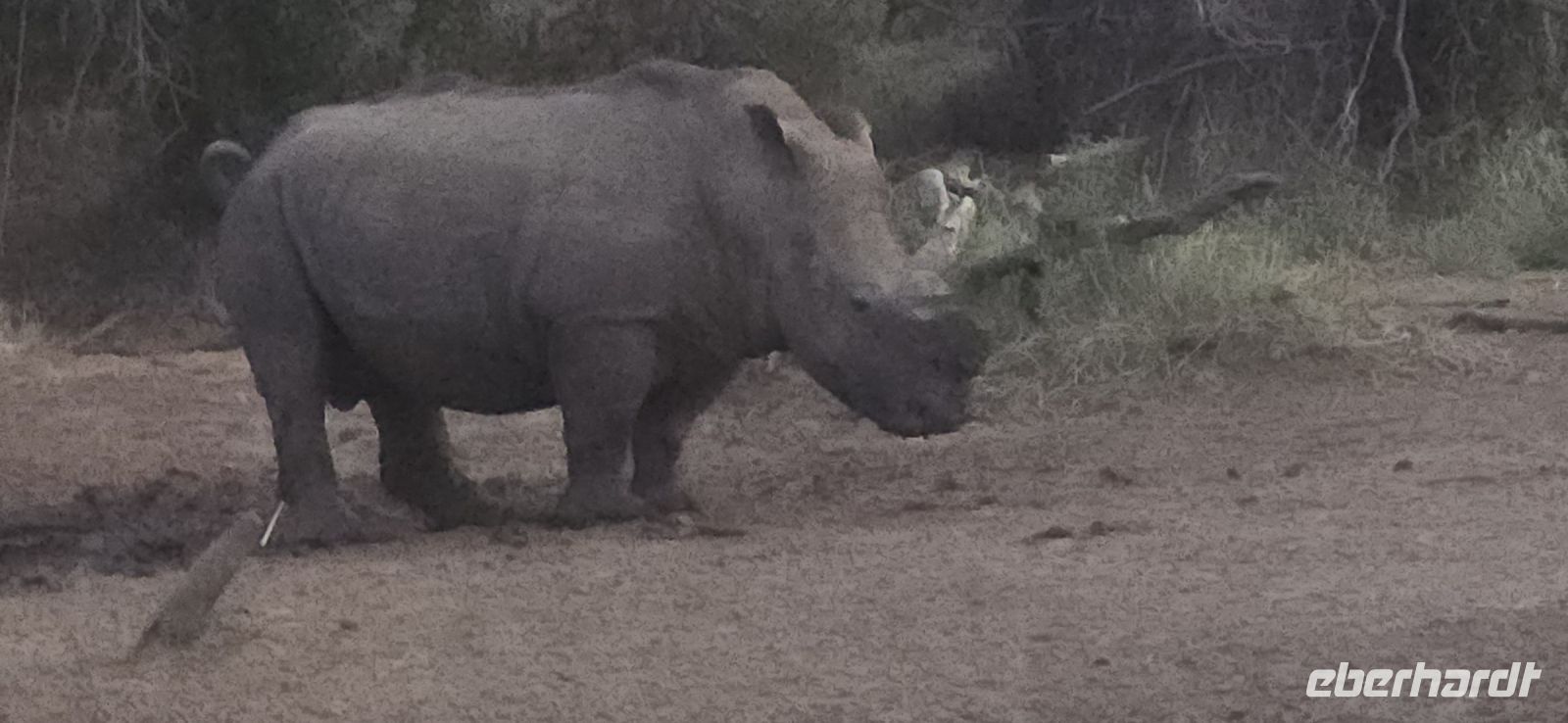 Plötzlich erblicken wir ein Babykrokodil, das sich flach duckt und blitzschnell im Tümpel verschwindet, als wir uns nähern. Kurz darauf erleben wir eine faszinierende Begegnung mit einer Gruppe von Nashörnern, die wir aus nächster Nähe beobachten können. Der Ranger beweist ein großartiges Gespür und platziert uns genau an der Stelle, an der sie die Straße überqueren. Ein weiterer Elefantenbulle sorgt für Spannung, als er sich zwischen unsere beiden Jeeps begibt. Anstatt den direkten Weg zu nehmen, entscheidet er sich, die Straße entlang zu spazieren, was einen unserer Jeeps dazu zwingt, vorsichtig rückwärts zu fahren, um ihm nicht im Weg zu stehen. In der Ferne können wir zudem zahlreiche Elefanten und Büffel erspähen – damit haben wir bereits drei der Big Five auf unserer Liste abgehakt.