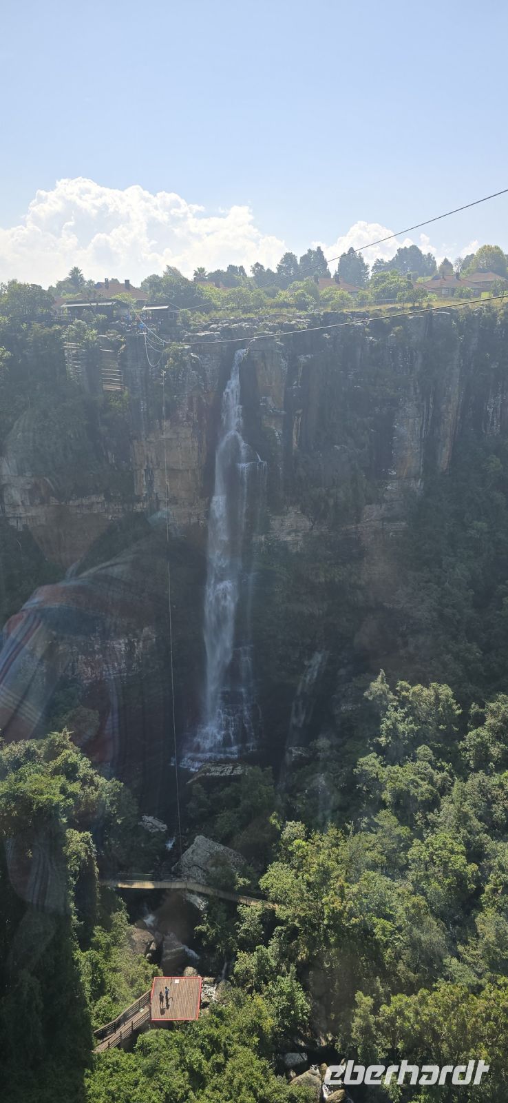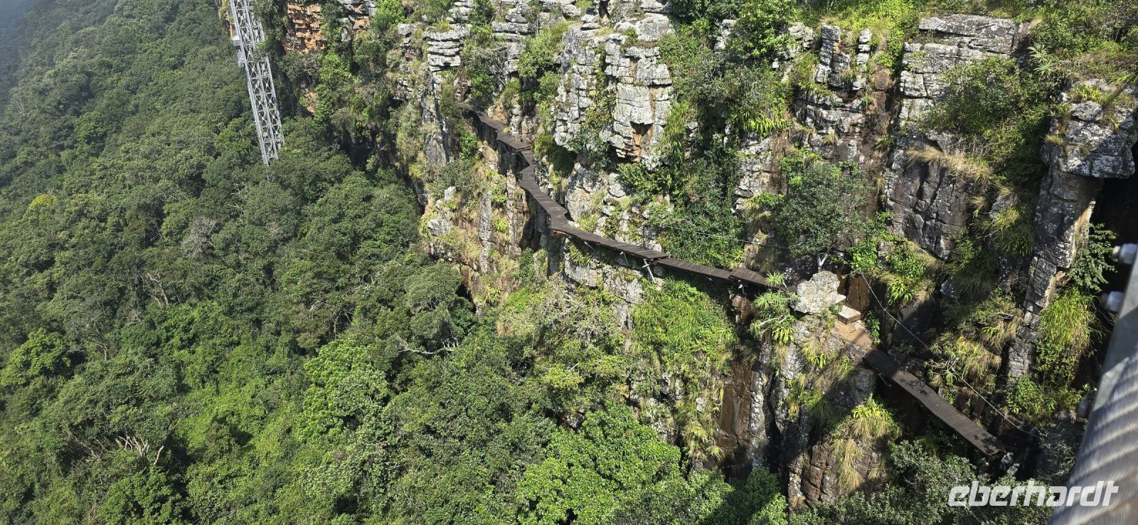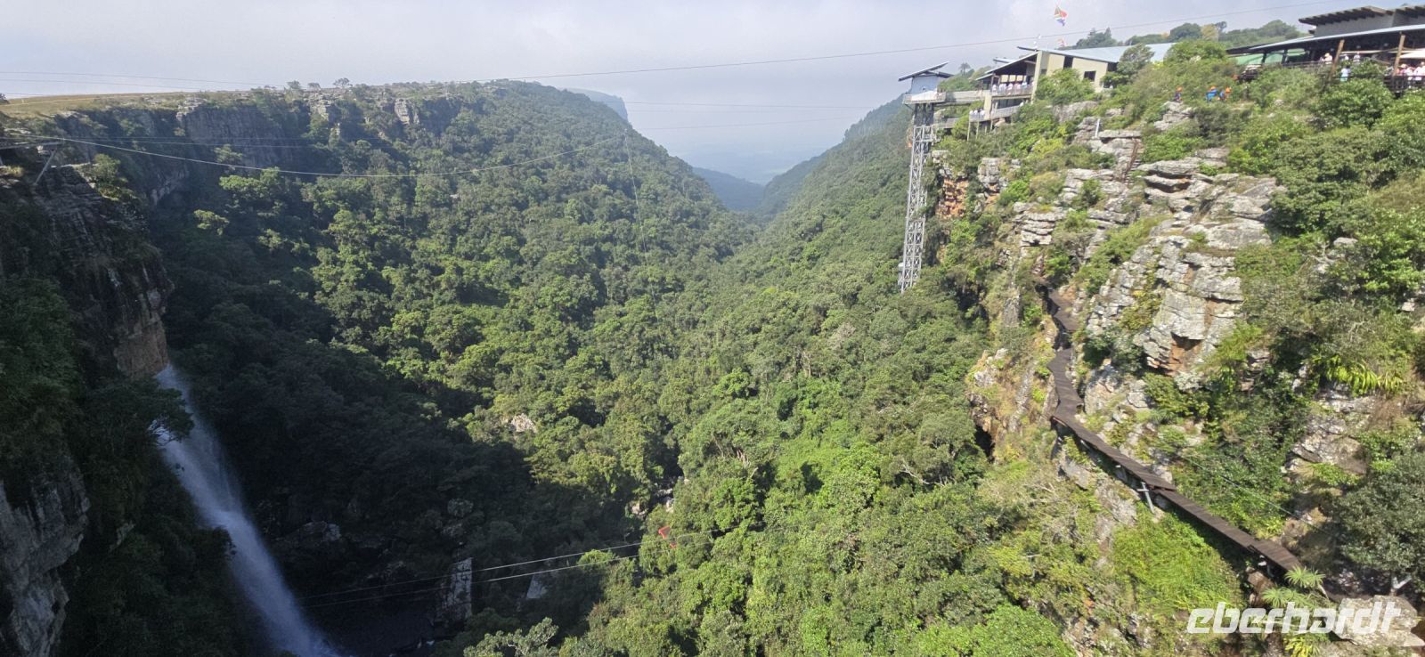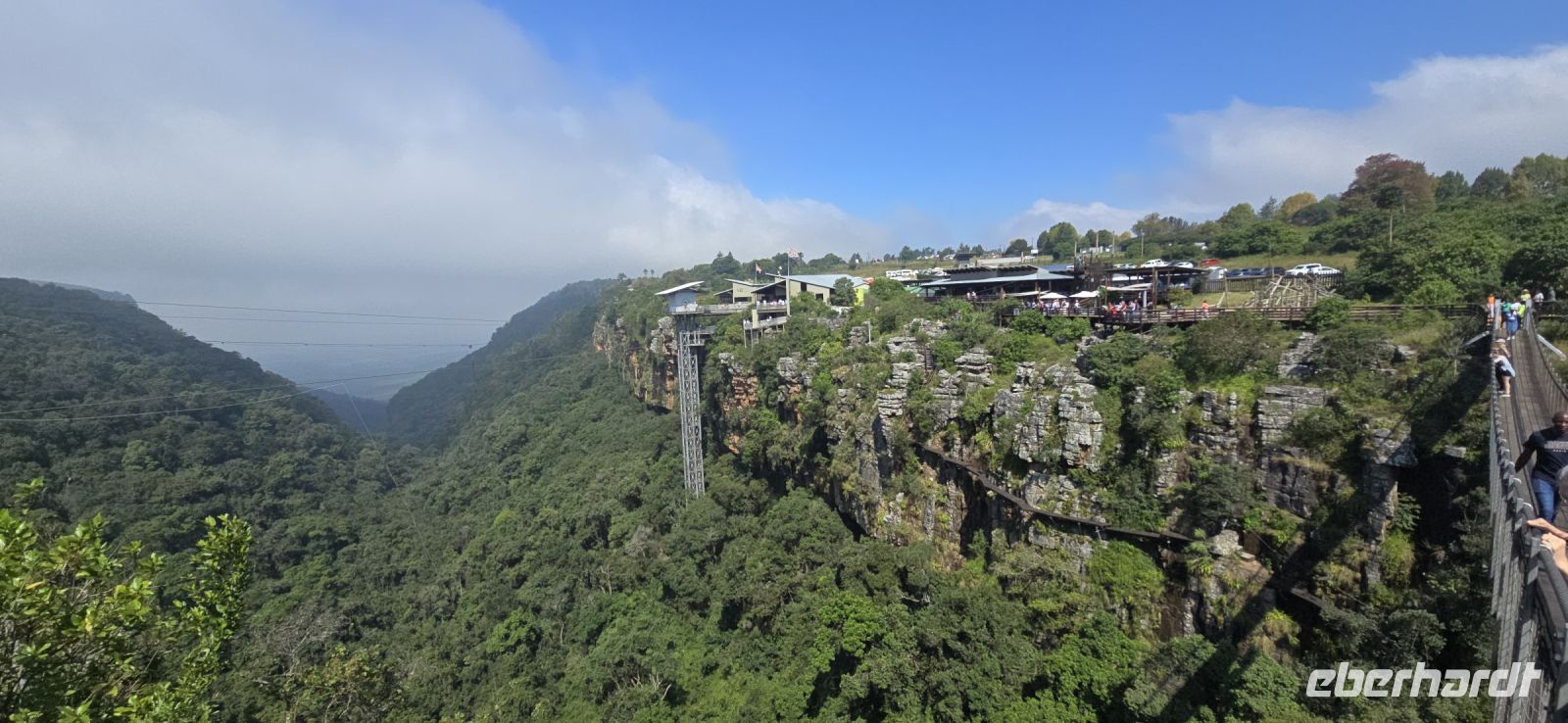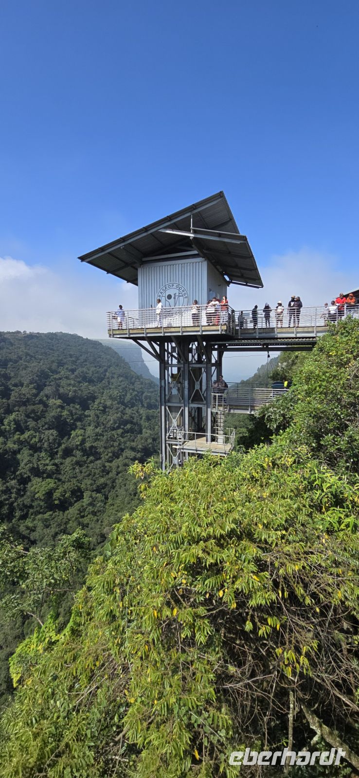God’s Window und das alternative Wonder View sind heute ebenfalls von einer dichten Wolkendecke verhüllt, sodass wir von oben nur eine weiße Wand sehen. Doch wir haben noch ein weiteres Highlight im Programm: Erstmals steuert eine Eberhardt-Reisegruppe den Graskop Gorge Panoramic Lift an – und die Premiere wird ein voller Erfolg! Eine spektakuläre Aussichtsplattform eröffnet uns einen atemberaubenden Blick, bevor uns der Panoramaaufzug tief in die Schlucht hinunterbringt. Unten erwartet uns ein faszinierender Wanderweg durch den Regenwald, gesäumt von informativen Schautafeln zur Flora und Fauna. Der Rundweg endet am Lift, der uns wieder an den Rand der Schlucht zurückbringt.