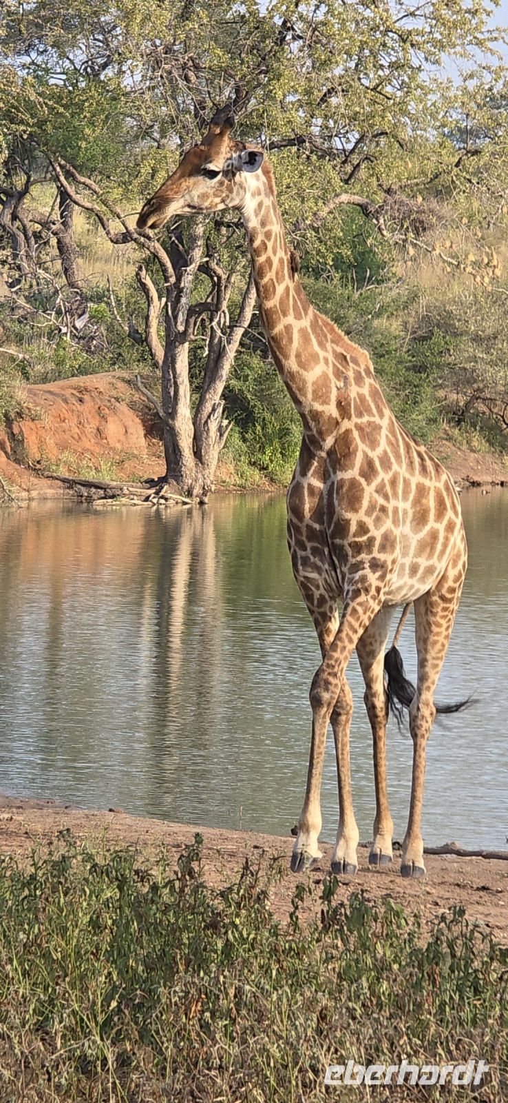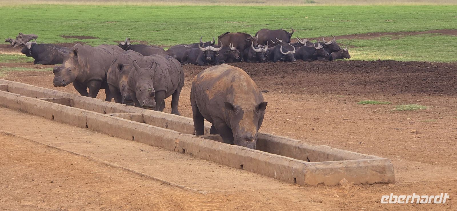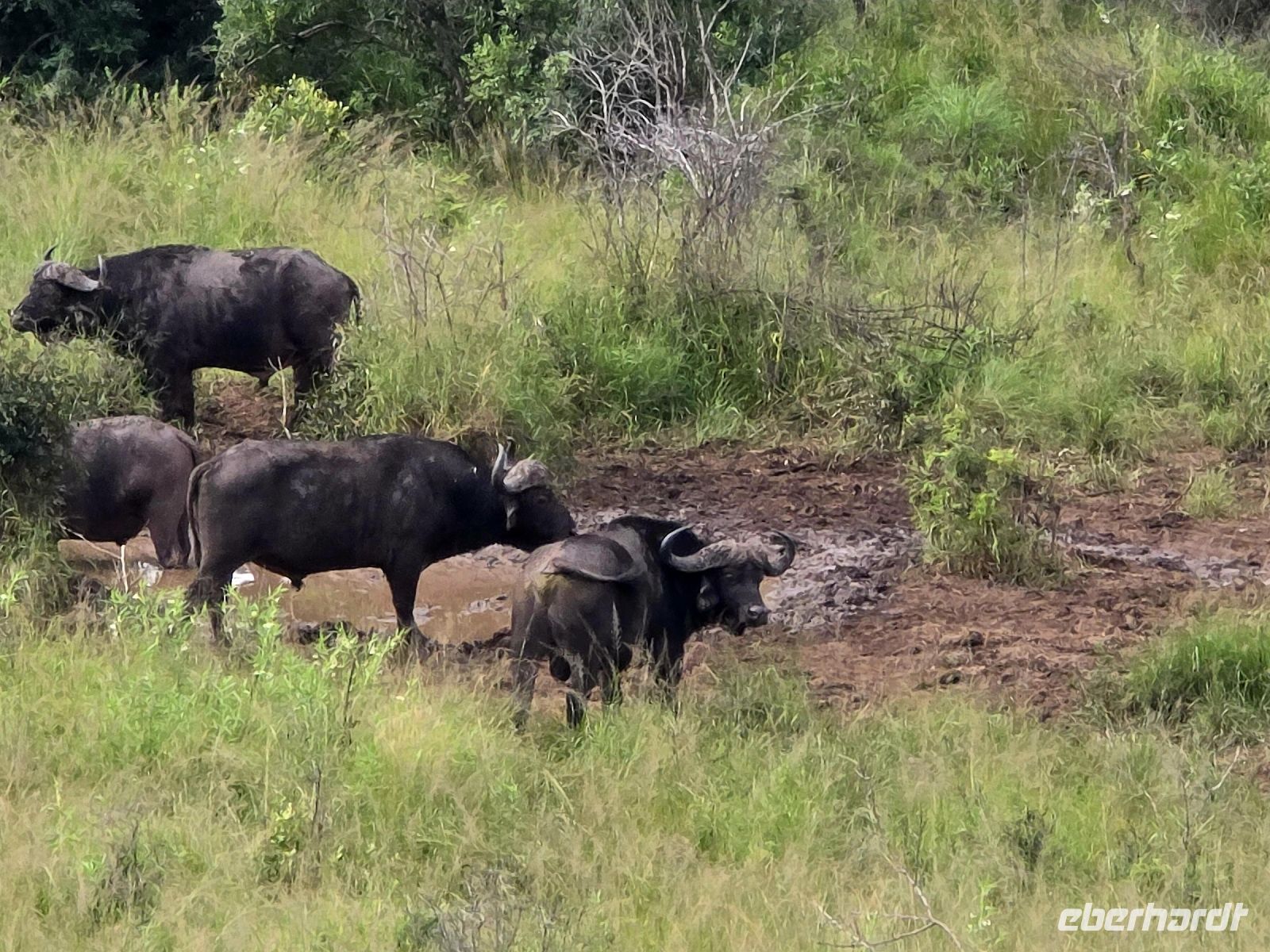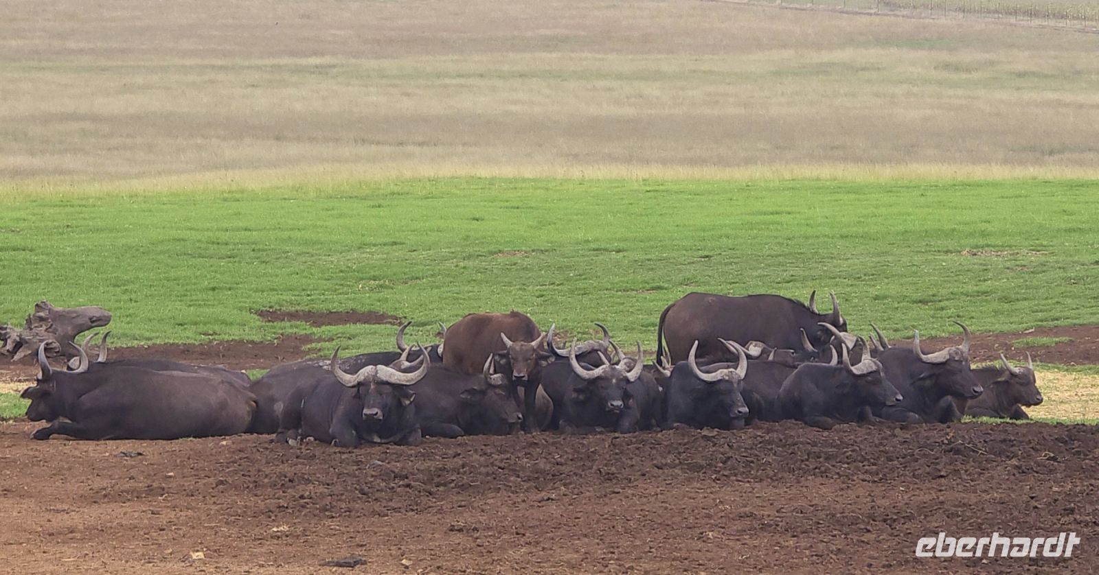 Und was für eine Show das ist: Zwei Giraffen am Wasserloch, die sich in dieser unnachahmlich unbeholfenen Weise tief nach unten beugen muss, um einen Schluck zu nehmen, während wir alle gespannt zuschauen und hoffen, dass sie es unfallfrei übersteht. Gleich daneben ein paar Zebras, die wie gewohnt aussehen, als kämen sie frisch aus der Designabteilung. Dann plötzlich Elefanten – majestätisch, entspannt, aber dennoch mit diesem unmissverständlichen „Wir haben hier Vorfahrt“-Blick. Antilopen huschen vorbei, ein Nashorn steht träge in der Landschaft, und mittendrin eine riesige Büffelherde, die sich scheinbar absichtlich so aufstellt, dass wir uns mitten unter ihnen wiederfinden. Die alten Bullen mustern uns mit Blicken, die irgendwo zwischen „Was wollt ihr hier?“ und „Wenn ihr jetzt noch näher kommt, gibt’s Ärger!“ schwanken. Wir sind beeindruckt – und ein kleines bisschen froh, dass wir im Jeep sitzen.