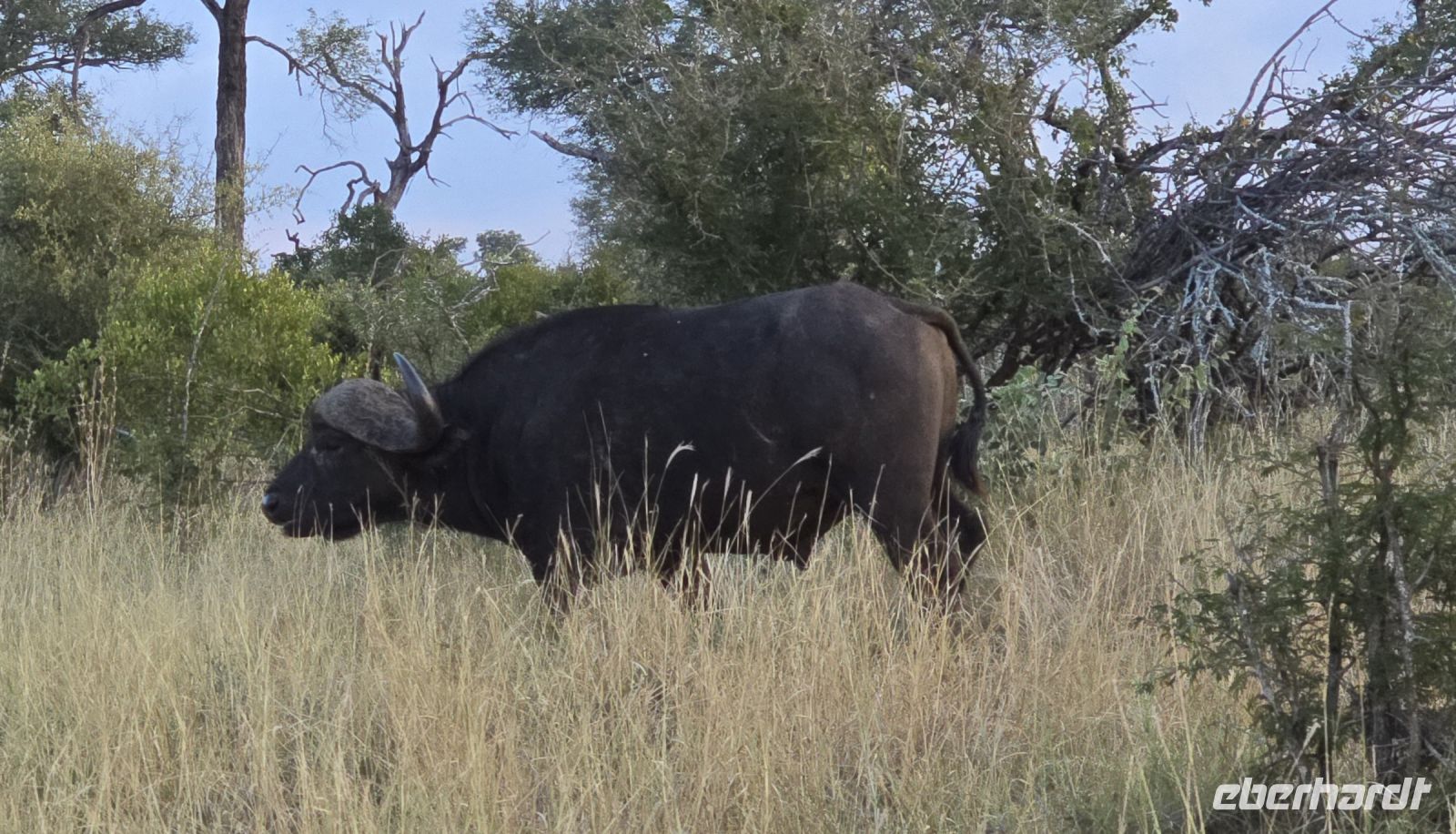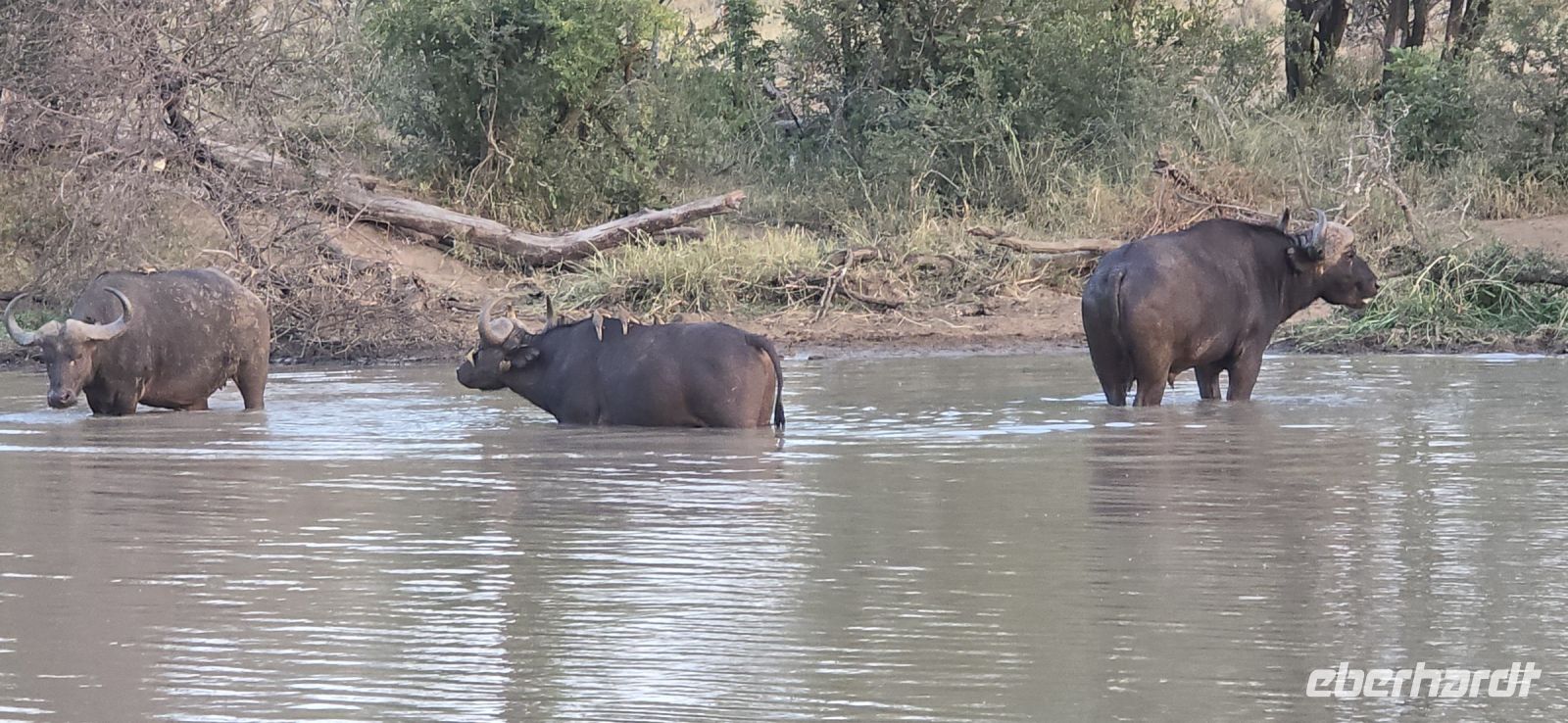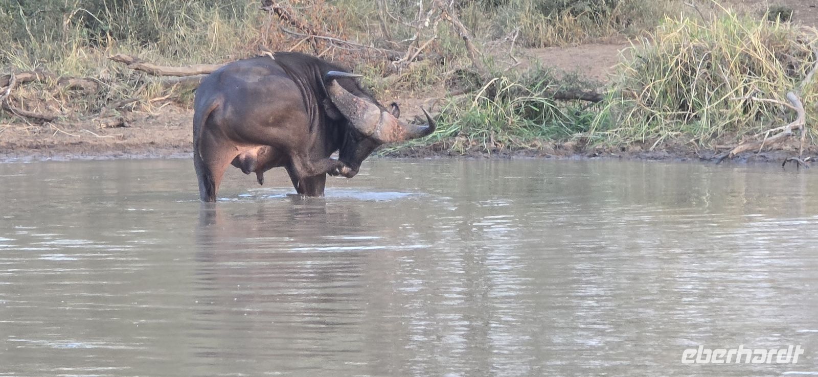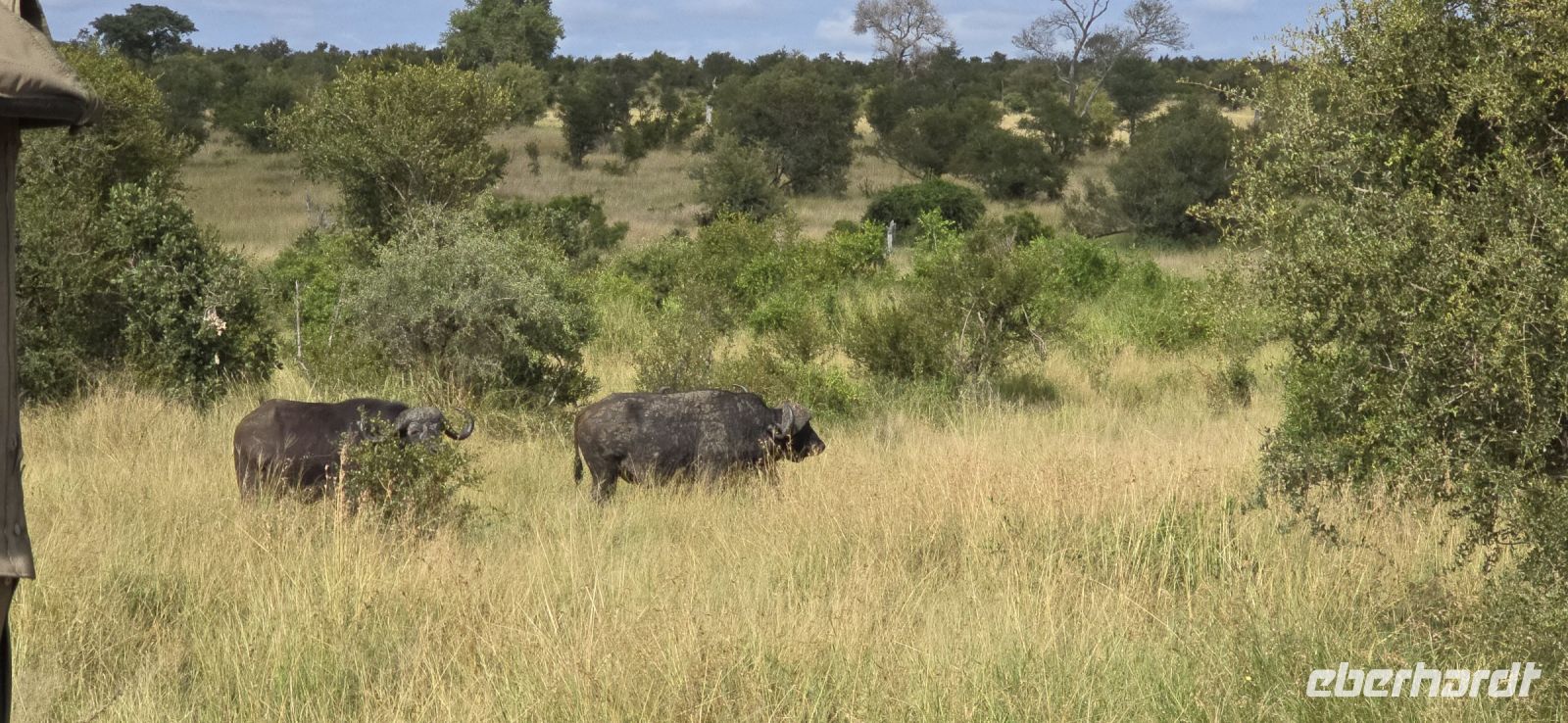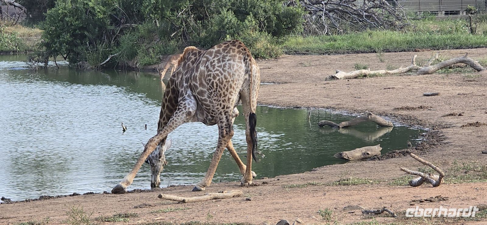 Und was für eine Show das ist: Zwei Giraffen am Wasserloch, die sich in dieser unnachahmlich unbeholfenen Weise tief nach unten beugen muss, um einen Schluck zu nehmen, während wir alle gespannt zuschauen und hoffen, dass sie es unfallfrei übersteht. Gleich daneben ein paar Zebras, die wie gewohnt aussehen, als kämen sie frisch aus der Designabteilung. Dann plötzlich Elefanten – majestätisch, entspannt, aber dennoch mit diesem unmissverständlichen „Wir haben hier Vorfahrt“-Blick. Antilopen huschen vorbei, ein Nashorn steht träge in der Landschaft, und mittendrin eine riesige Büffelherde, die sich scheinbar absichtlich so aufstellt, dass wir uns mitten unter ihnen wiederfinden. Die alten Bullen mustern uns mit Blicken, die irgendwo zwischen „Was wollt ihr hier?“ und „Wenn ihr jetzt noch näher kommt, gibt’s Ärger!“ schwanken. Wir sind beeindruckt – und ein kleines bisschen froh, dass wir im Jeep sitzen.