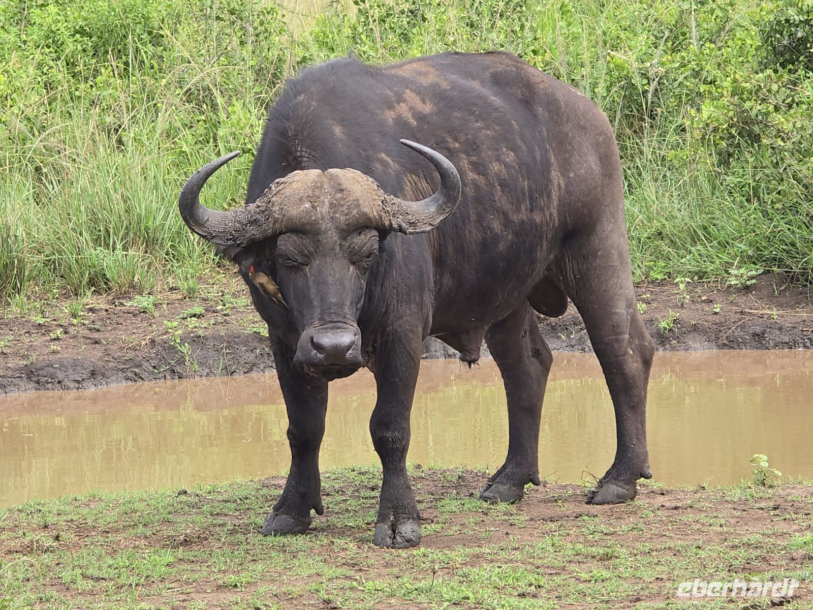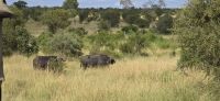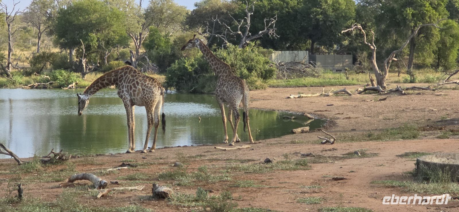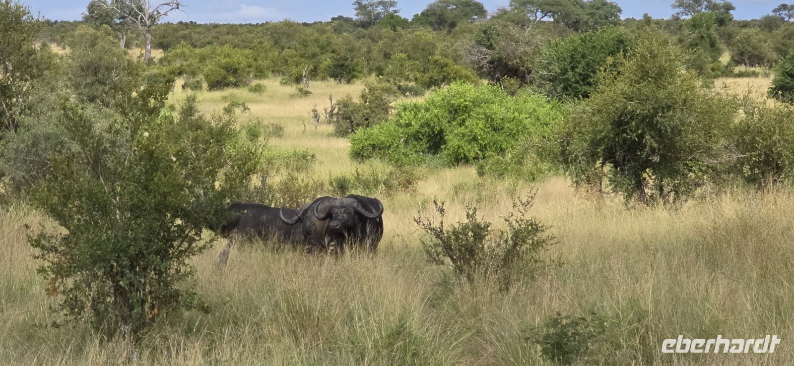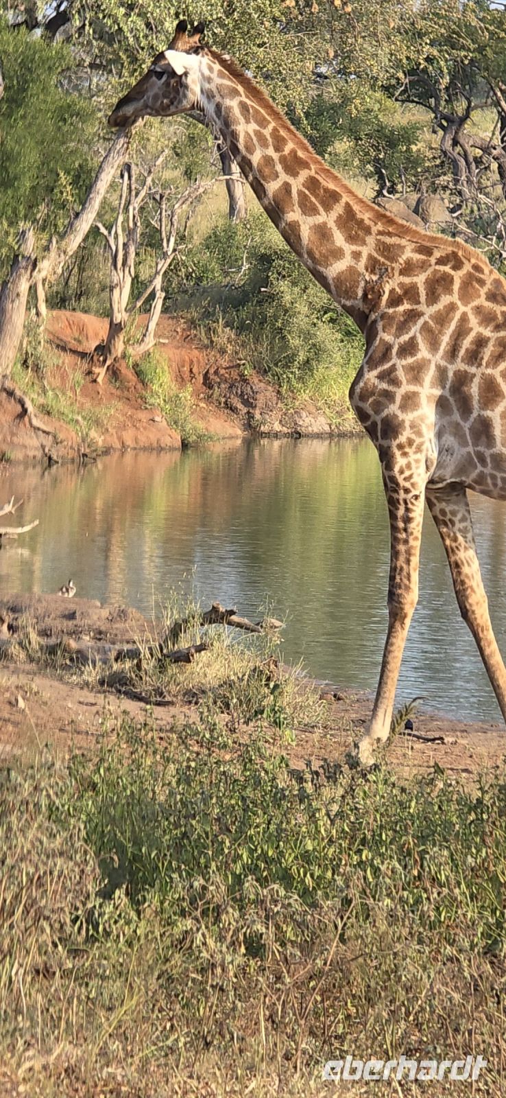 Und was für eine Show das ist: Zwei Giraffen am Wasserloch, die sich in dieser unnachahmlich unbeholfenen Weise tief nach unten beugen muss, um einen Schluck zu nehmen, während wir alle gespannt zuschauen und hoffen, dass sie es unfallfrei übersteht. Gleich daneben ein paar Zebras, die wie gewohnt aussehen, als kämen sie frisch aus der Designabteilung. Dann plötzlich Elefanten – majestätisch, entspannt, aber dennoch mit diesem unmissverständlichen „Wir haben hier Vorfahrt“-Blick. Antilopen huschen vorbei, ein Nashorn steht träge in der Landschaft, und mittendrin eine riesige Büffelherde, die sich scheinbar absichtlich so aufstellt, dass wir uns mitten unter ihnen wiederfinden. Die alten Bullen mustern uns mit Blicken, die irgendwo zwischen „Was wollt ihr hier?“ und „Wenn ihr jetzt noch näher kommt, gibt’s Ärger!“ schwanken. Wir sind beeindruckt – und ein kleines bisschen froh, dass wir im Jeep sitzen.