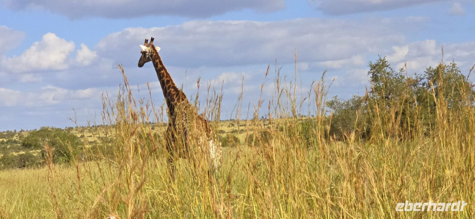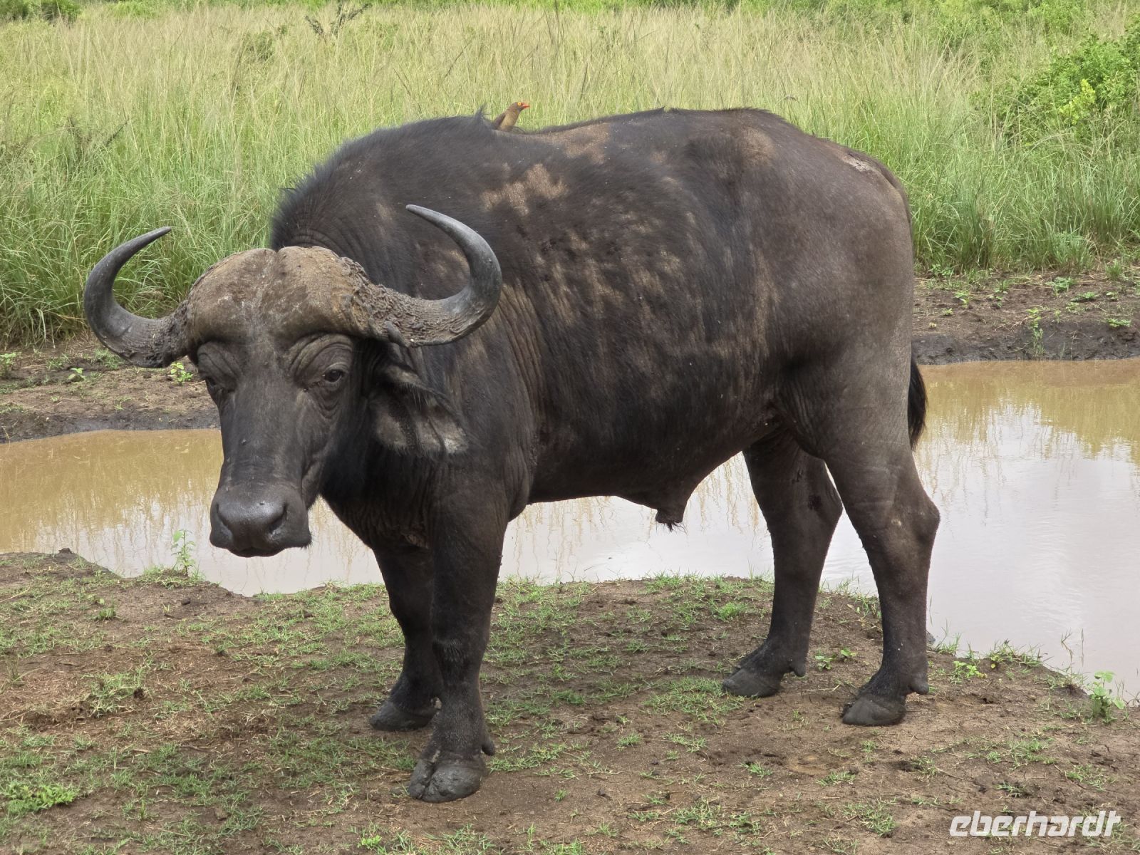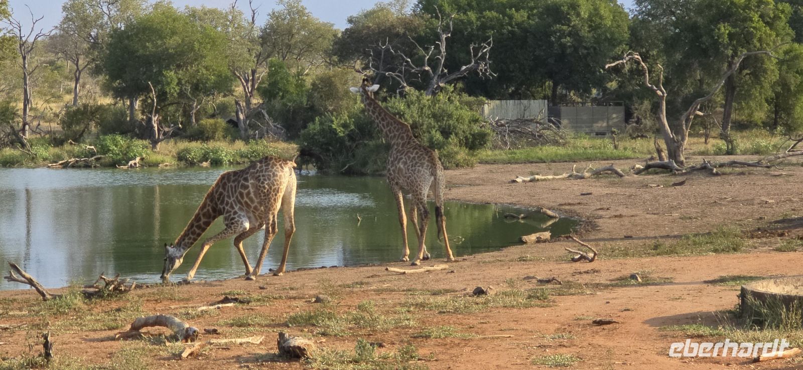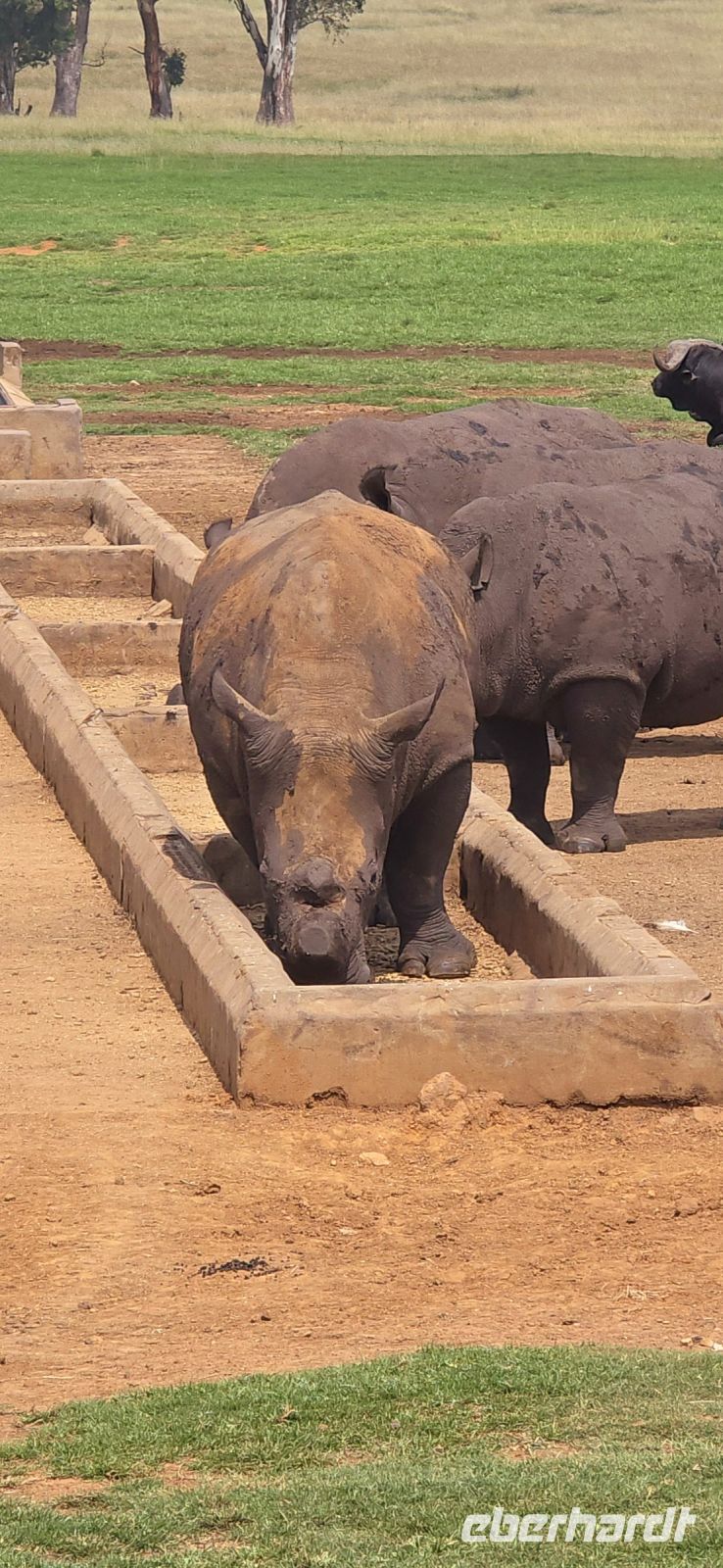 Und was für eine Show das ist: Zwei Giraffen am Wasserloch, die sich in dieser unnachahmlich unbeholfenen Weise tief nach unten beugen muss, um einen Schluck zu nehmen, während wir alle gespannt zuschauen und hoffen, dass sie es unfallfrei übersteht. Gleich daneben ein paar Zebras, die wie gewohnt aussehen, als kämen sie frisch aus der Designabteilung. Dann plötzlich Elefanten – majestätisch, entspannt, aber dennoch mit diesem unmissverständlichen „Wir haben hier Vorfahrt“-Blick. Antilopen huschen vorbei, ein Nashorn steht träge in der Landschaft, und mittendrin eine riesige Büffelherde, die sich scheinbar absichtlich so aufstellt, dass wir uns mitten unter ihnen wiederfinden. Die alten Bullen mustern uns mit Blicken, die irgendwo zwischen „Was wollt ihr hier?“ und „Wenn ihr jetzt noch näher kommt, gibt’s Ärger!“ schwanken. Wir sind beeindruckt – und ein kleines bisschen froh, dass wir im Jeep sitzen.