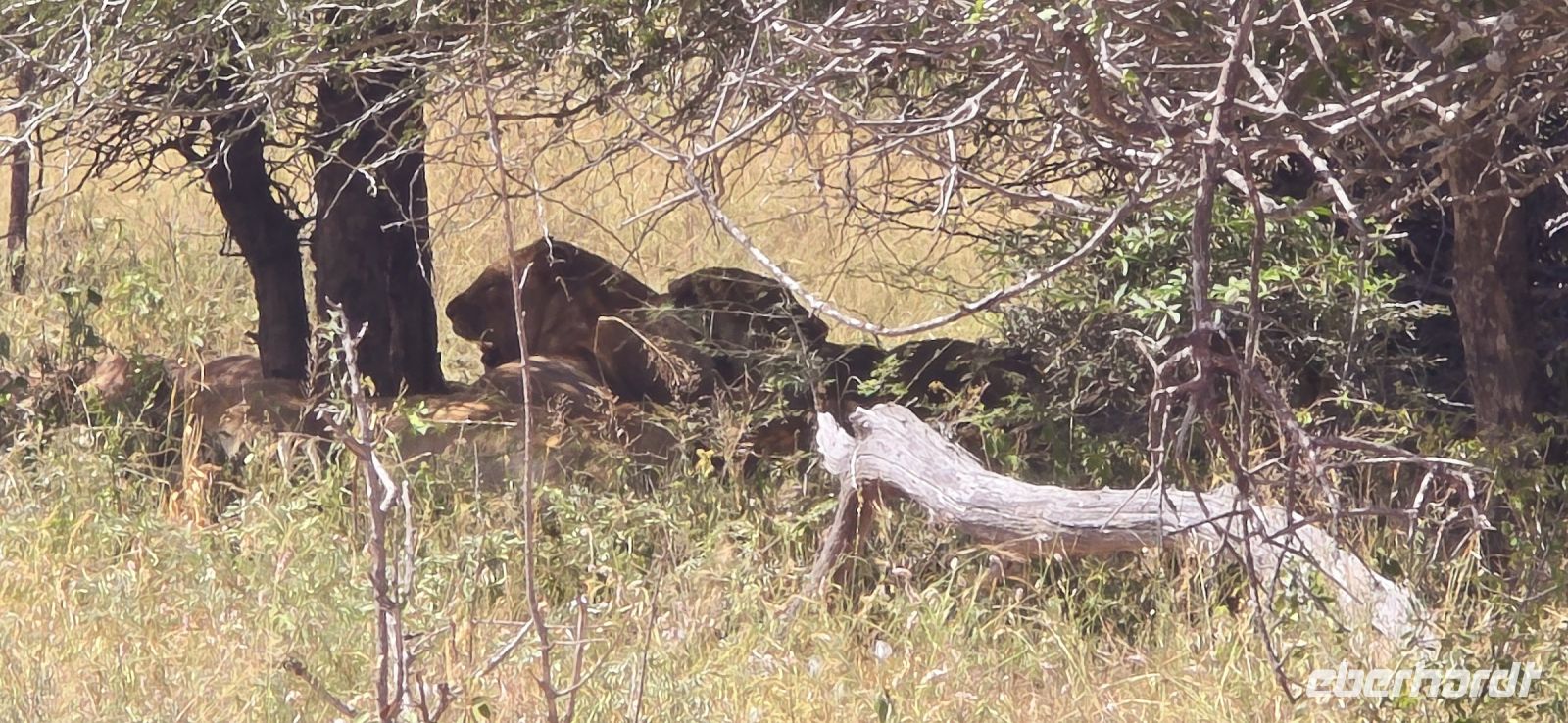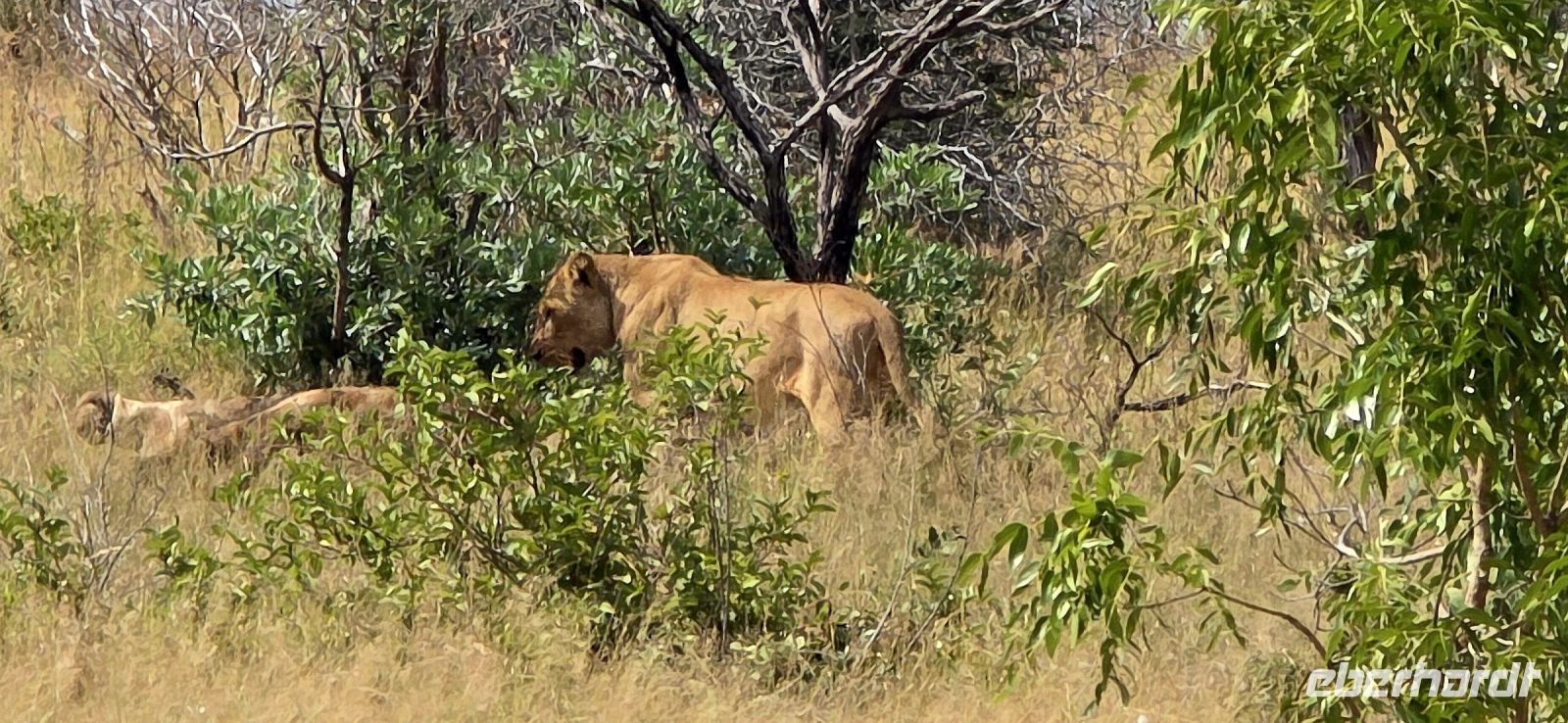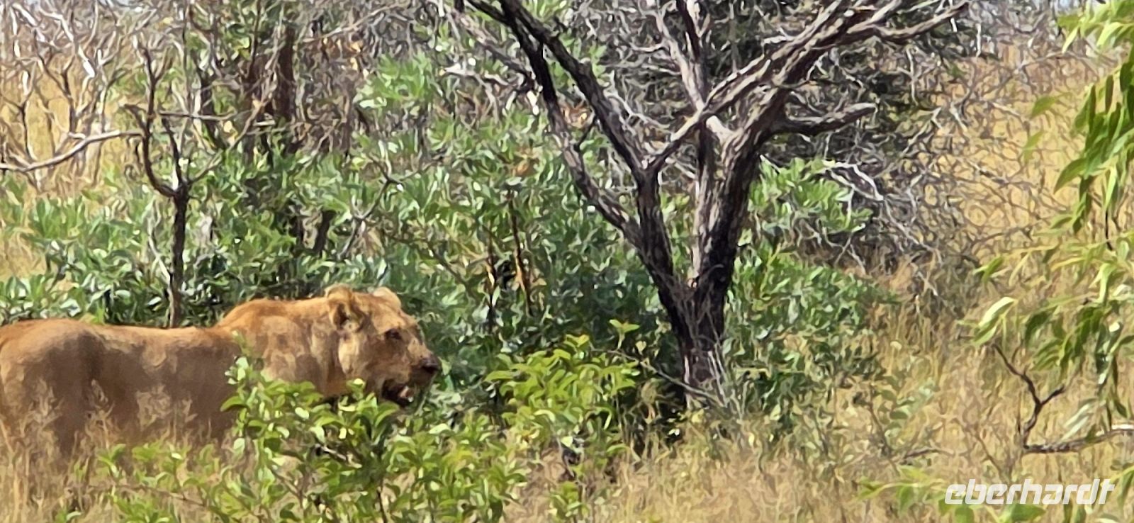 Dann endlich die ersten Löwen! Majestätisch, aber faul, dösen sie im Schatten und lassen sich von uns nicht aus der Ruhe bringen. Perfektes Timing für unser Picknick-Frühstück, das wir inmitten exotischer Vögel genießen. Gut gestärkt geht es weiter – diesmal mit einer klaren Mission: mehr Löwen! Doch bevor wir fündig werden, erwartet uns eine Überraschung: ein ganzes Rudel afrikanischer Wildhunde, eine echte Seltenheit! Sie umrunden unser Fahrzeug, wirken ruhelos und scheinen nur auf den richtigen Moment zu warten, um auf Jagd zu gehen.