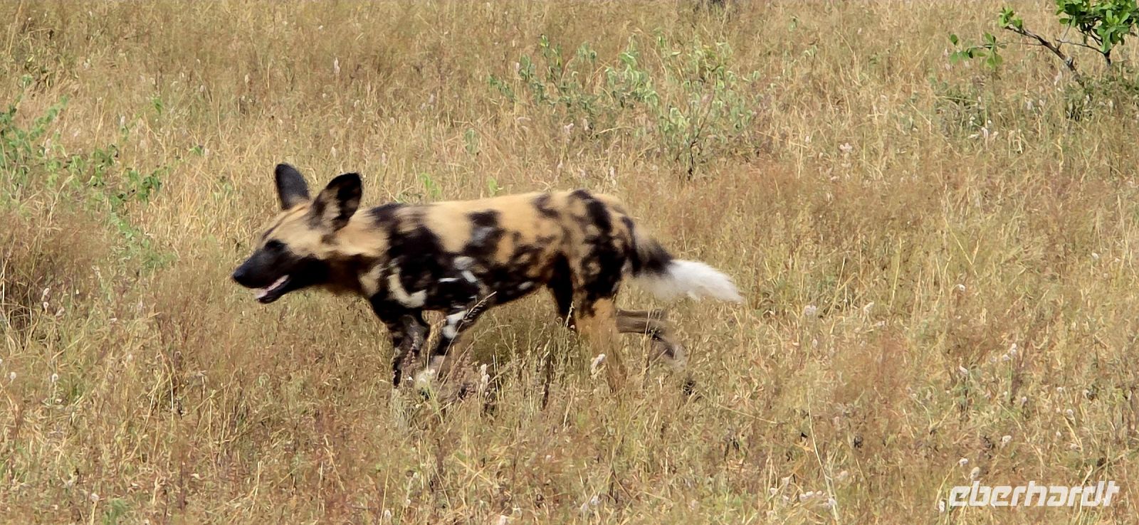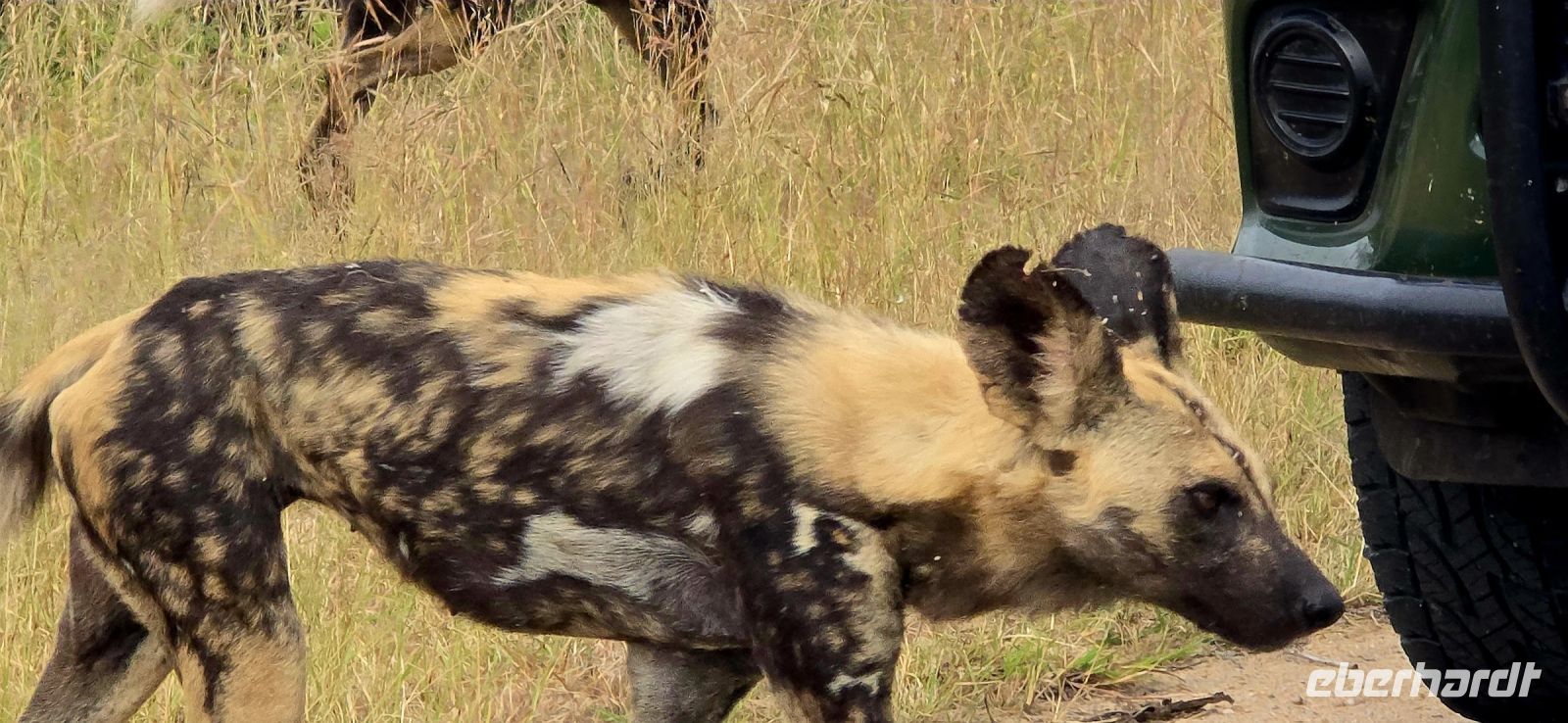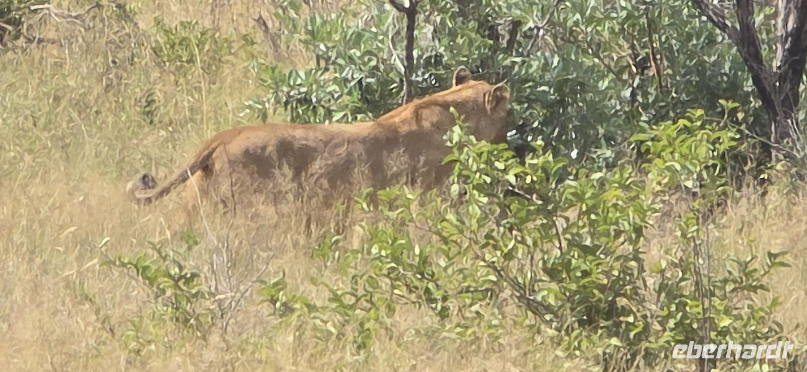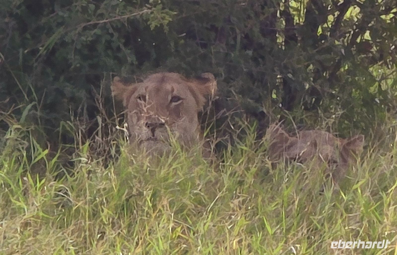 Dann endlich die ersten Löwen! Majestätisch, aber faul, dösen sie im Schatten und lassen sich von uns nicht aus der Ruhe bringen. Perfektes Timing für unser Picknick-Frühstück, das wir inmitten exotischer Vögel genießen. Gut gestärkt geht es weiter – diesmal mit einer klaren Mission: mehr Löwen! Doch bevor wir fündig werden, erwartet uns eine Überraschung: ein ganzes Rudel afrikanischer Wildhunde, eine echte Seltenheit! Sie umrunden unser Fahrzeug, wirken ruhelos und scheinen nur auf den richtigen Moment zu warten, um auf Jagd zu gehen.