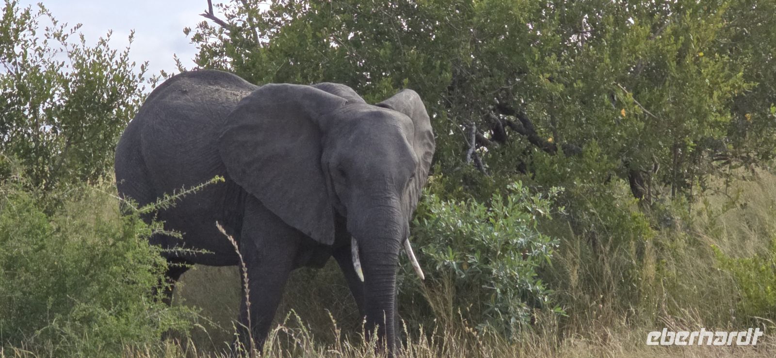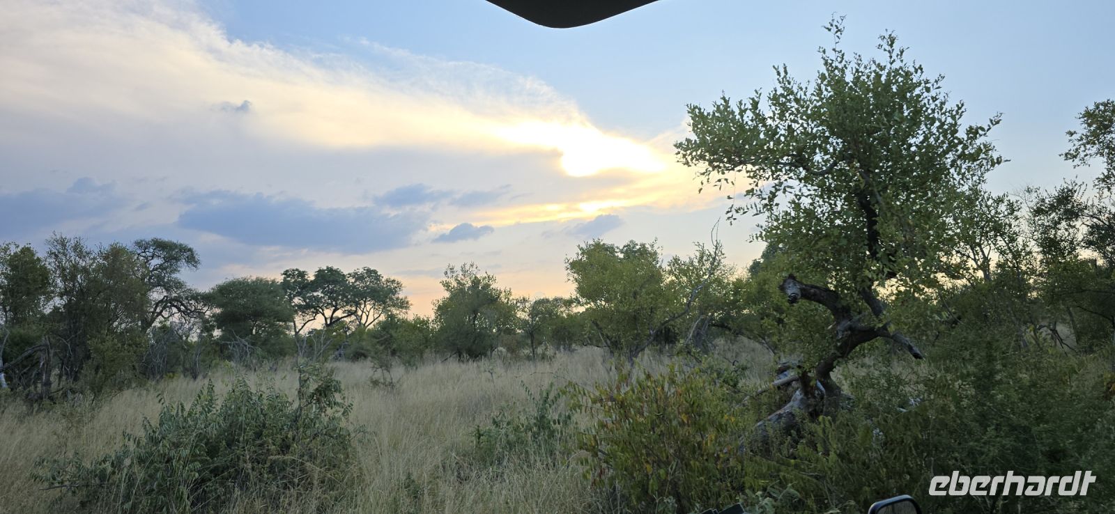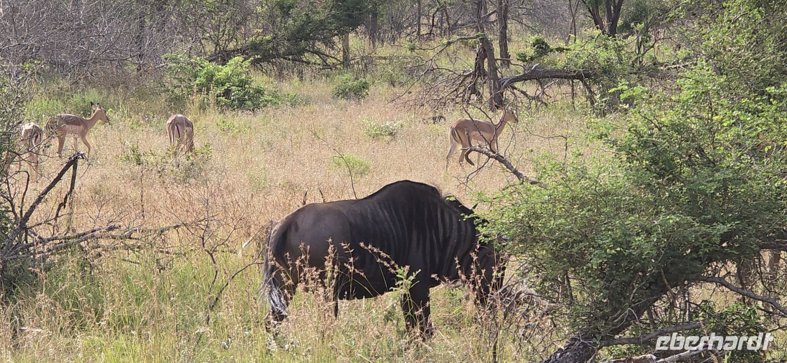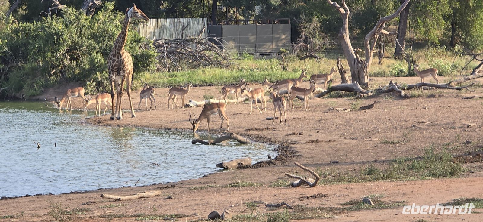 Die Fahrt zum Gate dauert gut eine Stunde, und bei 80 km/h im offenen Jeep sorgt der morgendliche Wind für eine eher erfrischende Begrüßung. Doch das frühe Aufstehen wird bereits vor dem Park belohnt: ein stattlicher Elefantenbulle trottet direkt an uns vorbei – ein Vorgeschmack auf das, was noch kommen wird. Und dann beginnt das eigentliche Spektakel: Herde um Herde zieht an uns vorbei, Impalas, Zebras, Gnus – als hätten sie sich extra für uns versammelt. Elefanten kreuzen gemütlich unseren Weg, Kudus posieren zwischen den Bäumen, und selbst die immer lustig aussehenden Wasserböcke mit ihren „Klositz“-Hinterteilen lassen sich blicken.
