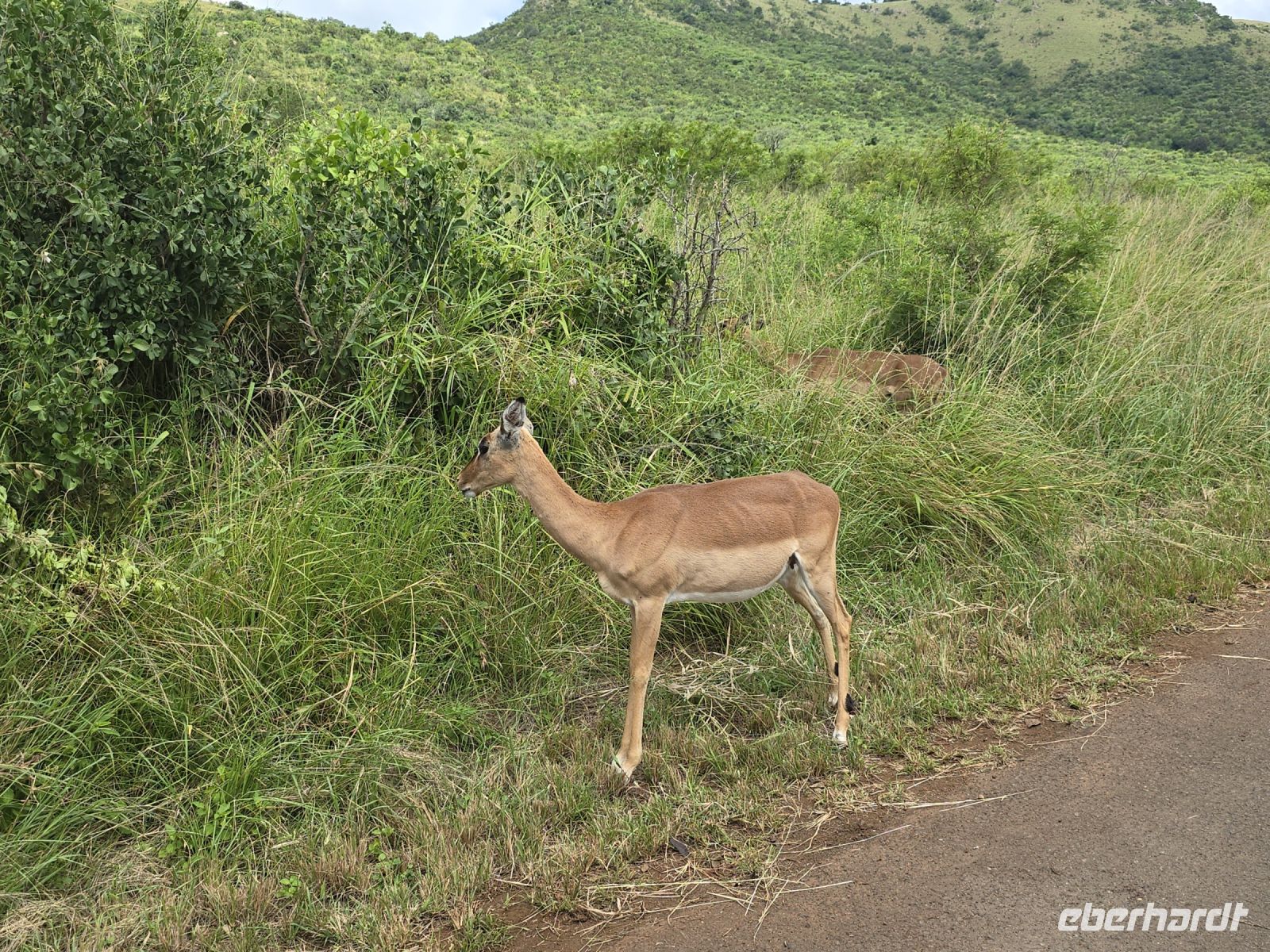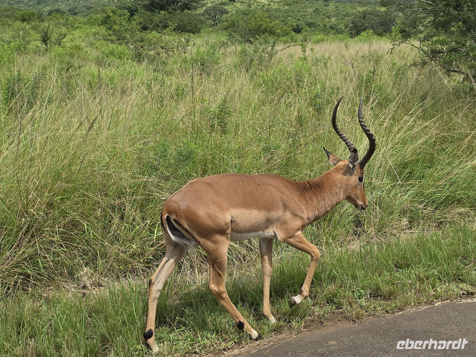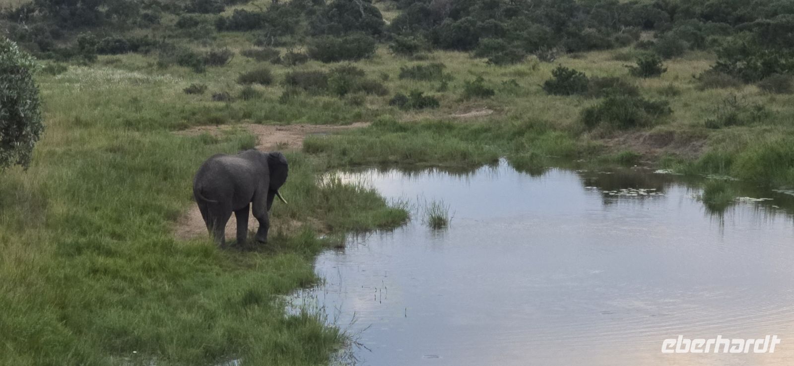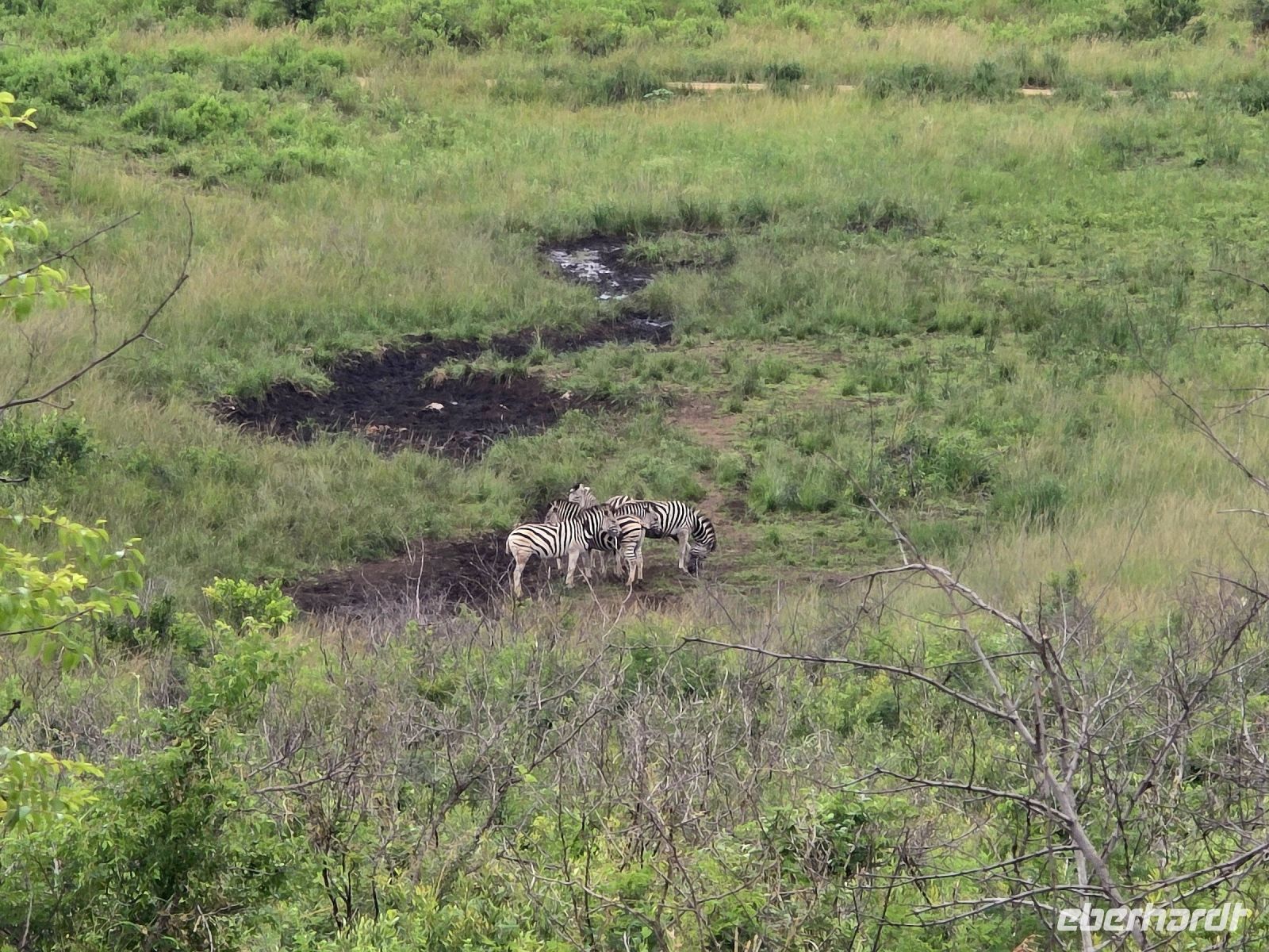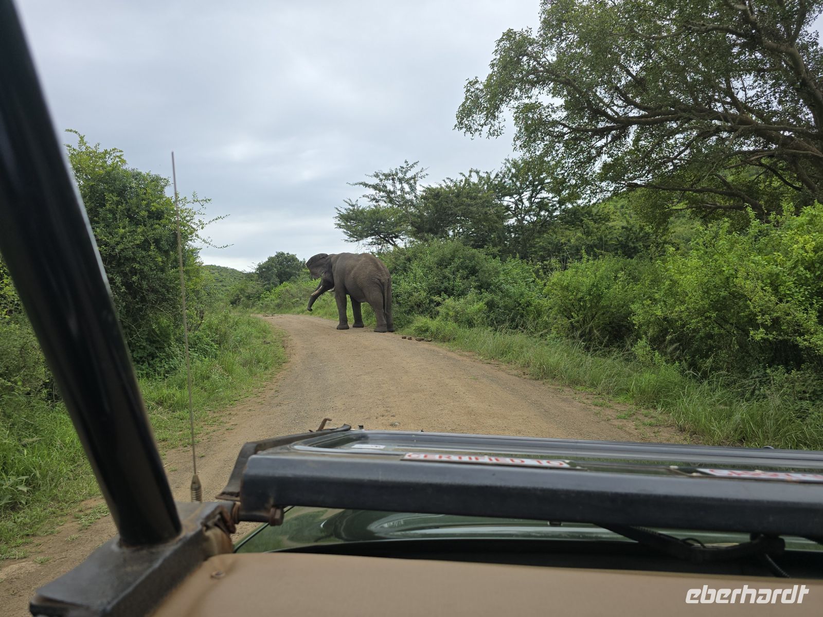 Die Fahrt führt uns schließlich zum Hluhluwe Nationalpark, wo wir am Memorial Gate eine kurze Mittagspause einlegen. Dann beginnt das große Abenteuer: Die Ranger holen uns mit ihren Jeeps ab und die erste Safari startet. Schon nach wenigen Metern begegnen uns am Wegesrand Warzenschweine, Impalas und Nyala-Antilopen. Selbst einem einsamen, älteren Wasserbüffel laufen wir über den Weg. Immer wieder tauchen Warzenschweine auf, dazu Pärchen von Nyalas und ganze Gruppen von Impalas. Ein erstes großes Highlight ist ein von der Sule bräunlich gefärbter Elefantenbulle, der genüsslich Bäume berupft.