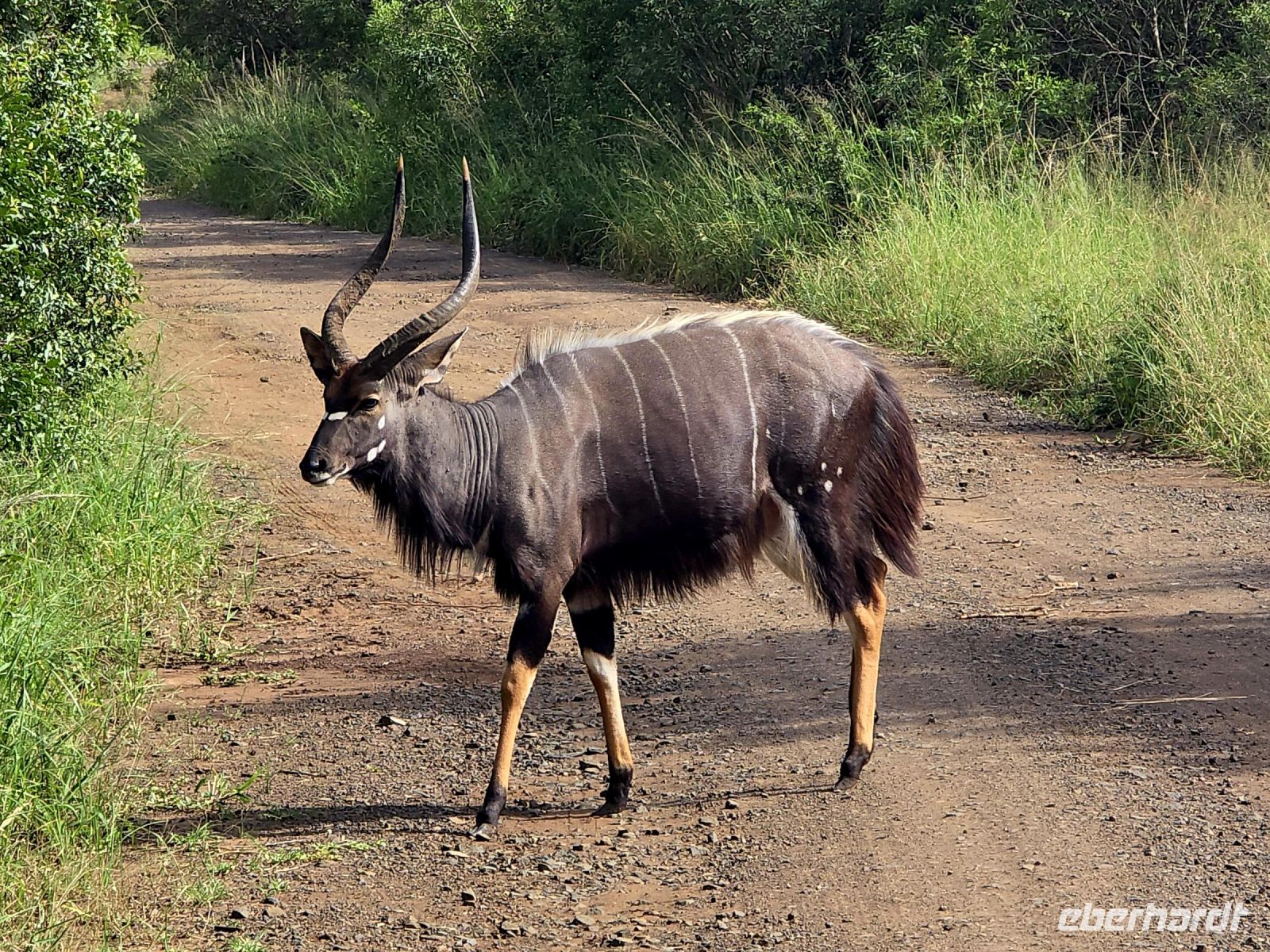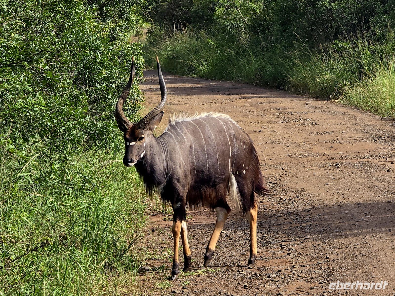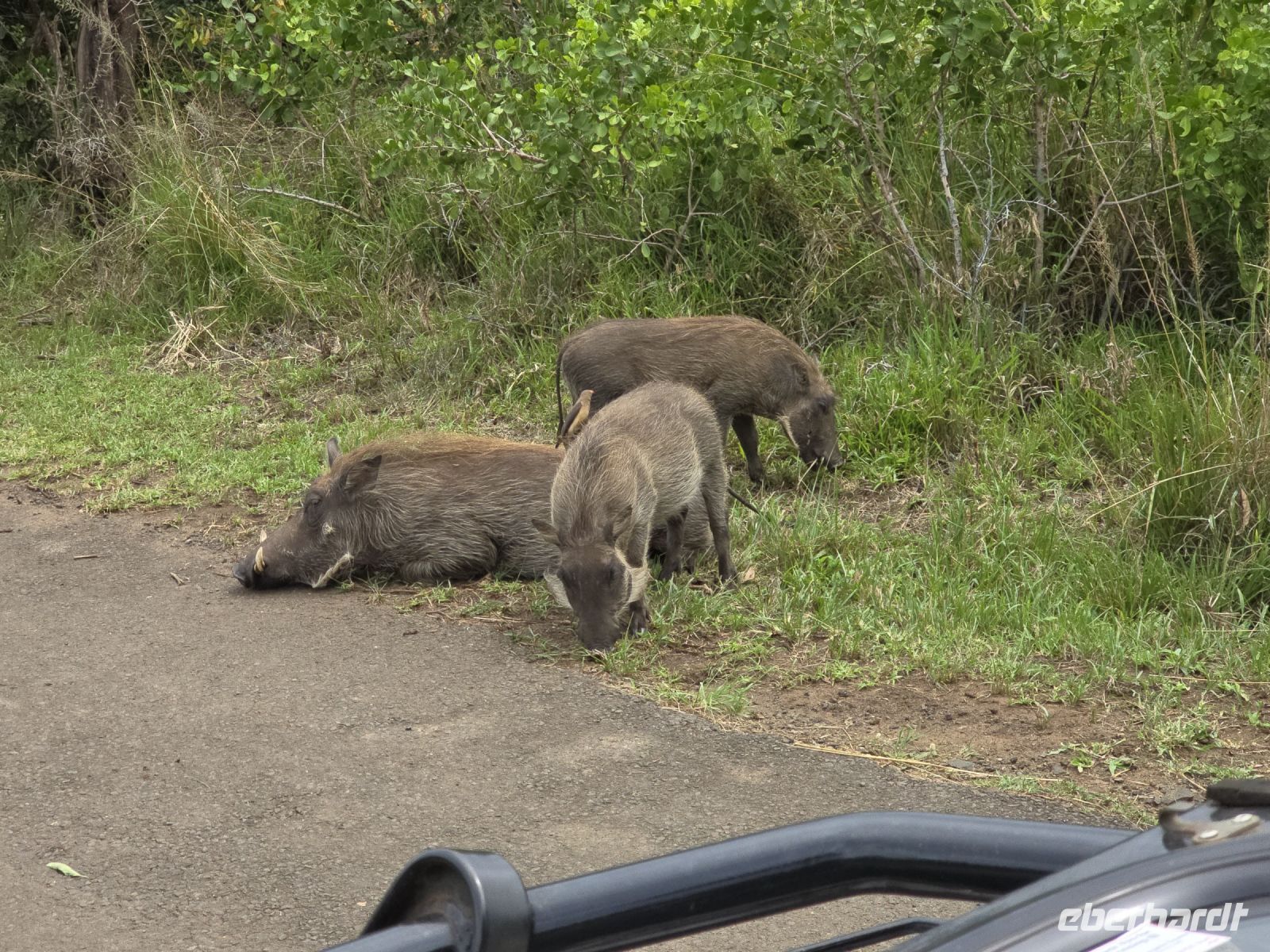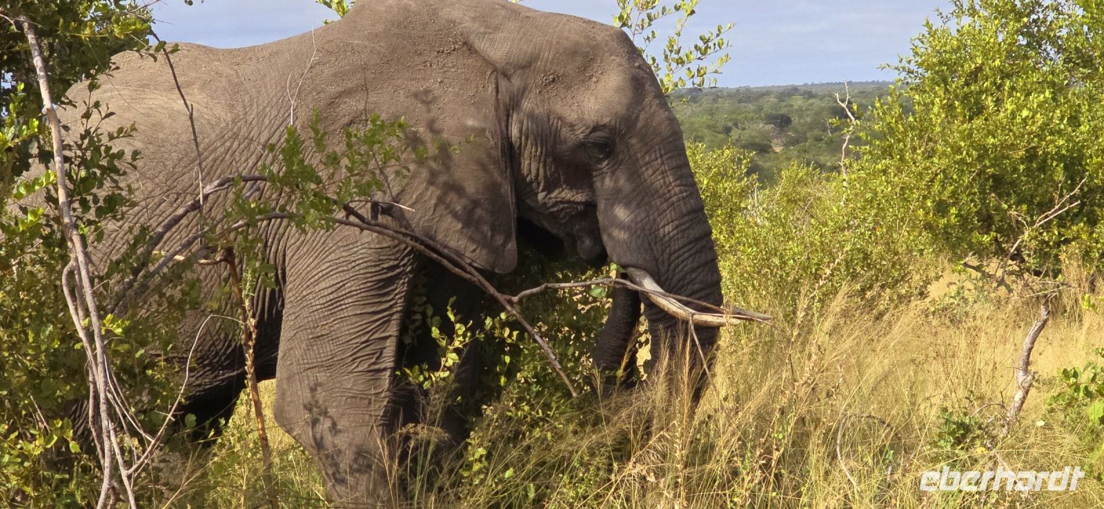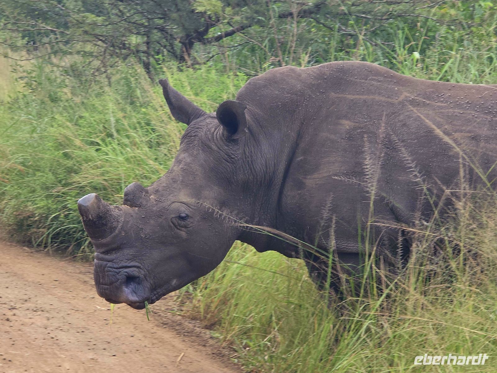 Die Fahrt führt uns schließlich zum Hluhluwe Nationalpark, wo wir am Memorial Gate eine kurze Mittagspause einlegen. Dann beginnt das große Abenteuer: Die Ranger holen uns mit ihren Jeeps ab und die erste Safari startet. Schon nach wenigen Metern begegnen uns am Wegesrand Warzenschweine, Impalas und Nyala-Antilopen. Selbst einem einsamen, älteren Wasserbüffel laufen wir über den Weg. Immer wieder tauchen Warzenschweine auf, dazu Pärchen von Nyalas und ganze Gruppen von Impalas. Ein erstes großes Highlight ist ein von der Sule bräunlich gefärbter Elefantenbulle, der genüsslich Bäume berupft.