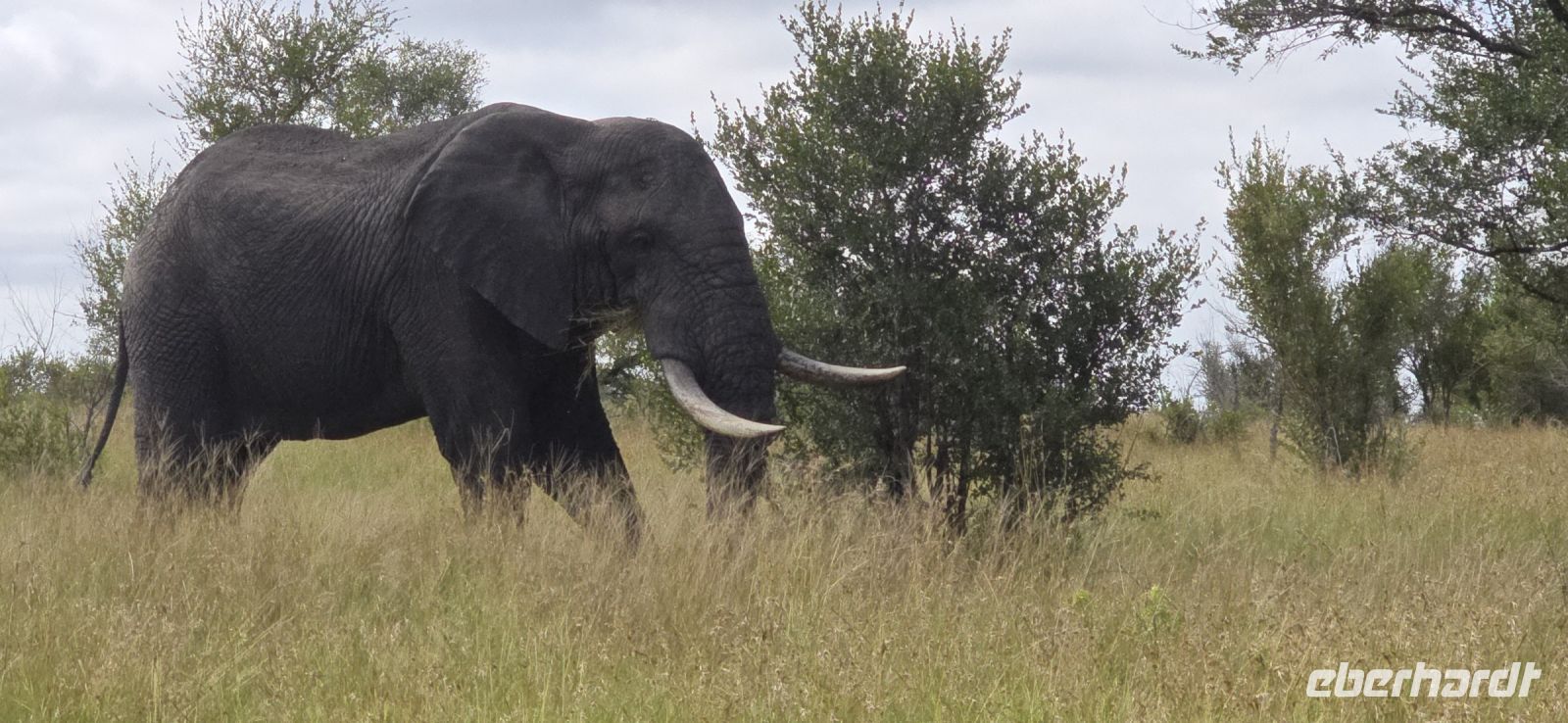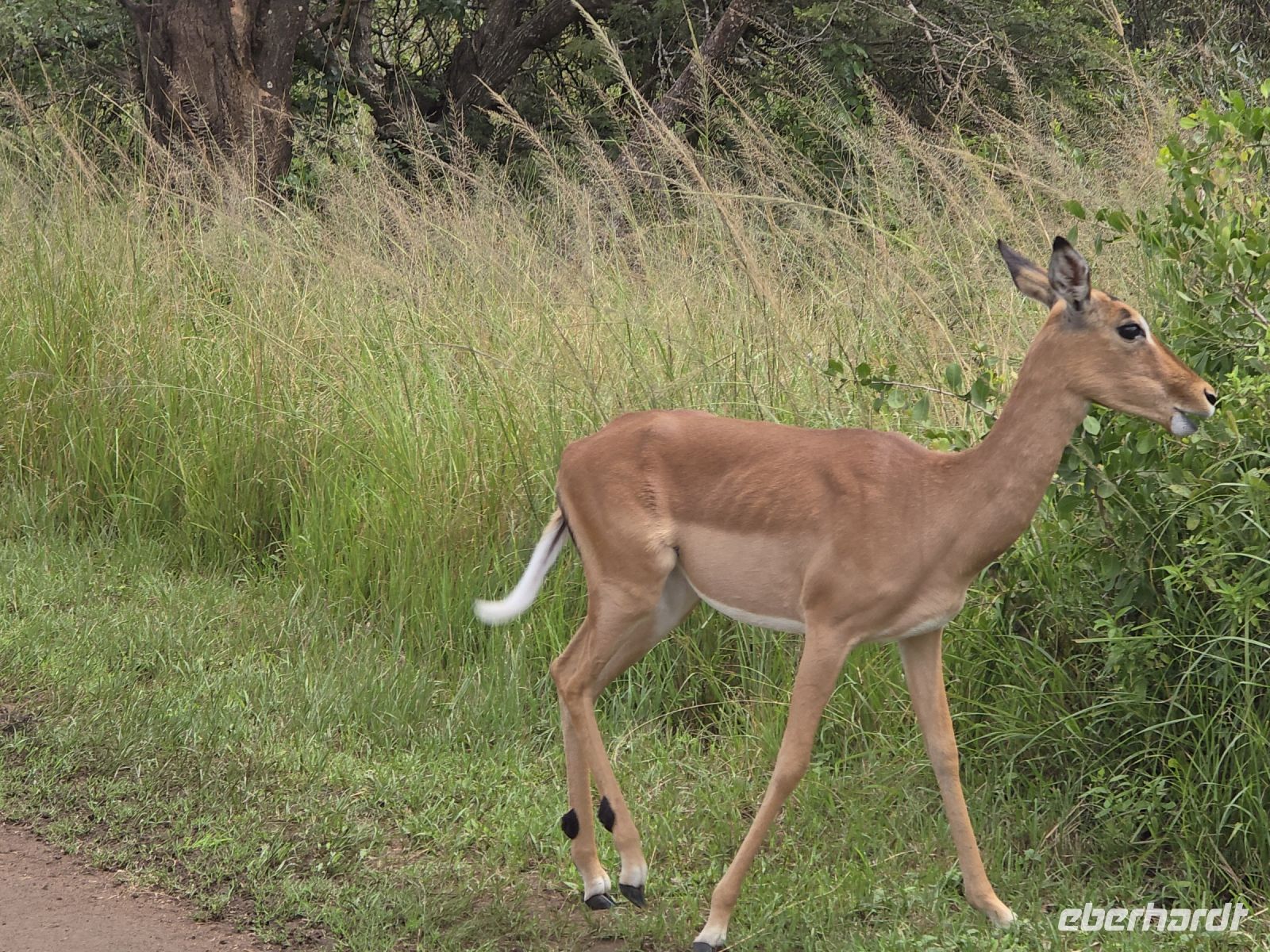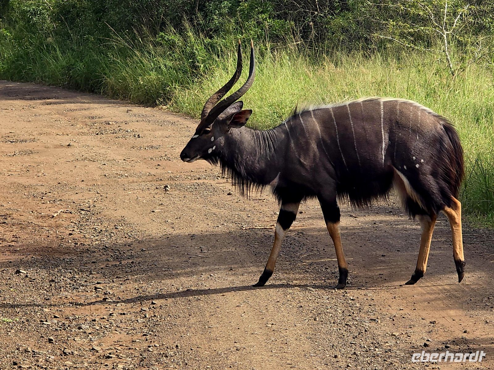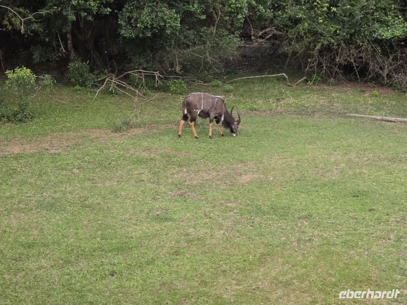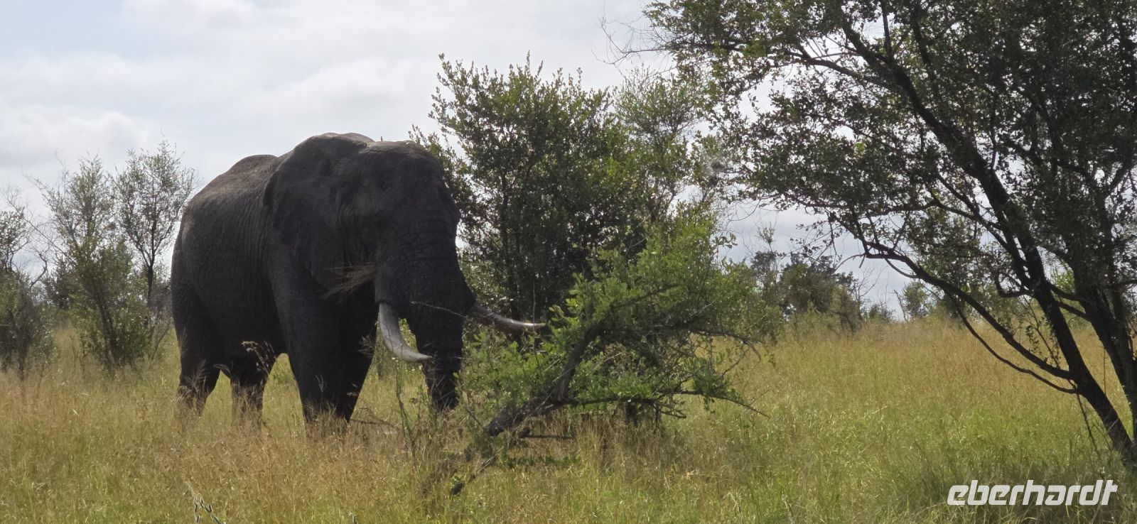 Die Fahrt führt uns schließlich zum Hluhluwe Nationalpark, wo wir am Memorial Gate eine kurze Mittagspause einlegen. Dann beginnt das große Abenteuer: Die Ranger holen uns mit ihren Jeeps ab und die erste Safari startet. Schon nach wenigen Metern begegnen uns am Wegesrand Warzenschweine, Impalas und Nyala-Antilopen. Selbst einem einsamen, älteren Wasserbüffel laufen wir über den Weg. Immer wieder tauchen Warzenschweine auf, dazu Pärchen von Nyalas und ganze Gruppen von Impalas. Ein erstes großes Highlight ist ein von der Sule bräunlich gefärbter Elefantenbulle, der genüsslich Bäume berupft.