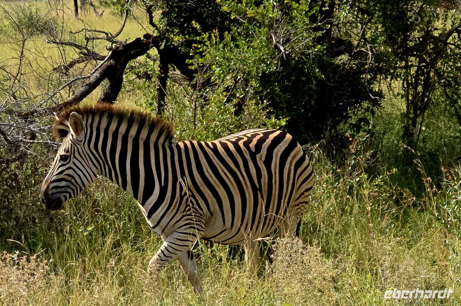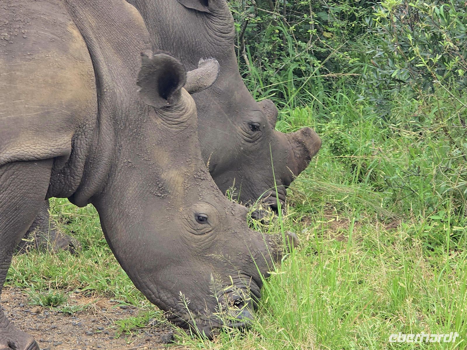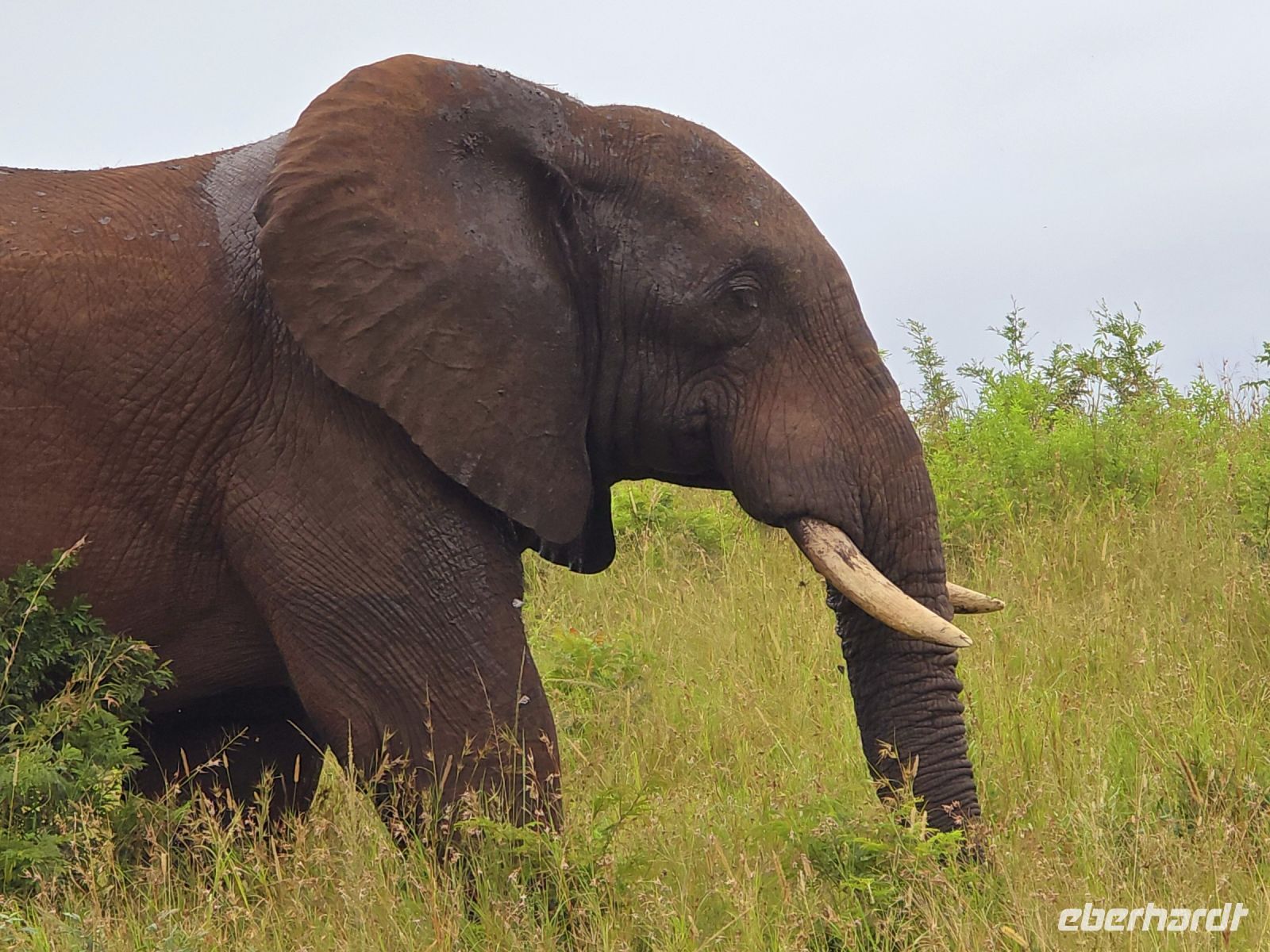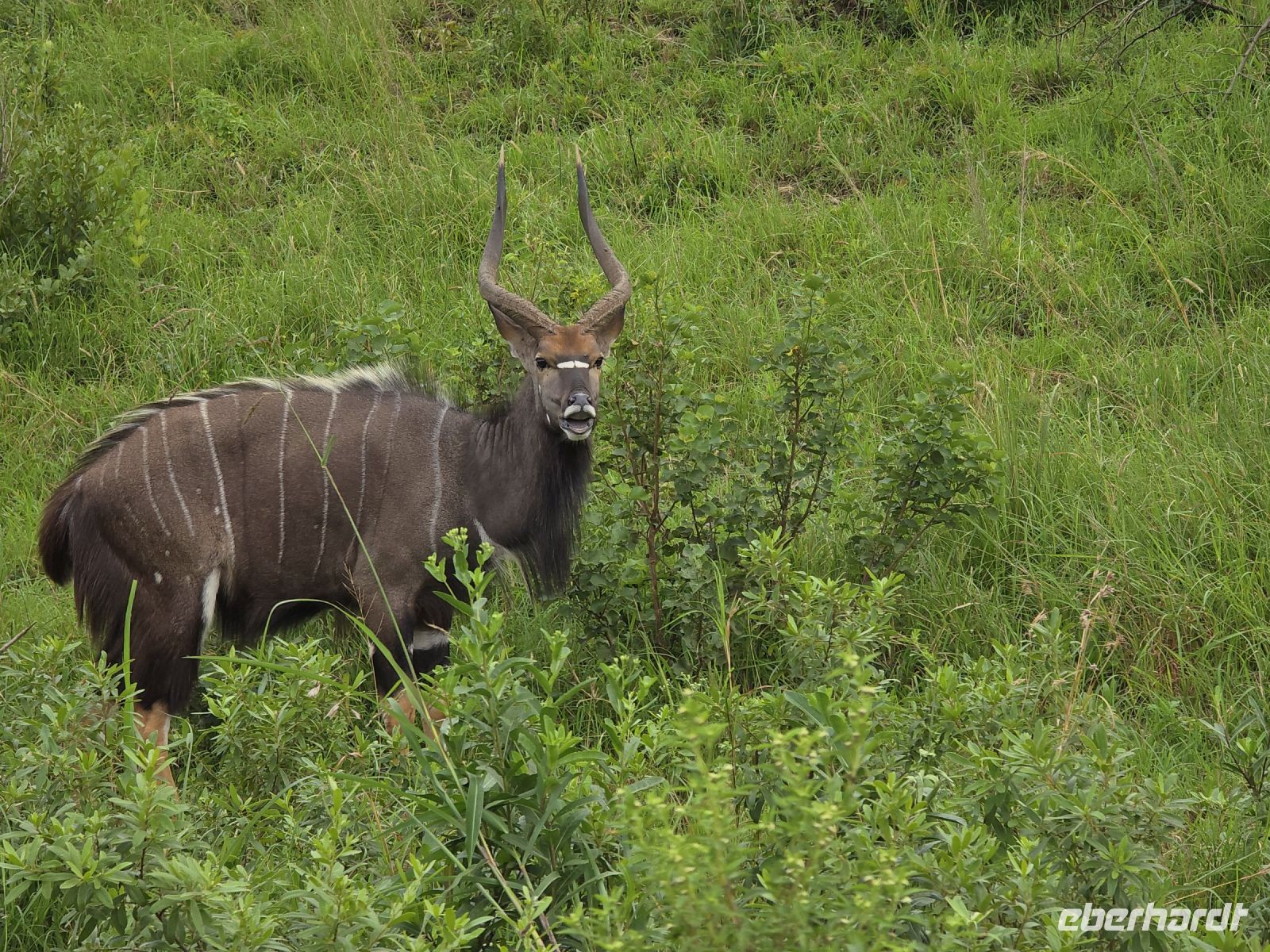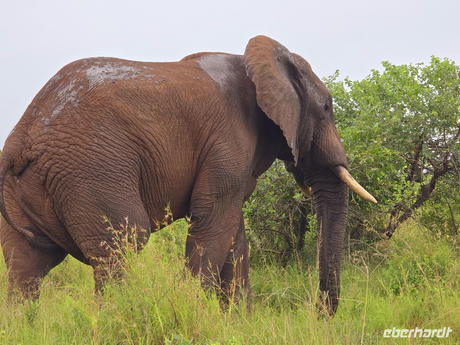 Die Fahrt führt uns schließlich zum Hluhluwe Nationalpark, wo wir am Memorial Gate eine kurze Mittagspause einlegen. Dann beginnt das große Abenteuer: Die Ranger holen uns mit ihren Jeeps ab und die erste Safari startet. Schon nach wenigen Metern begegnen uns am Wegesrand Warzenschweine, Impalas und Nyala-Antilopen. Selbst einem einsamen, älteren Wasserbüffel laufen wir über den Weg. Immer wieder tauchen Warzenschweine auf, dazu Pärchen von Nyalas und ganze Gruppen von Impalas. Ein erstes großes Highlight ist ein von der Sule bräunlich gefärbter Elefantenbulle, der genüsslich Bäume berupft.
