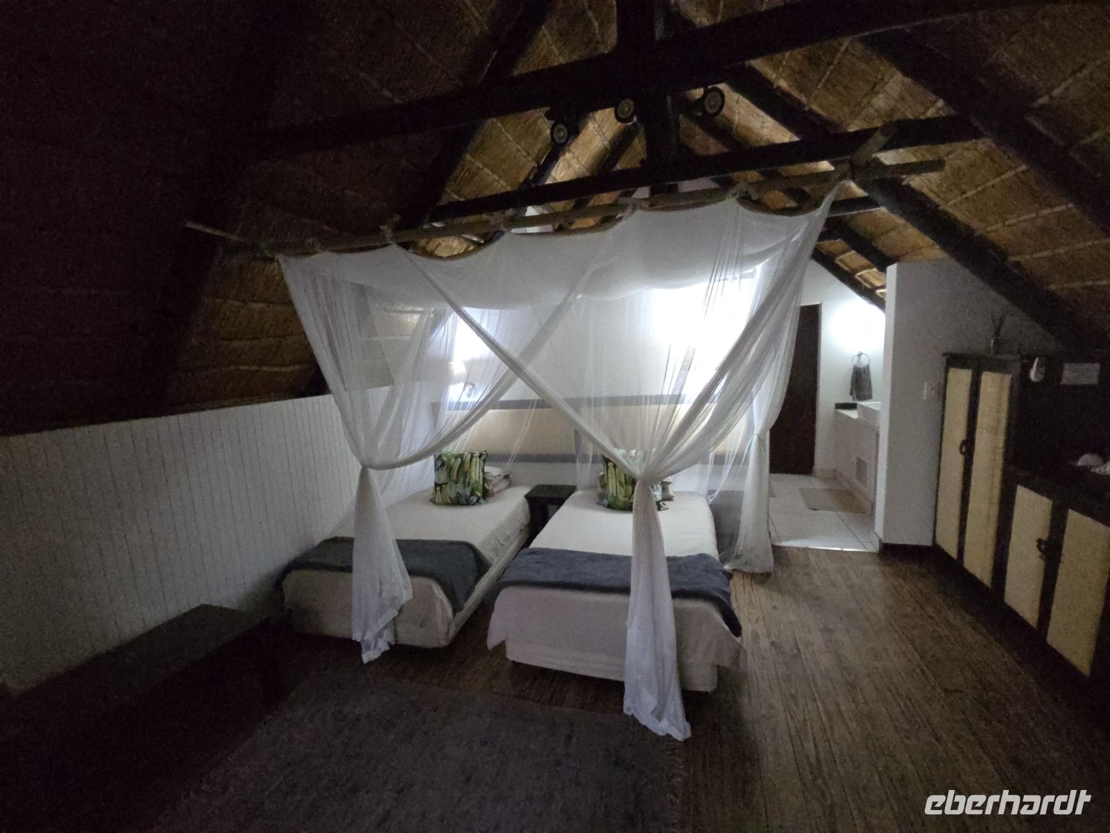 Nach dieser beeindruckenden Safari geht es über Stock und Stein zur River Lodge, die mit ihren Strohdach-Bungalows direkt in der Wildnis liegt. Die mitgeführte Taschenlampe erweist sich als nützlich, denn zahlreiche Nyalas haben es sich auf den Wegen und vor den Bungalows gemütlich gemacht. Das Abendessen ist ein wahres Highlight – wahlweise frischer Fisch oder ein perfekt gebratenes Filetsteak. Ein leckerer Absacker von der Bar rundet diesen ereignisreichen Tag perfekt ab. Die kleinen Tierchen und größeren Insekten, die in den Bungalows übernachten, gehören hier ganz selbstverständlich zum Abenteuer dazu.