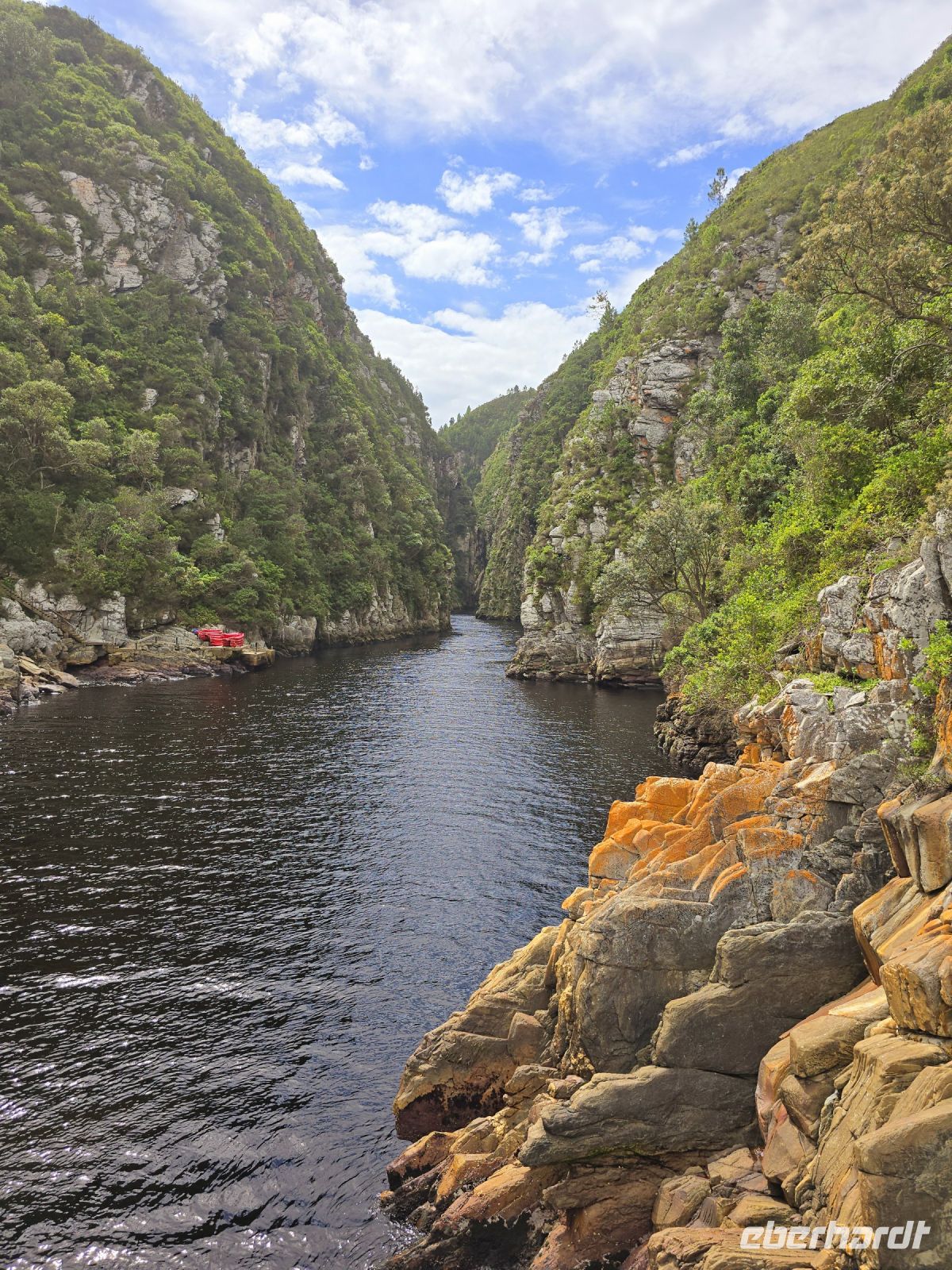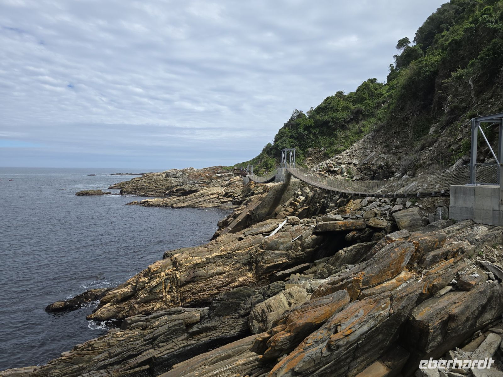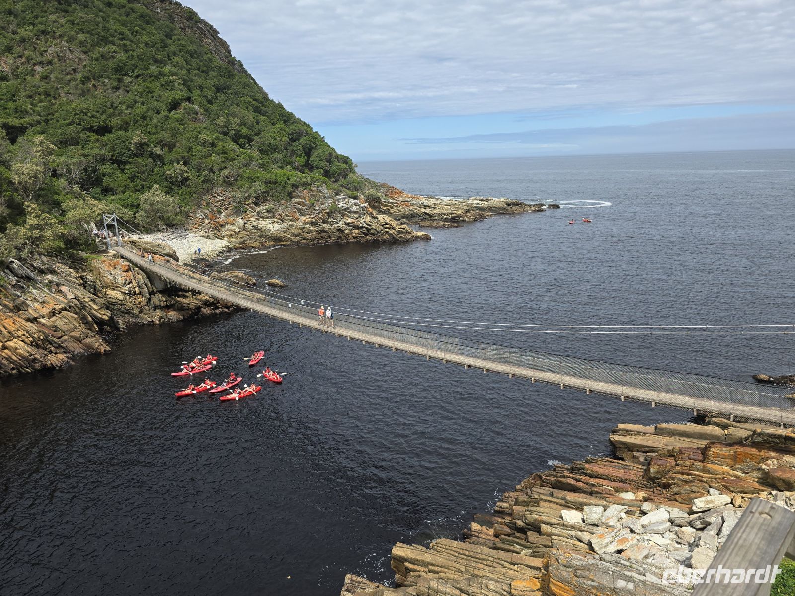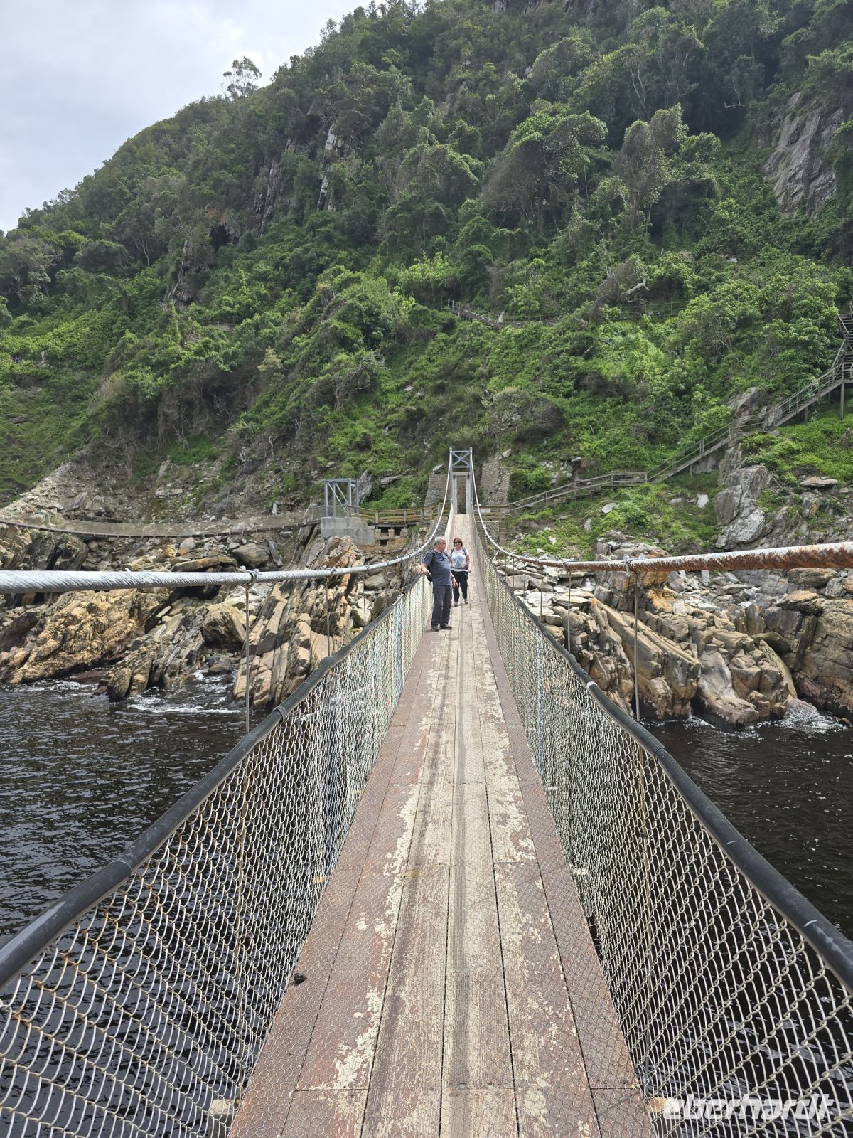 Weniger schwindelerregend, dafür umso beeindruckender wurde es im Tsitsikamma Nationalpark. Die Landschaft war einfach traumhaft, und die Panoramawanderung führte uns über zahlreiche Stufen hoch und runter durch üppige Natur. Der Blick auf die enge Bucht des Stormsriver ließ uns immer wieder innehalten, und spätestens auf der berühmten Hängebrücke, die uns auf die andere Seite der felsigen Bucht führte, war klar: jede einzelne Stufe hatte sich gelohnt. Während einige von uns die Brücke mit leicht zittrigen Knien überquerten, beobachteten uns Affen und Klipschliefer völlig entspannt aus sicherer Entfernung – anscheinend ist Wackeln für sie Alltag.