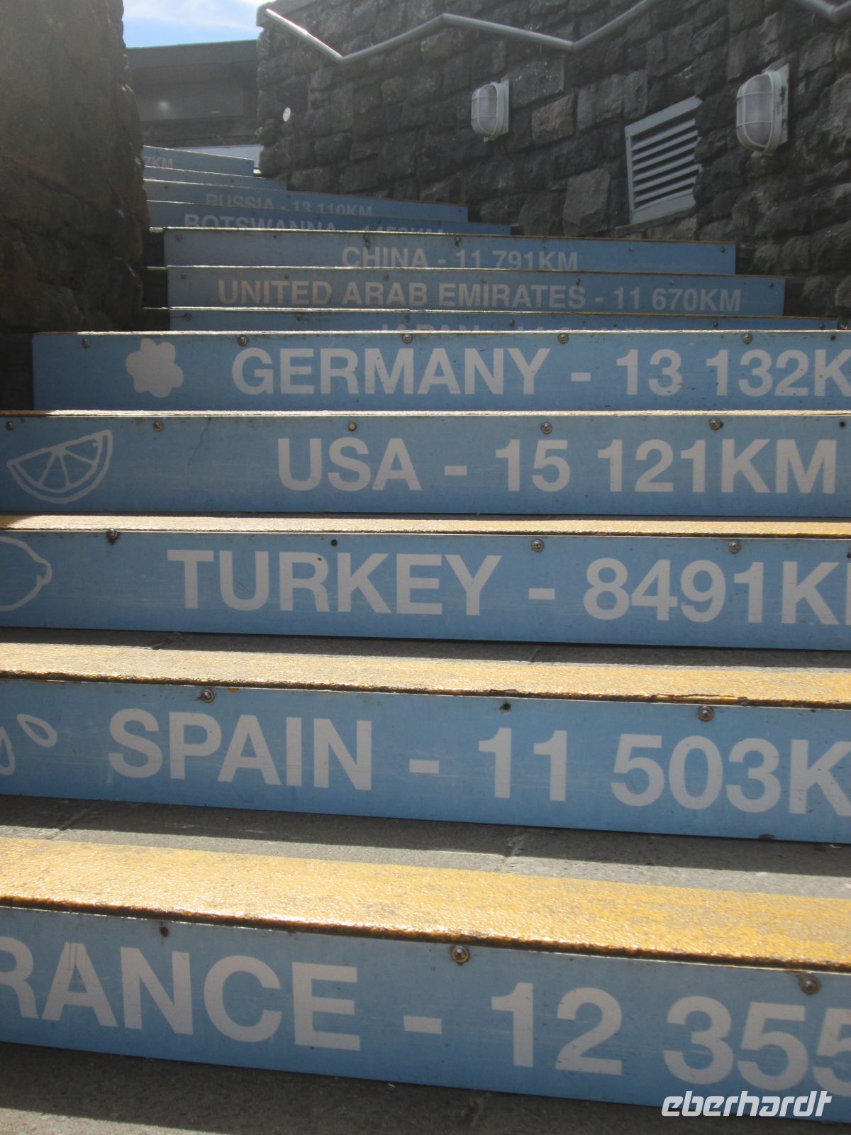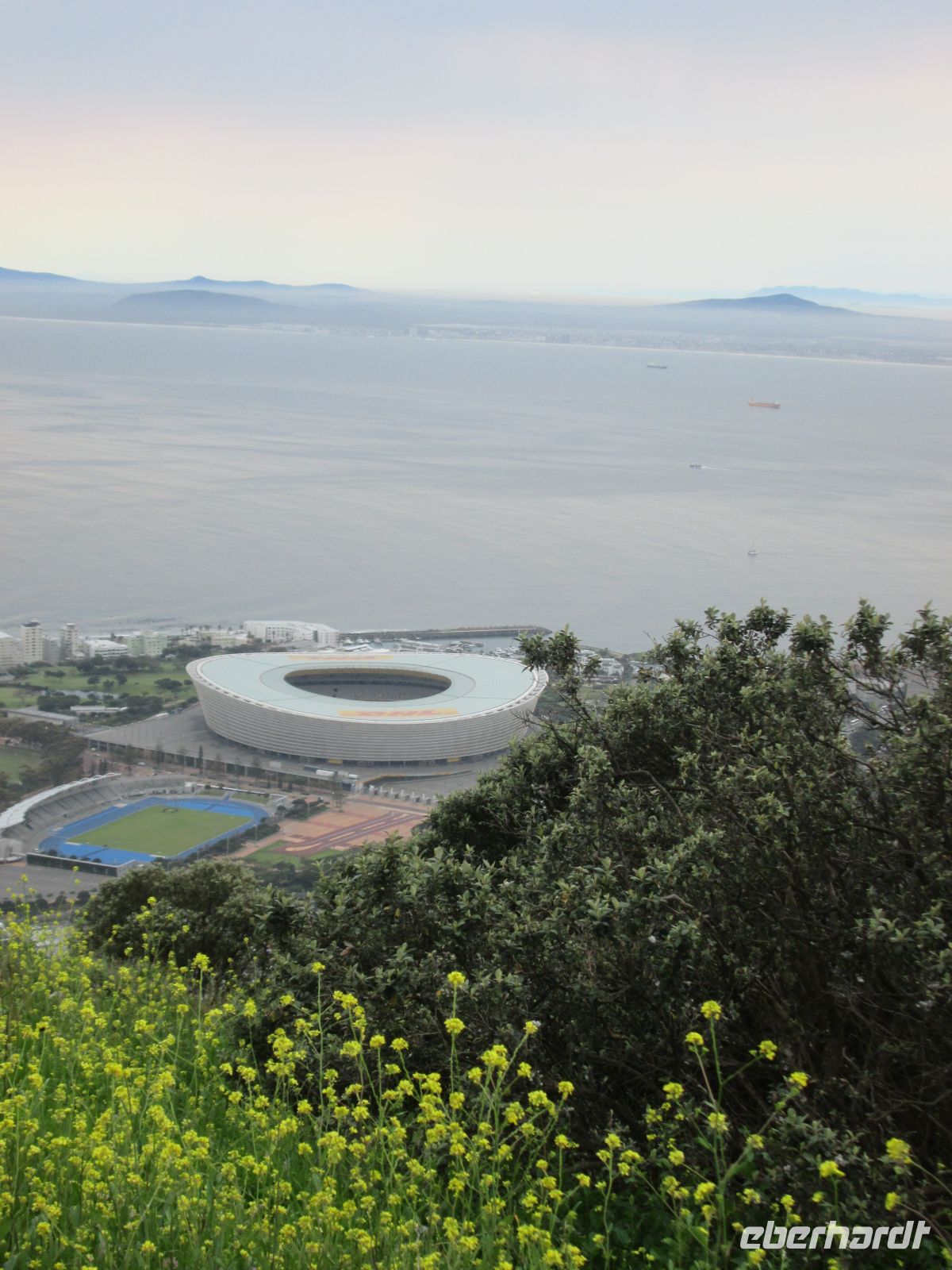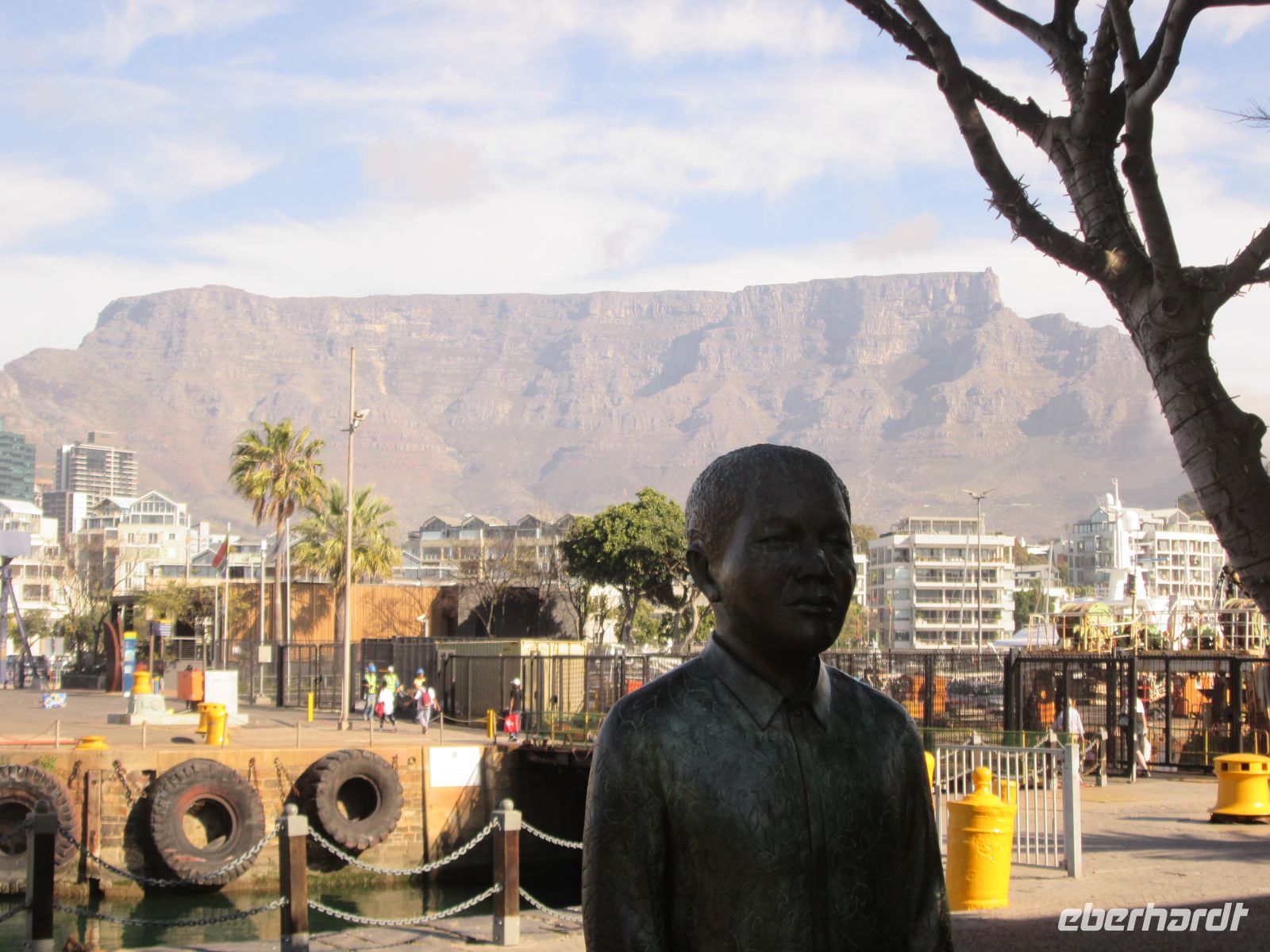 Vom Hafengebiet in Kapstadt schweifte der Blick in die Berge Richtung Nachbarland Namibia, weiter Richtung Robben Island, auf der Nelson Mandela 27 Jahre eingekerkert war, ferner über den Devils Peak zum Signal Hill und zum Stadion, in dem u.a. während der Fußball-Weltmeisterschaft 2010 das Halbfinale stattfand. Unwillkürlich erinnerten wir uns an Shakira's WM-Song "This time for Africa/ Waka Waka"
