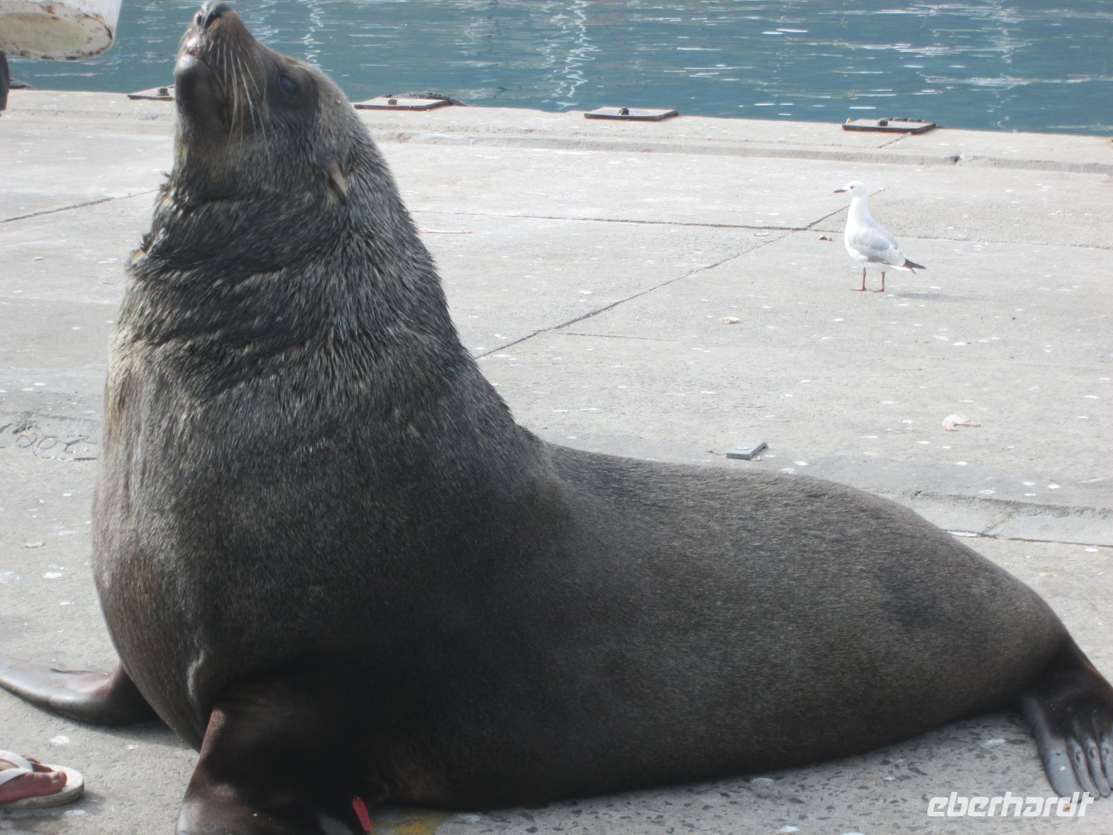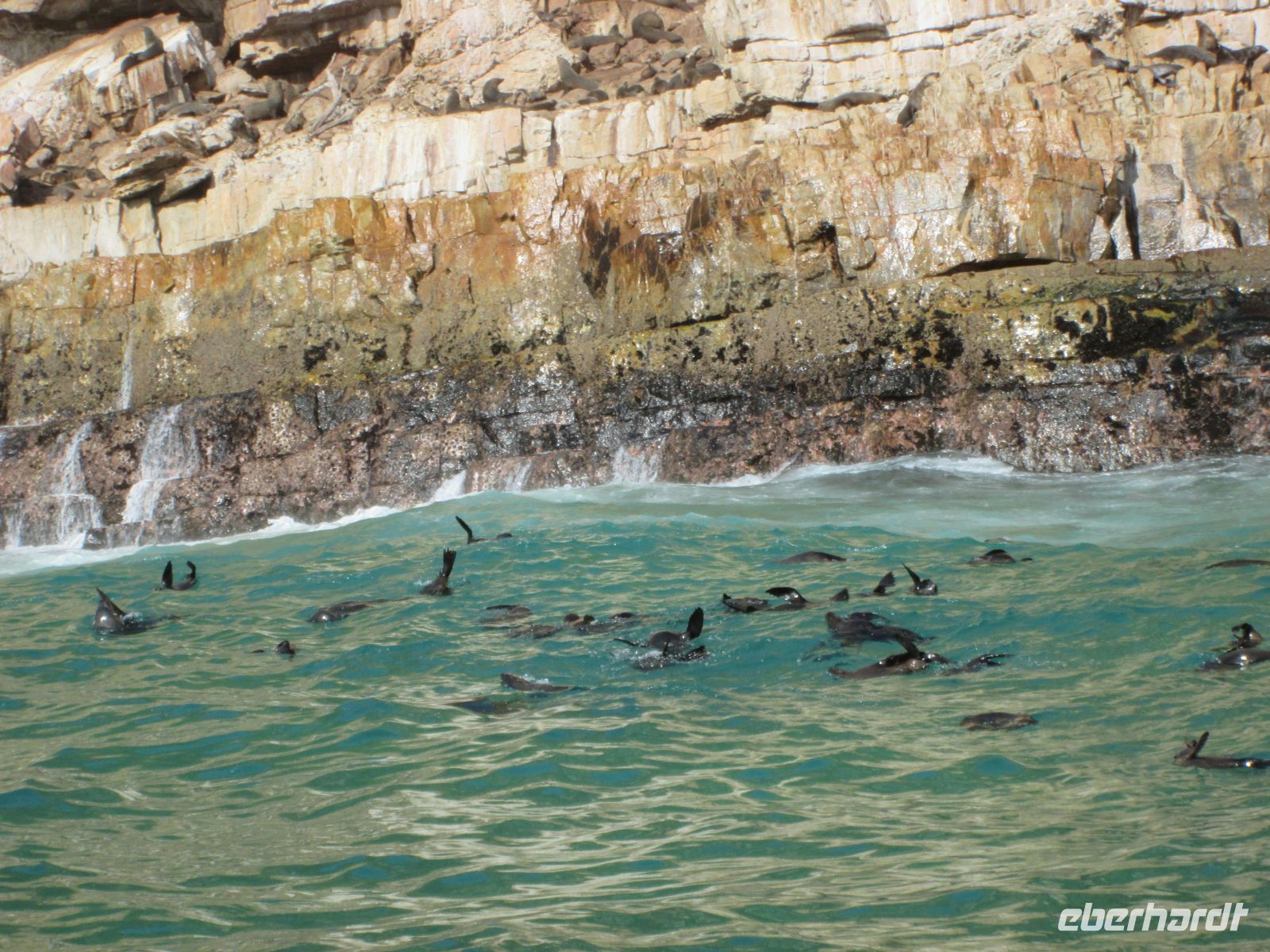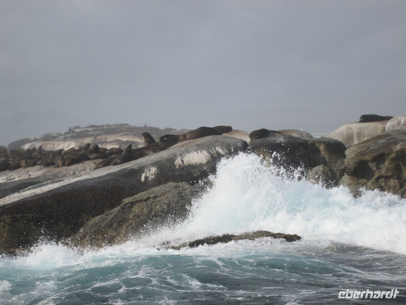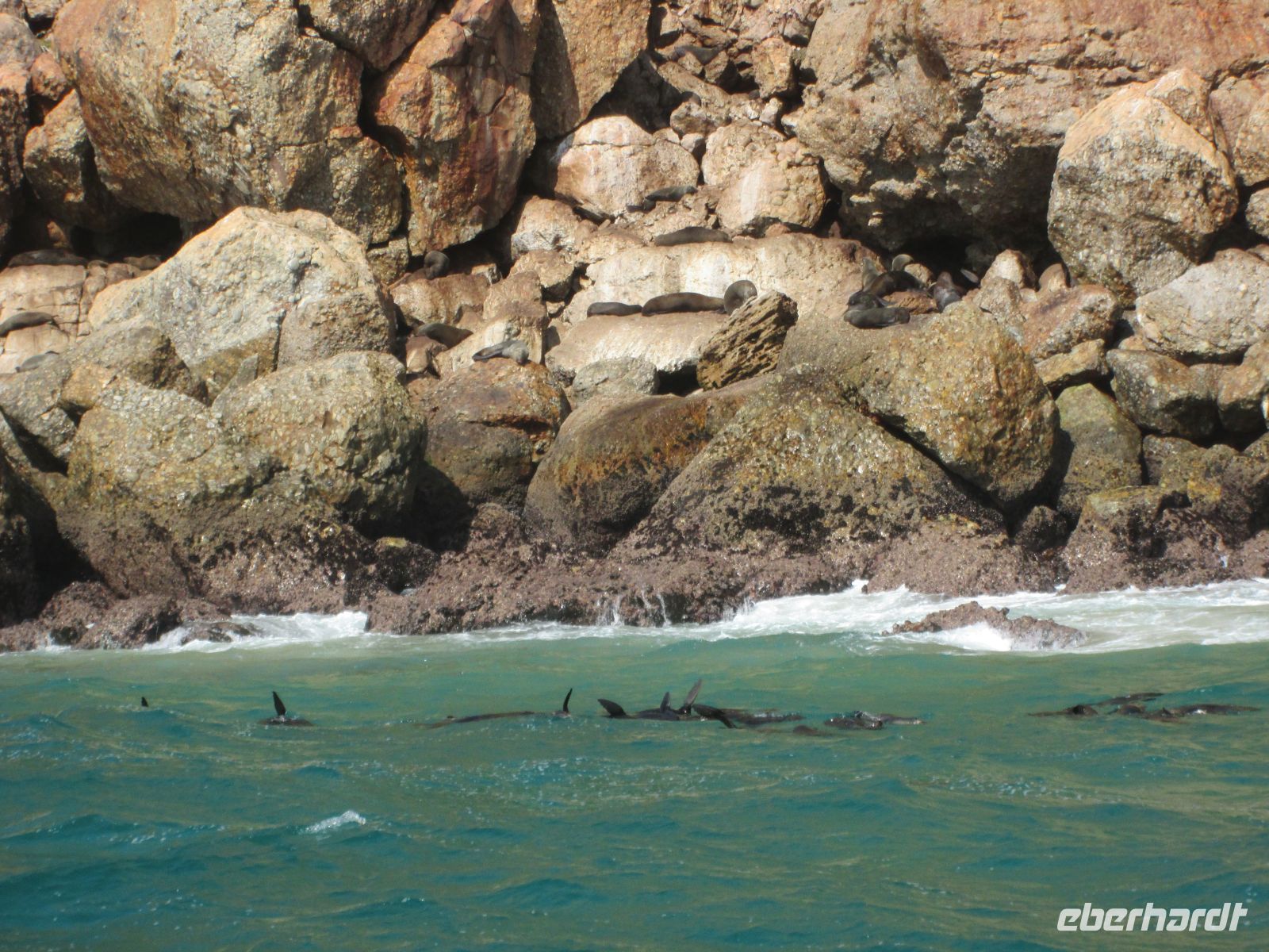 Das Wetter spielte mit, in einem offenen Boot mit Schwimmweste und nach Sicherheitseinführungen konnte es losgehen. Zunächst steuerte der Kapitän die Westküste der Bucht an, und dort sahen wir zu Hunderten Robben, faul auf dem Felsen liegend oder vergnügt im Wasser spielend. Man meinte sie freuten sich uns zu sehen und schwammen immer dem Boot hinterher. Die Sonne schickte ihr bestes Licht auf Felsen und Meer, welches türkis funkelte. Wenn die Robben doch auch noch kurz inne gehalten hätten, gäbe es sicher die schönsten Fotos.