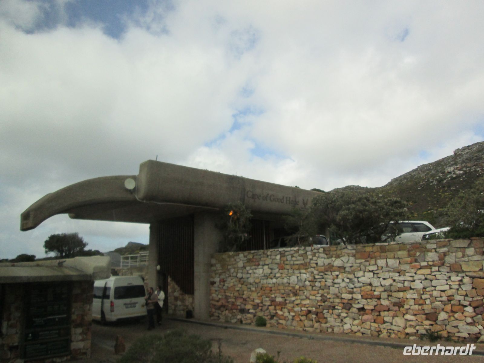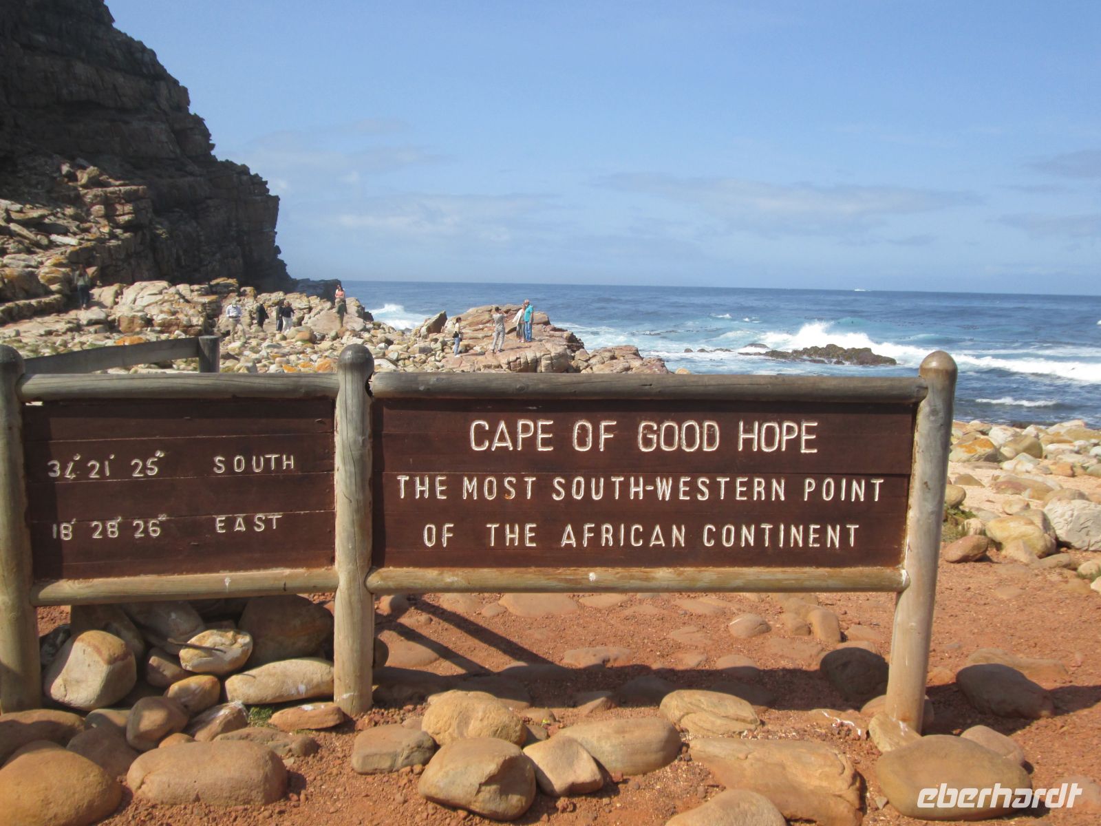 Um die Mittagszeit waren wir direkt im "Nationalpark Kap der Guten Hoffnung" angekommen. Nach Bezahlen des Eintrittsgeldes, dieses Mal waren es ca. 22 € pro Person, fuhren wir sogleich zum berühmten Schild, vor dem sich jeder fotografieren lassen muss, der beweisen will, auch wirklich am Kap der Guten Hoffnung gewesen zu sein. Glücklicherweise war die Wartezeit auf das eigene Foto nicht allzu lang, so dass wir uns schon 15 Minuten später zur Kapspitze mit dem Leuchtturm begeben konnten. Es war eine Fahrt hinauf und ein Spaziergang herunter vorgesehen, aber die Technik der Standseilbahn machte uns einen Strich durch die Rechnung.