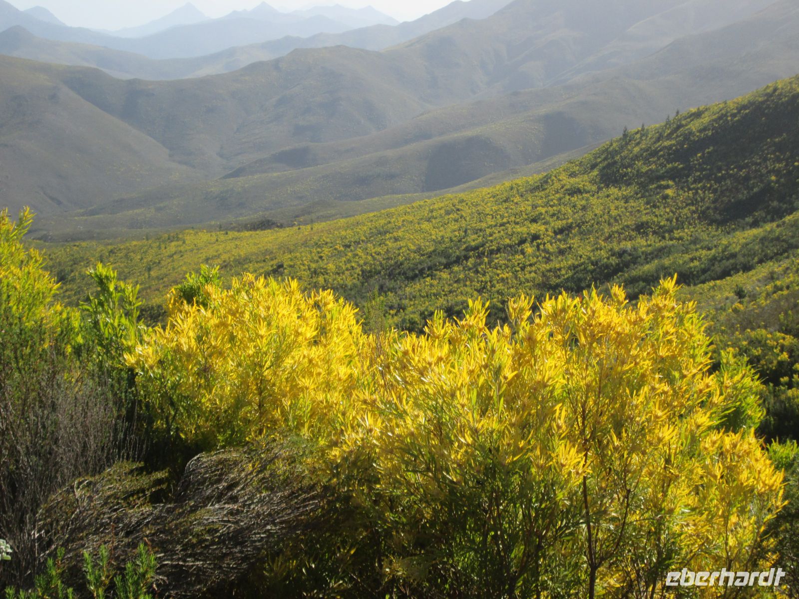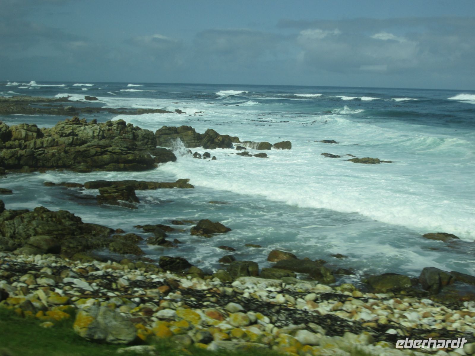 So führte uns die Fahrt wieder zur False Bay, die wir schon beim Kap-Ausflug kennengelernt hatten. Auf diese hatten wir aber erst wieder den ganzen Blick, als wir sie schon fast verlassen hatten. Wir erklommen nämlich den Sir Lowrys Pass mit seinen etwa 450 Höhenmetern, auf der N2, der wichtigen Verbindung zwischen Kapstadt und der Garten Route. Die Khoi, die einheimische Bevölkerung Südafrikas, sollen diesen Übergang bereits genutzt haben. Hinter dem Pass gab es viele Wasserreservoire, die zur Energiegewinnung genutzt werden.
