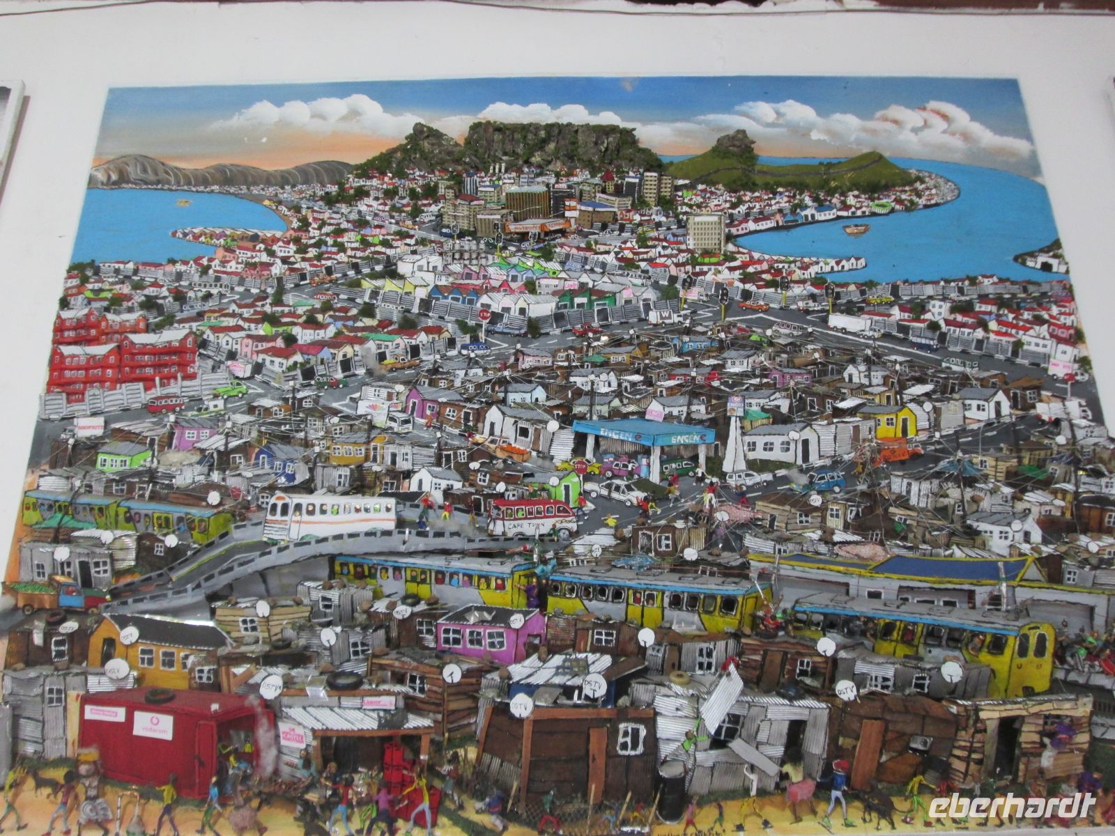 Nach dem gemütlichen Morgenspaziergang ging es ins lebhafte Bo Kaap mit seinen typischen bunten Häusern, heute eine weitere Sehenswürdigkeit Kapstadts. Es gilt als eines der ältesten Viertel der Stadt und wird bewohnt von einer muslimischen Gemeinde. Im Viertel besuchten wir einen Gewürzladen, der uns zum Kauf von manch günstigen Produkten verführte. Auch ein kleines Häuschen um die Ecke zog unsere Aufmerksamkeit an sich: die Besitzer recyceln viele Materialien und fertigen verschiedenste Gegenstände, von kleinen Würmern, über Fahrräder und Tiere bis hin zu einem "Foto" von Kapstadt .