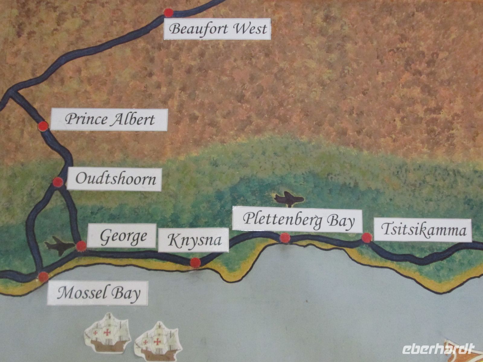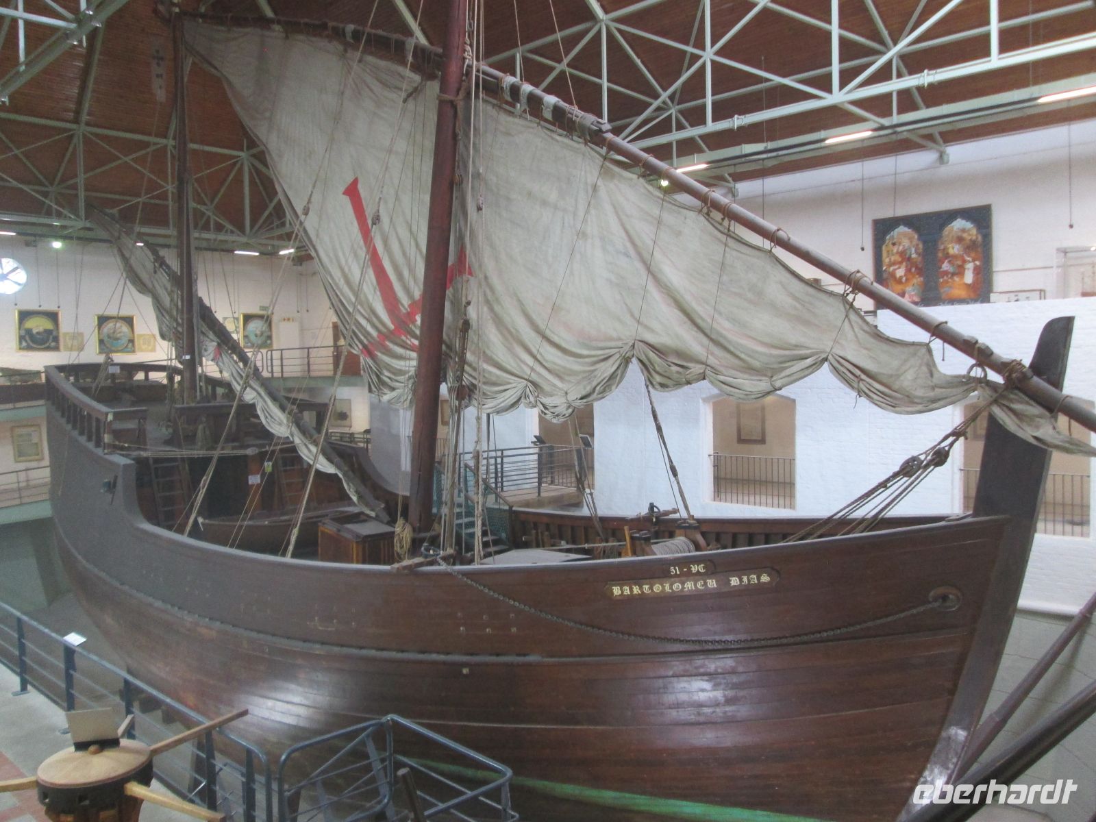 Am Nachmittag hatten wir dann Mosselbay erreicht, wo wir uns auf den Spuren des Seefahrers Bartolomeu Dias' bewegten. Der Portugiese umsegelte die Kapbucht, weiter Richtung Osten, er wollte nach Indien, und man brauchte Frischwasser. Die vorhandene Frischwasserquelle wurde aber von den Khoi beschützt, so dass es zu einem Kampf kam. Dias und seinen Mannen gewannen, und er bezeichnete die Bucht und Wasserstelle "Aguada de Sao Bras" (Wasserstelle des Heiligen Blasius). Später wurde es dann die "Muschelbucht". In dem ihm gewidmeten Museum, in dem es wegen Bauarbeiten kräftig staubte, ist eine Nachbildung seiner Karavelle zu sehen. Dias und seiner Mannschaft war der weitere Weg nach Indien nicht gegönnt, sie drehten ab und kehrten nach Portugal zurück. Vasco da Gama erreichte 2 Jahre vor dem Tod Bartolomeu Dias schließlich Indien.