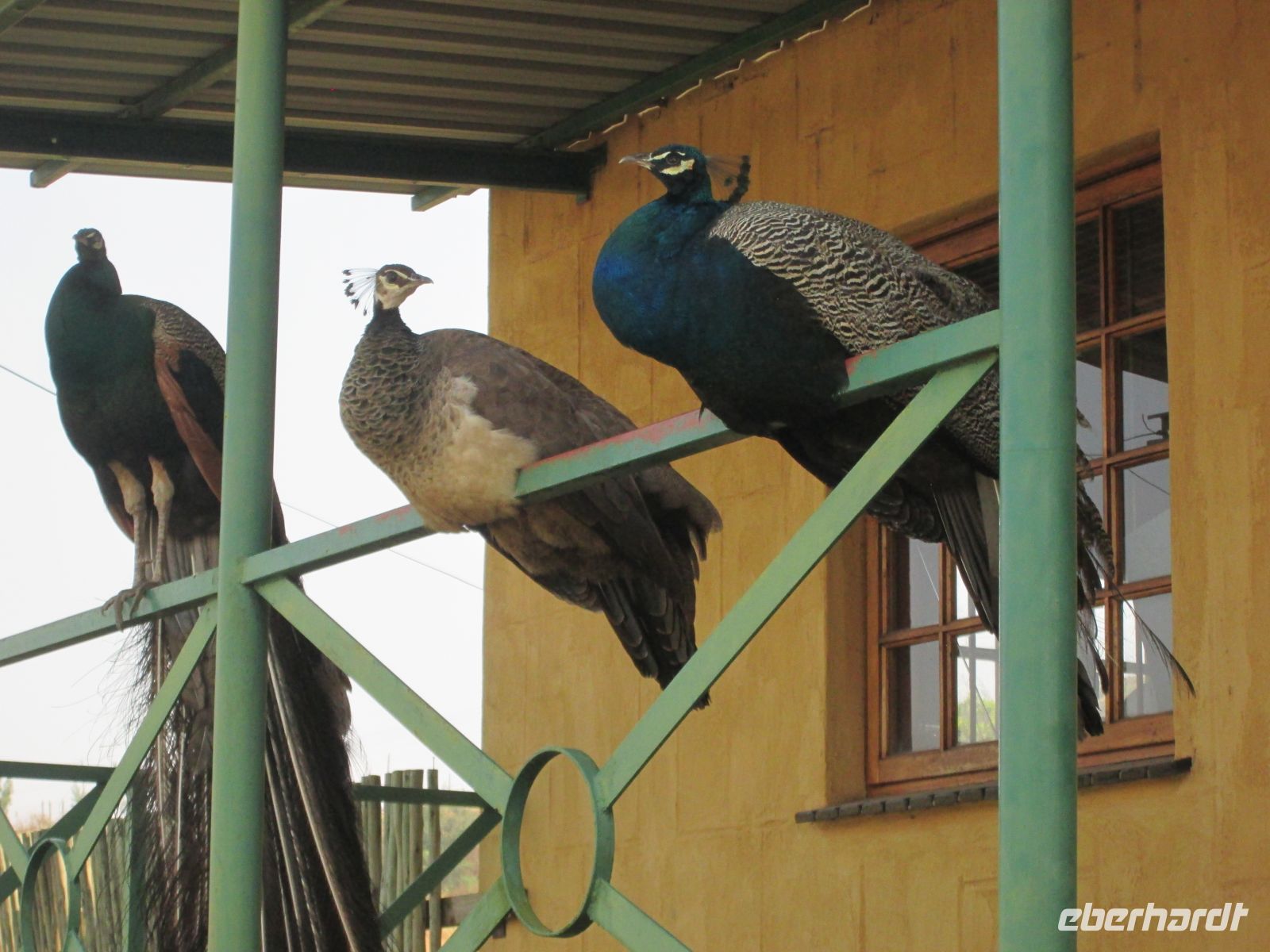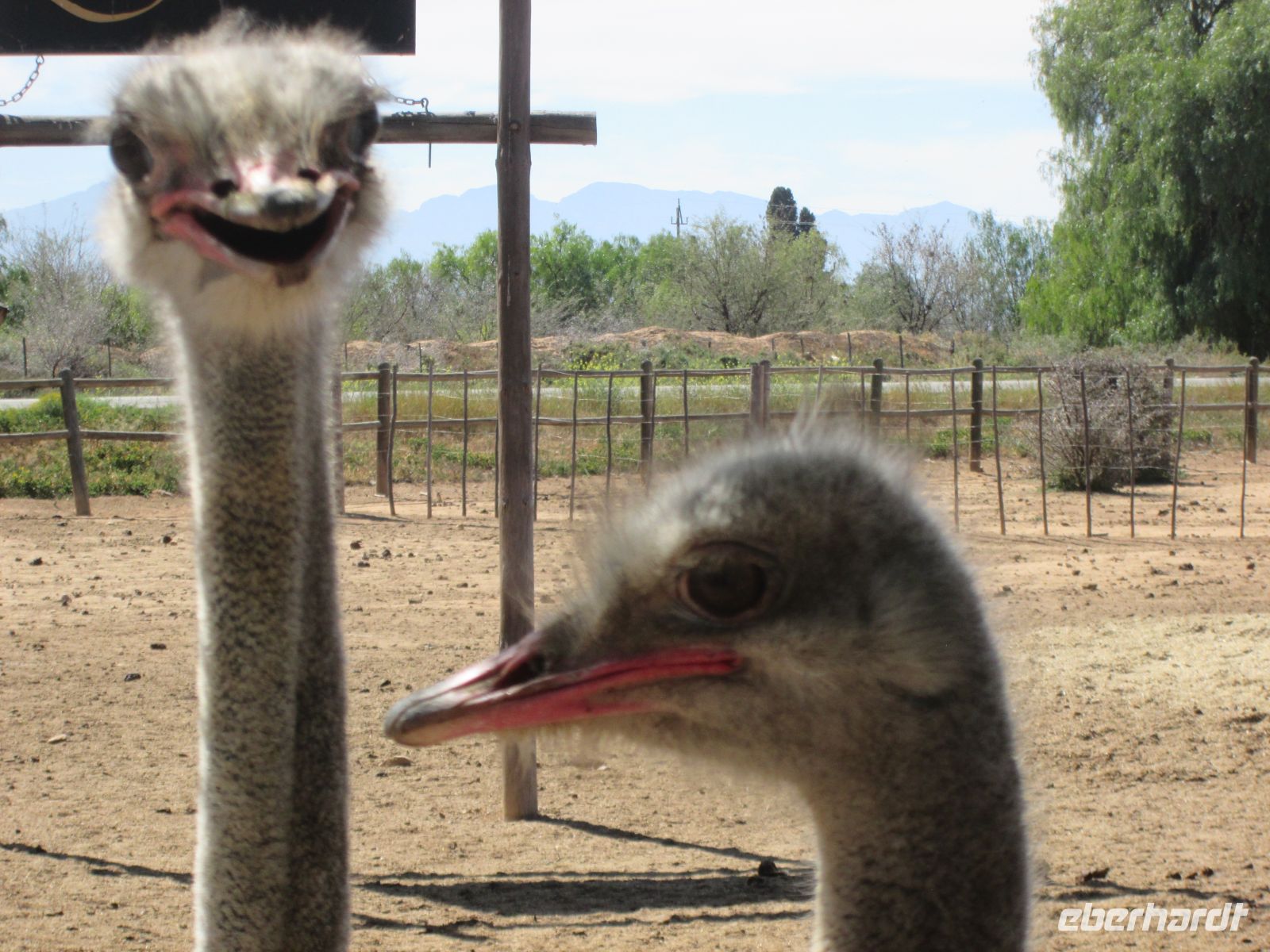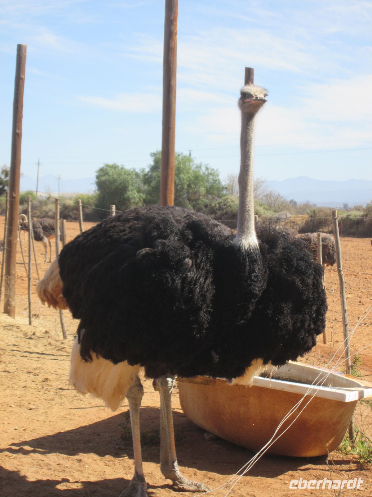 Riaan, der Besitzer der Lodge, begrüßte uns mit einem Gläschen Sekt und erklärte das Wichtigste. Für uns war erst einmal das Kennenlernen und Fotografieren der Anlage mit den kleinen Cottages und den vielen Straußen wichtiger, als der Zimmerbezug. Riaan ist seit 11 Jahren Manager dieser Anlage. Umgebaut zu einem Hotel wurde es vor 21 Jahren. Einst war es eine Farm.