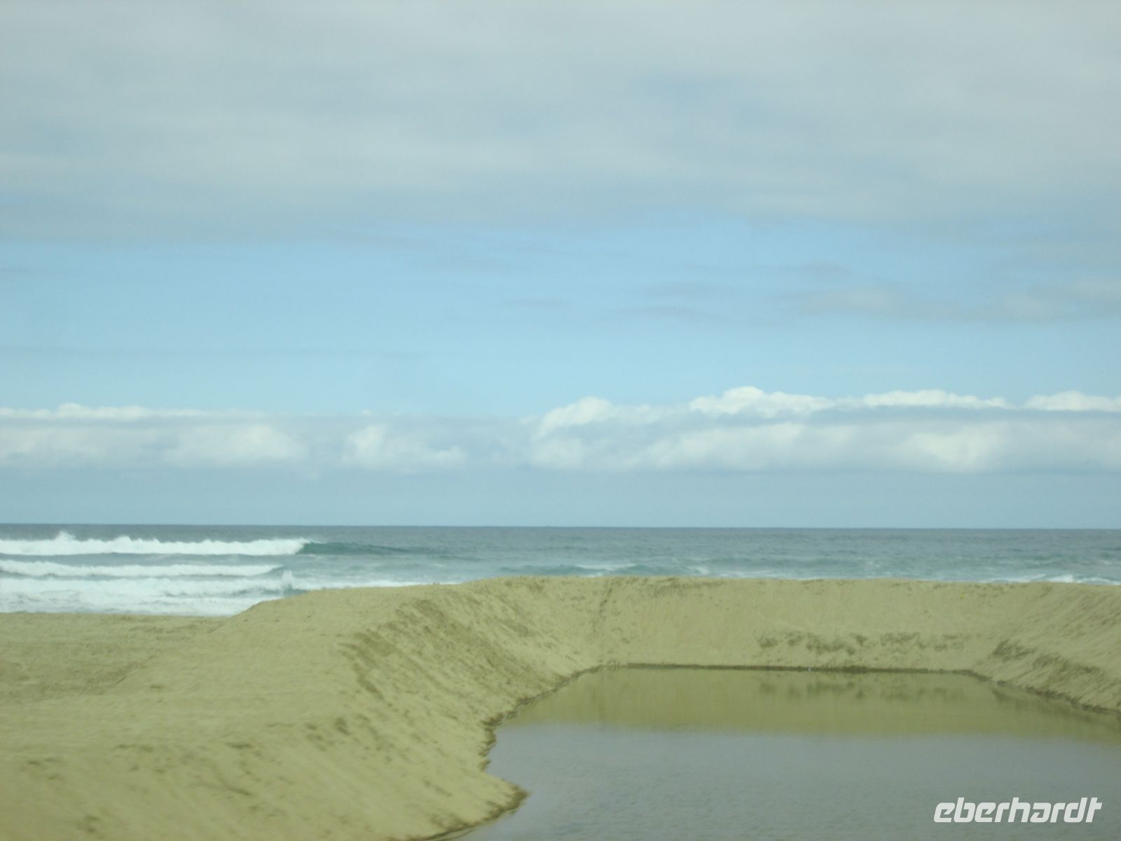 Über einen Holzsteg gelangt man zum Strand, an dem man die Tiere in einer geschützten Umgebung beobachten kann. Auf den dortigen Infotafeln konnte man nachlesen, dass man 1982 2 Pärchen ausgesetzt hatte, diese sich anscheinend sehr wohl fühlten, denn heute soll es über 2500 Pinguine dort geben.
