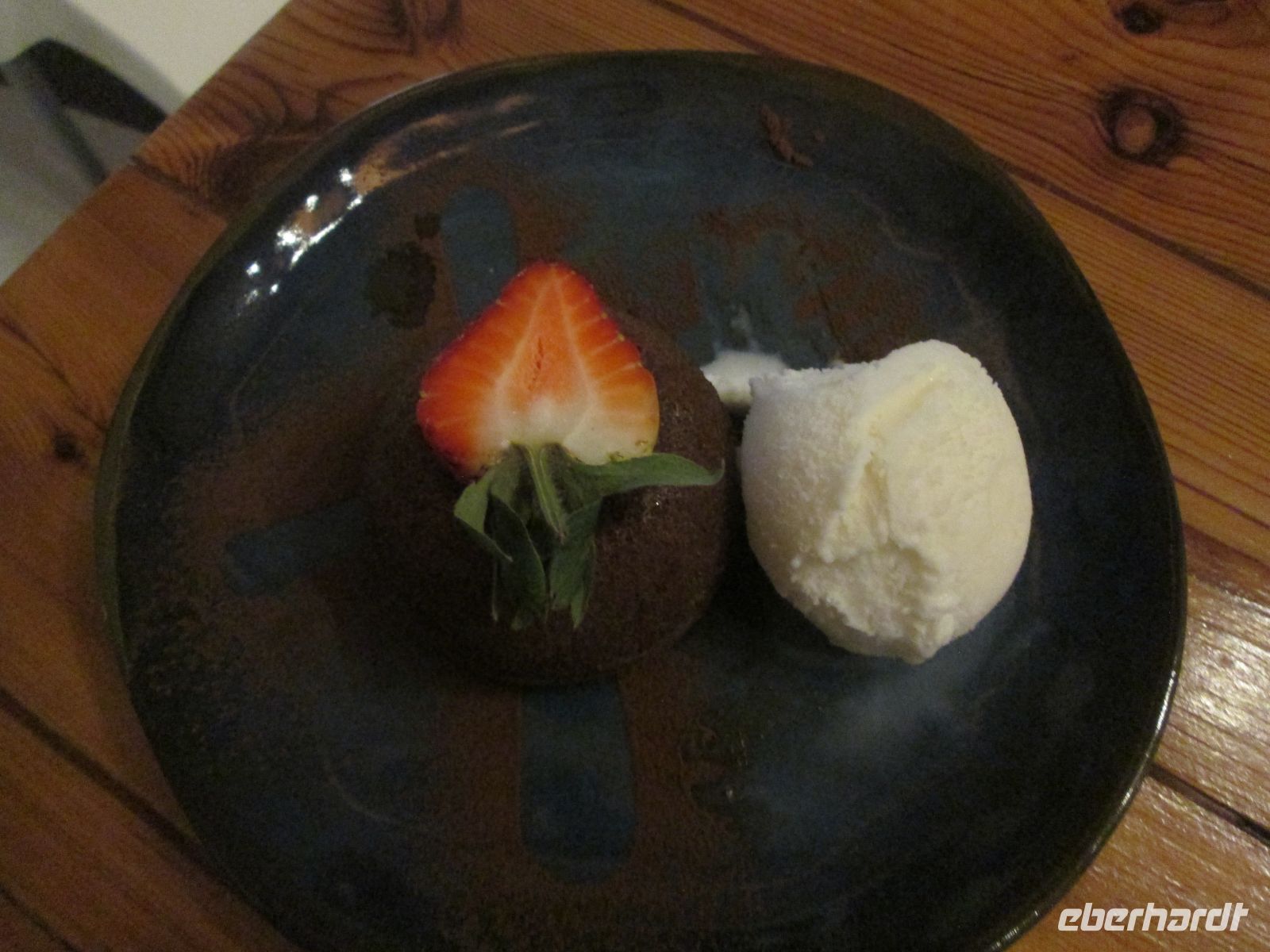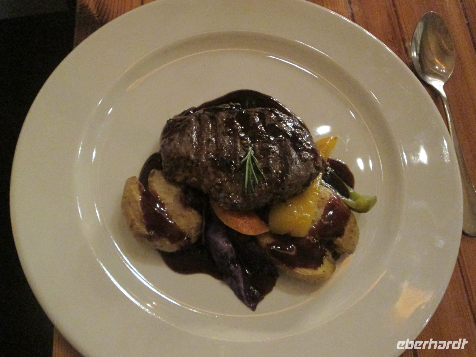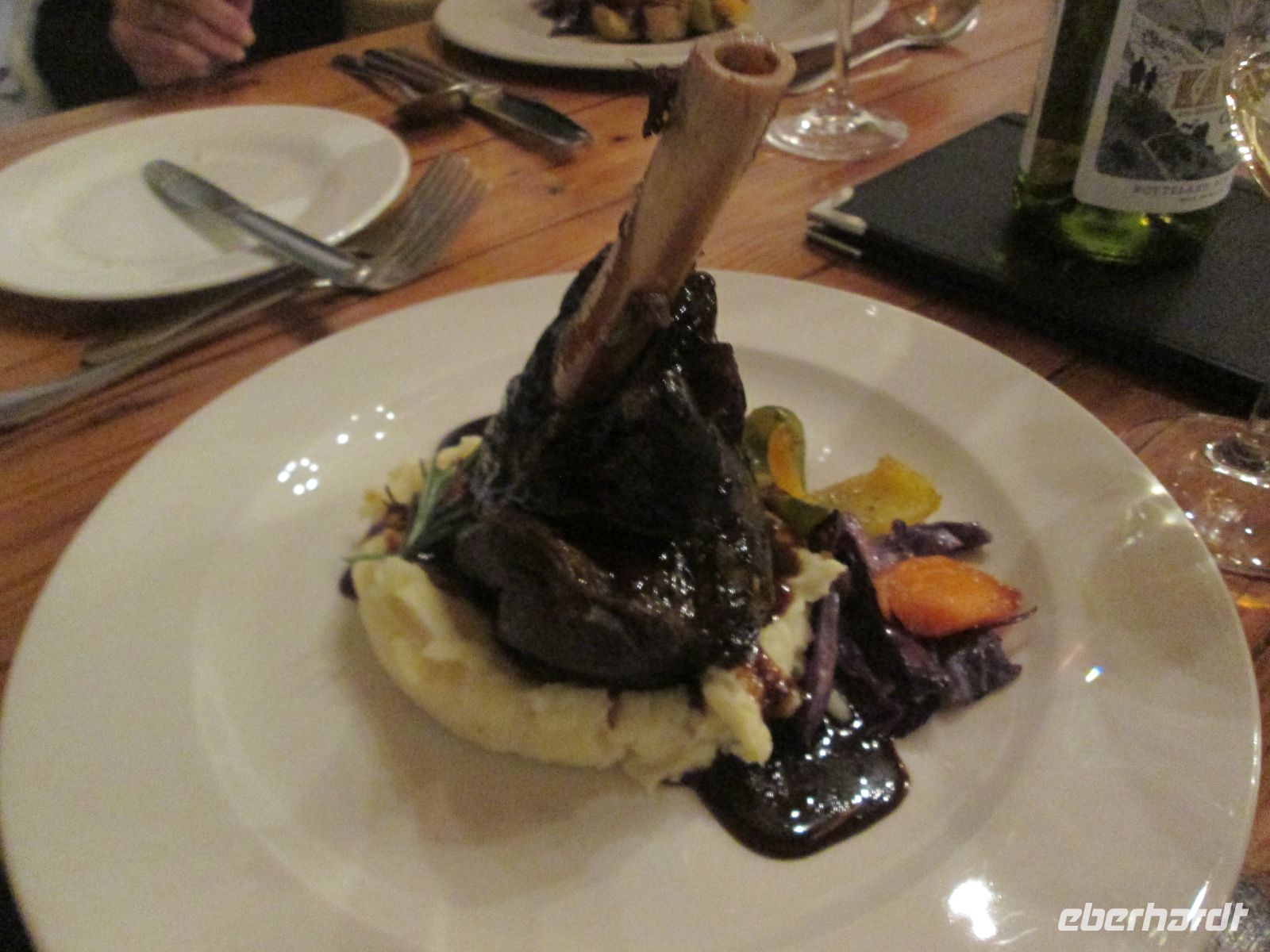 Zum Abendessen wurden wir wahlweise mit Straußen-oder Rinderfilet oder Lammhaxe verwöhnt. Es war lecker !