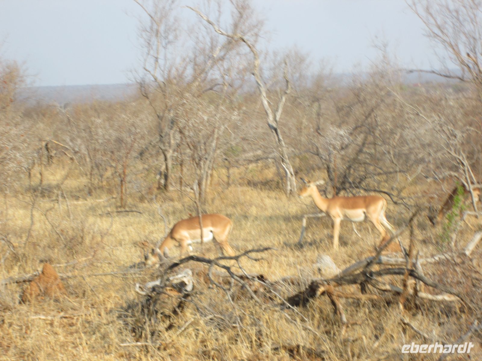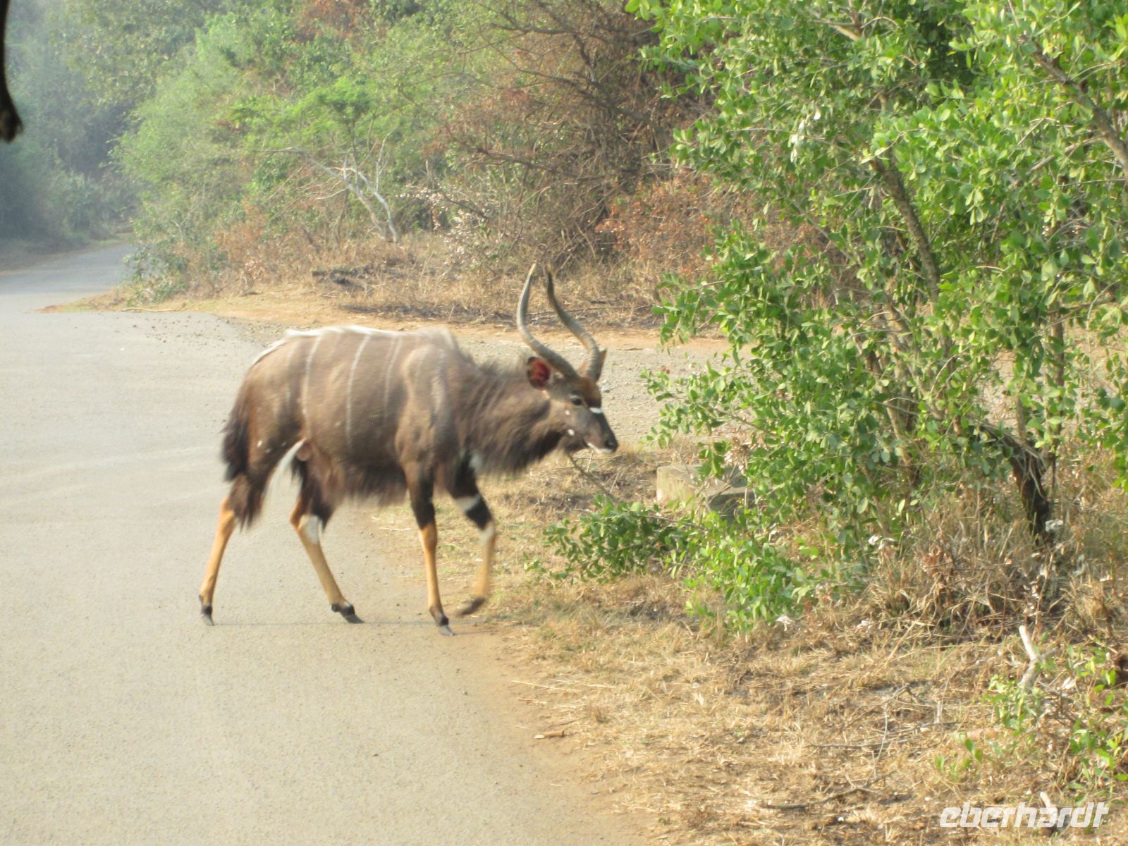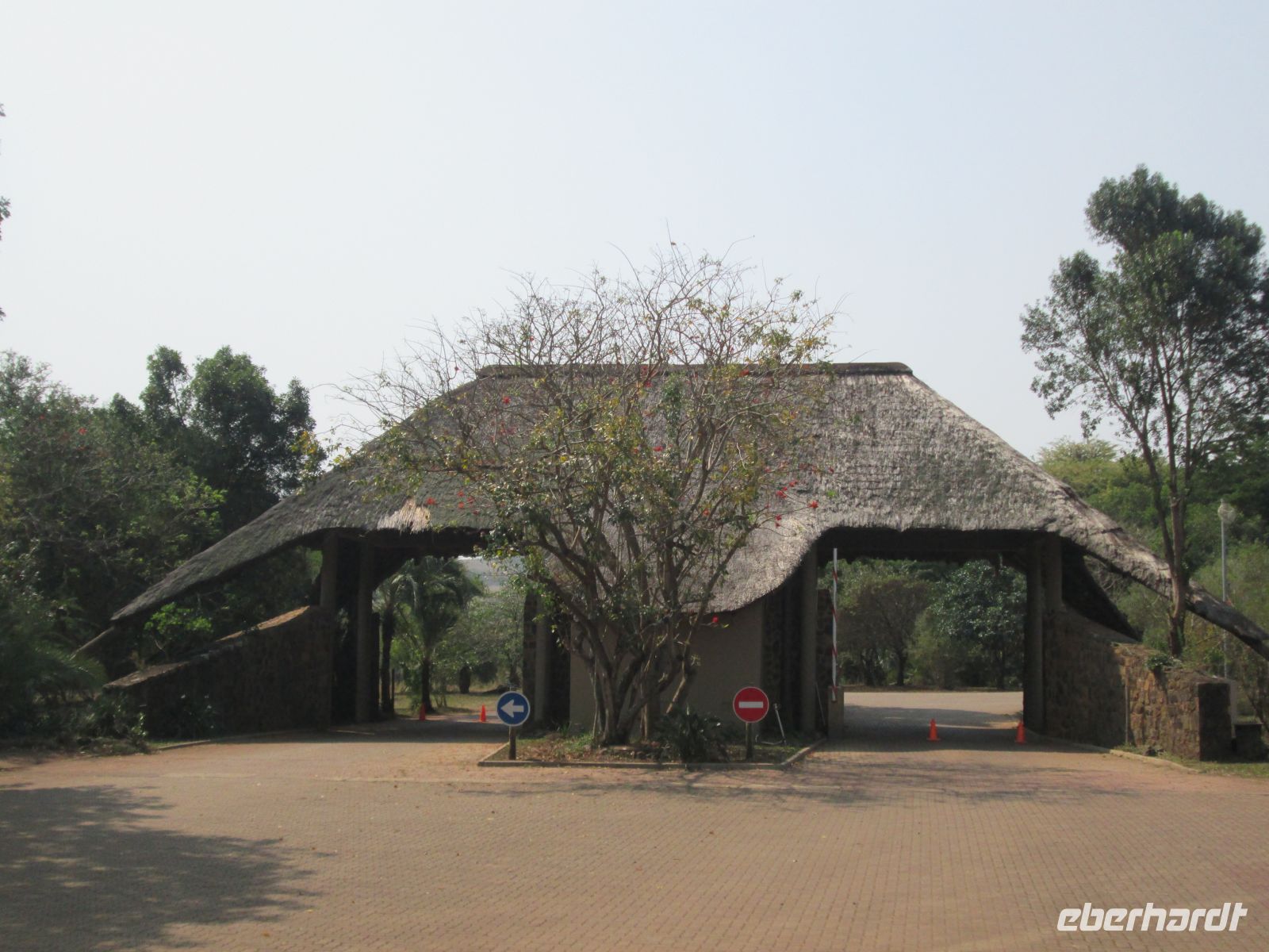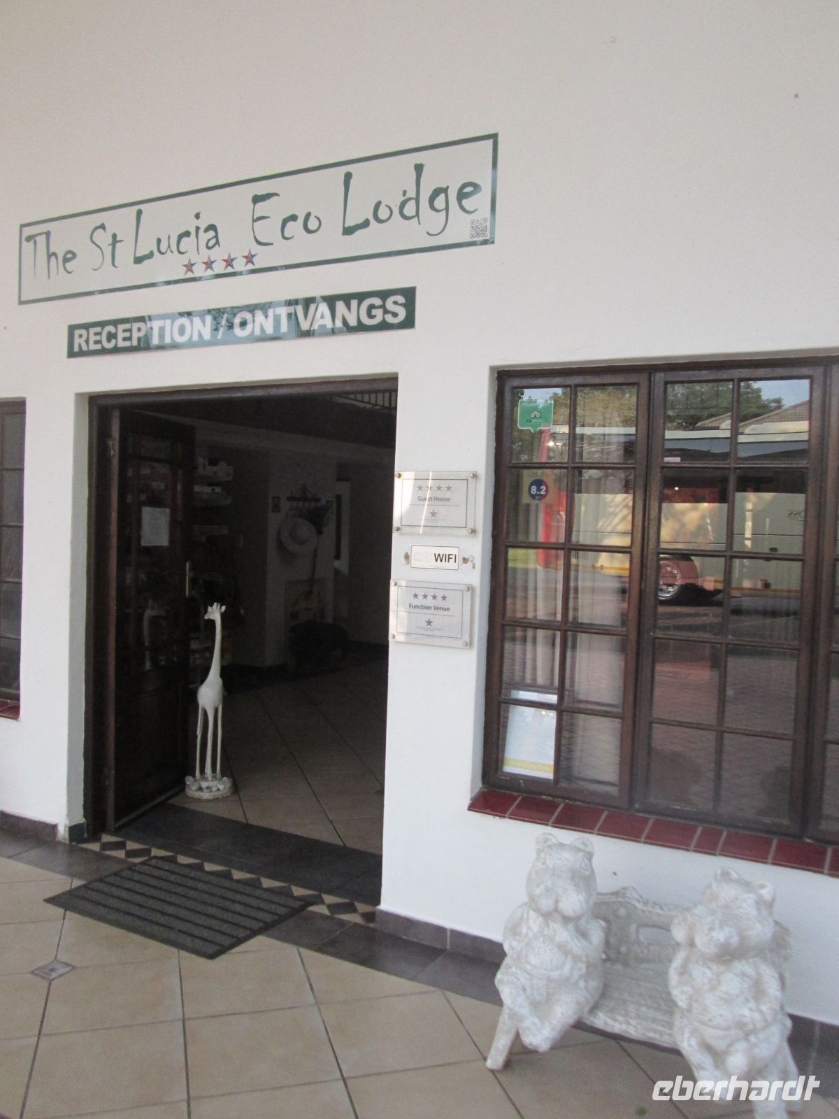 Mit dem Manager der Lodge ging es zwischen dem Eingangsportal, wo unser Bus aufgrund seiner Größe parken musste, per Pickup durch kurvenreiches Gelände zum Haupthaus, von dem man nochmals einen Teil des St. Lucia Sees sehen konnte. Impalas kamen extra, um uns zu begrüßen und die Affen sorgten aufgrund ihrer Spielchen für unsere Erheiterung. Ein gutes Abendessen mit z.B. Kudu-Fleisch rundete den Abend ab, bevor sich jeder in sein Häuschen zurückzog.