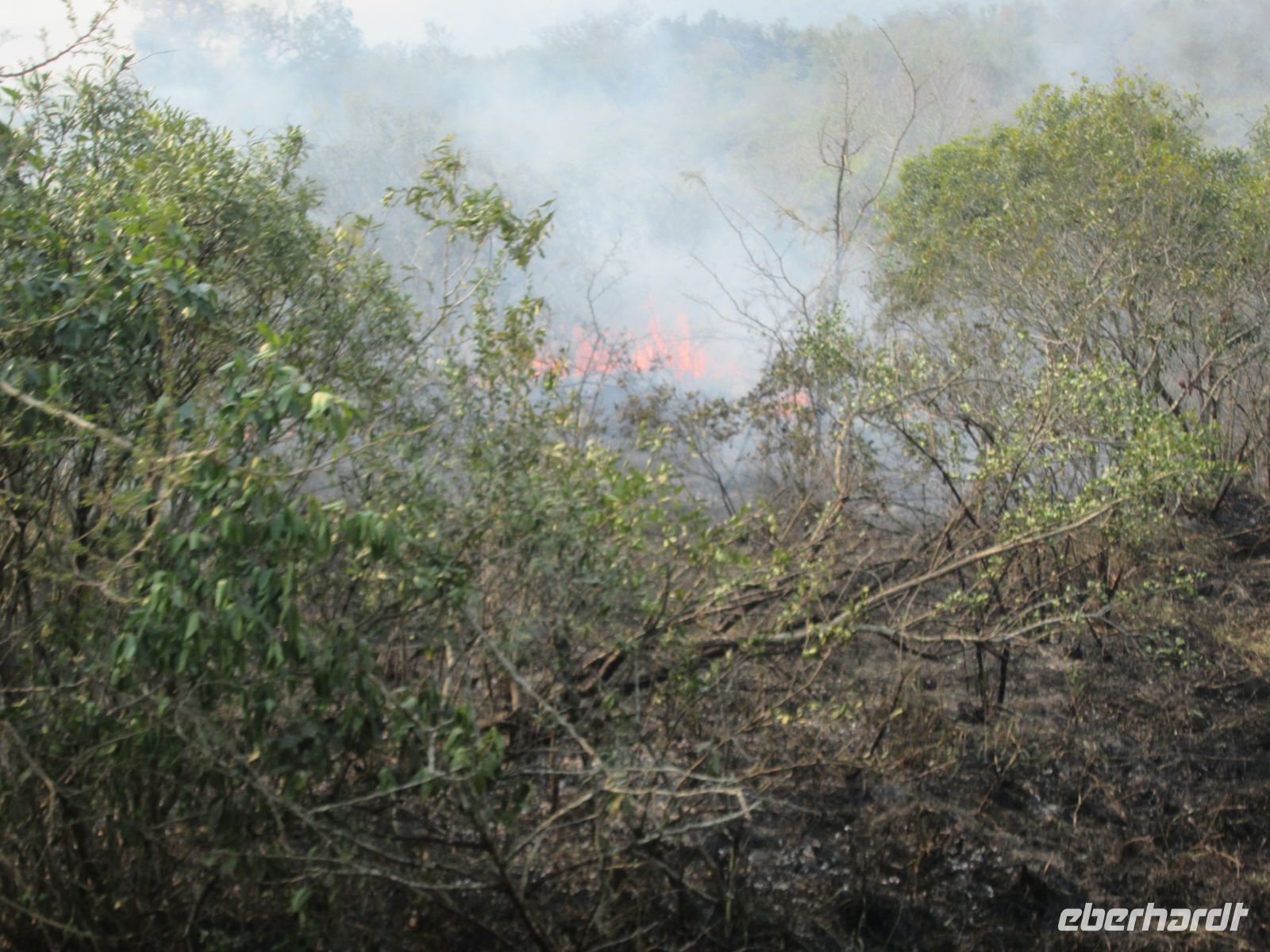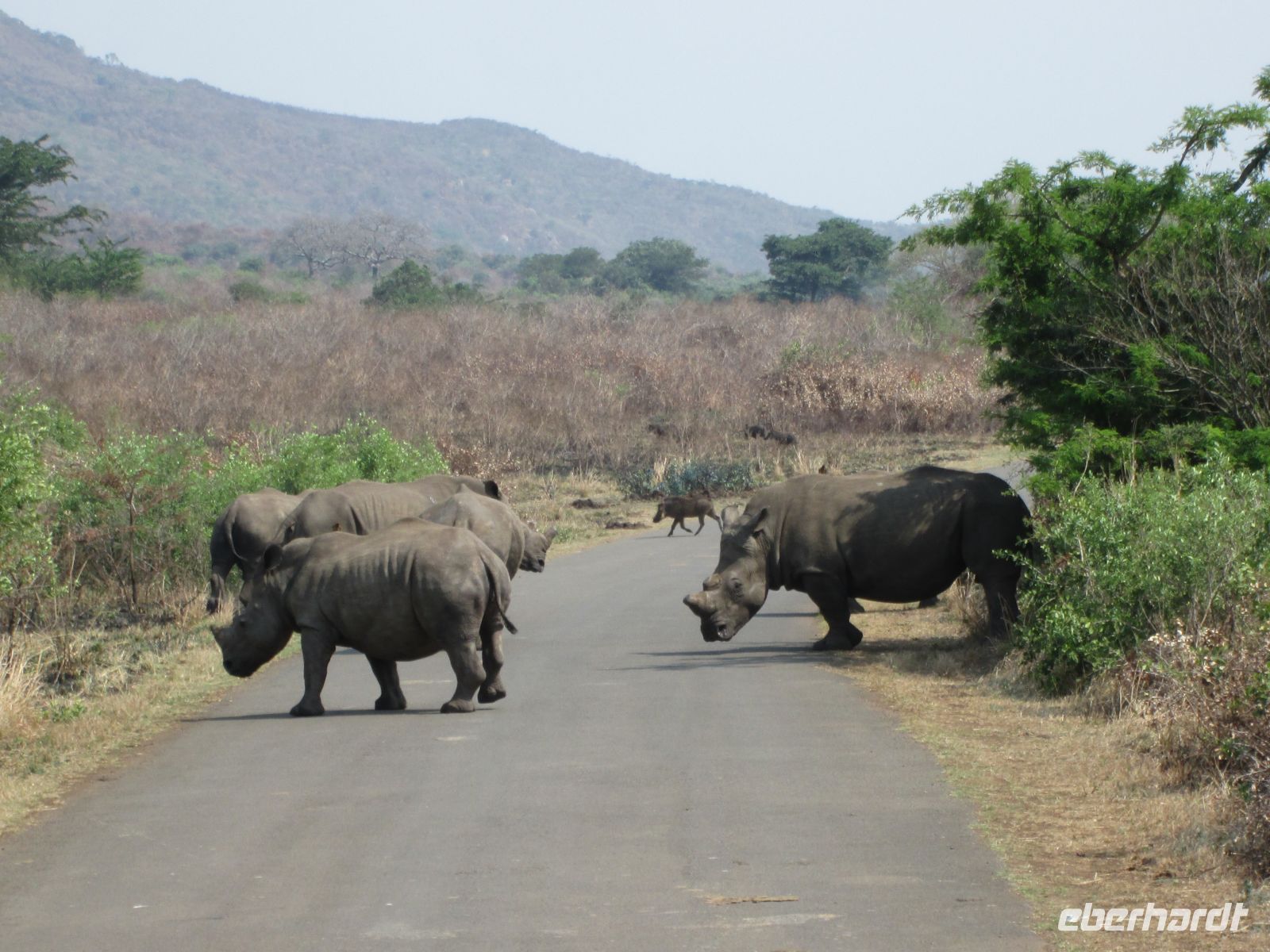 Tiere sollten auch am Nachmittag eine Rolle spielen. Wir fuhren in den Hluhluwe/Imfolosi Nationalpark. Er bedeckt eine Fläche von 960 qkm. Am Memorial Gate stiegen wir auf 2 Jeeps um, und mit Simo und Mthokozisi ging es auf auf eine Safari. Wir hatten gleich kurz nach dem Nationalpark-Tor richtig viel Glück: Nashörner kreuzten unseren Weg. Von jeder Seite konnten viele Fotos gemacht werden. Je weiter wir in den Park hineinkamen, desto dichter wurden allerdings Rauch und Feuer. Angestellte des Nationalparks hatten im Auftrag der Verwaltung Feuer zum Abbrennen des Buschlandes legen sollen. Aber durch starken Wind breitete sich das Feuer nun unkontrolliert dort aus, wo es nicht erwünscht war. An eine Weiterfahrt oder gar einer Sichtung von Tieren war nicht mehr zu denken. So entschlossen wir uns, zum Eingangstor auf der Hauptroute zurückzukehren. Einige Impalas und Warzenschweine kreuzten noch unseren Weg.