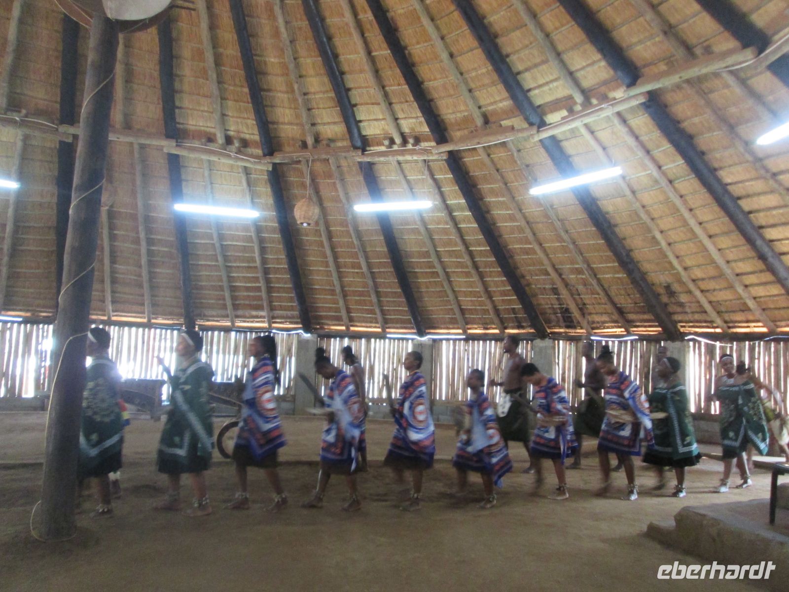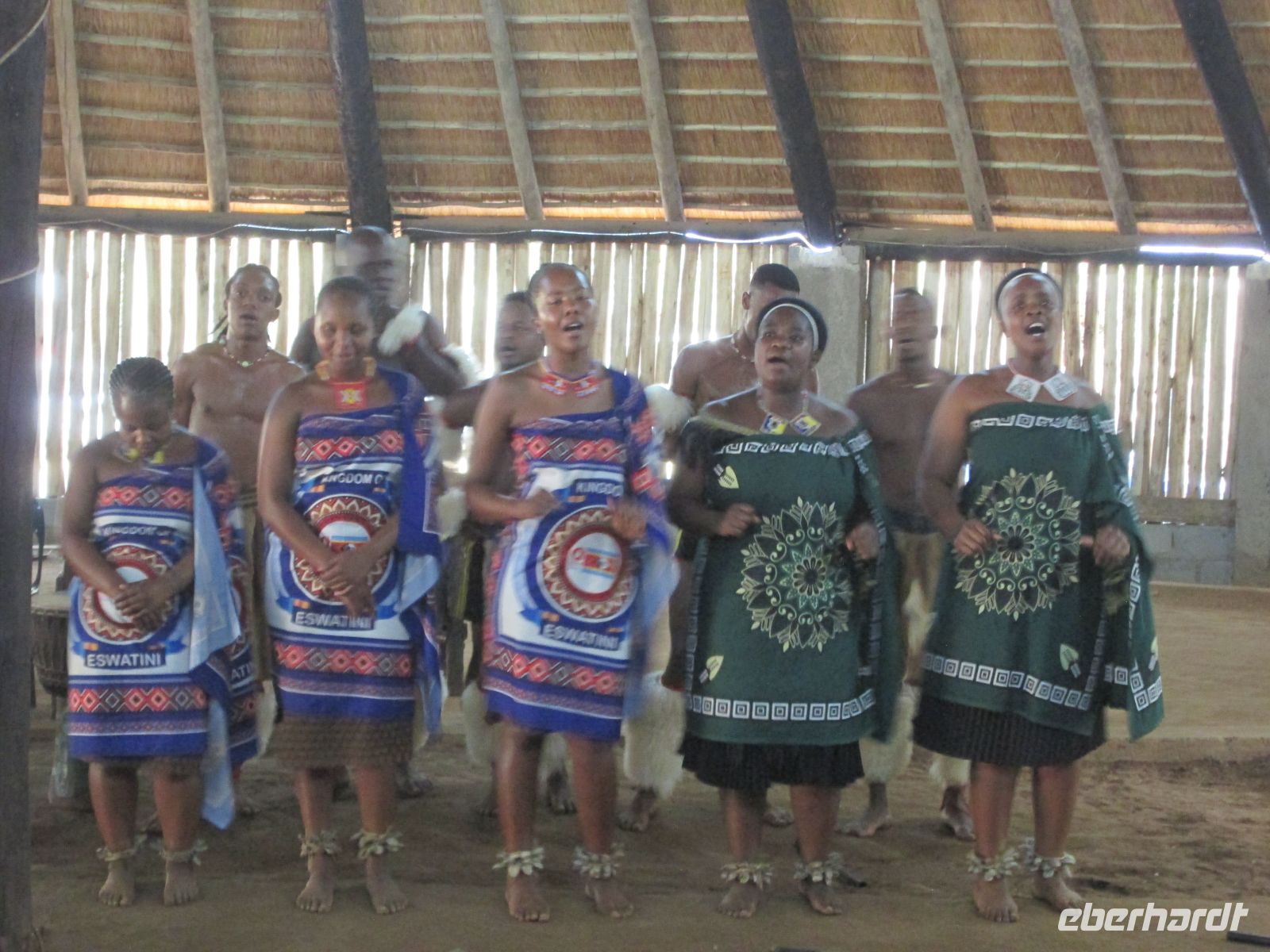 Eswatini, früher das Swasiland, ist ein sehr kleines Land mit nur etwa 17000 qkm. Es handelt sich um ein Königreich mit dem derzeitigen König Mswati III. Im Süden bei Golela sind wir nach der Passkontrolle in das Land eingefahren, im Norden verließen wir es am Folgetag. Überall waren Müll, ärmliche Behausungen, provisorische Straßen-Verkaufsstände zu sehen. Die Swasi zählen zu den ärmsten Völkern Afrikas. Doch dies konnte man bei einer Gesangs-und Tanzveranstaltung im Mantenga Cultural Village überhaupt nicht erkennen. Voller Stolz, in ihren Trachten, sehr bunt, lautstark und immer lächelnd präsentierten sie uns und einer Schülergruppe, die noch zusätzlich für den entsprechenden Geräuschpegel sorgte, was in ihnen steckt.